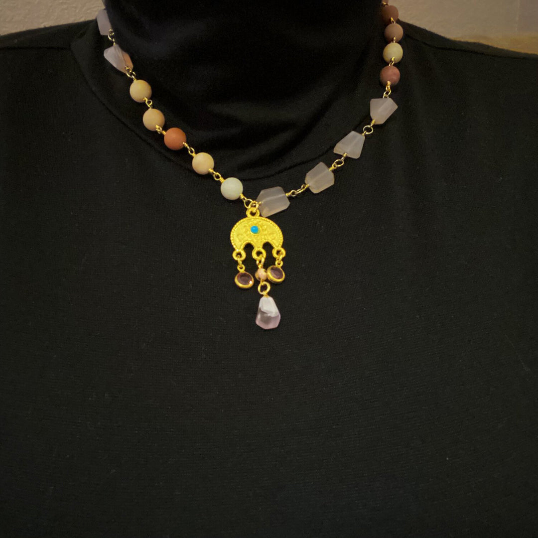 Pink: Moonstone frosted round beads gold plated wire wrapping, Pink square shaped stones with gold plated wire wrapping, Kurdish sarpacham charm with pink/brass stone round charms, mini pink evil eye charm, dusty pink pomegranate charm, 18k gold plated brass hardware. 15inch chain with extension.
