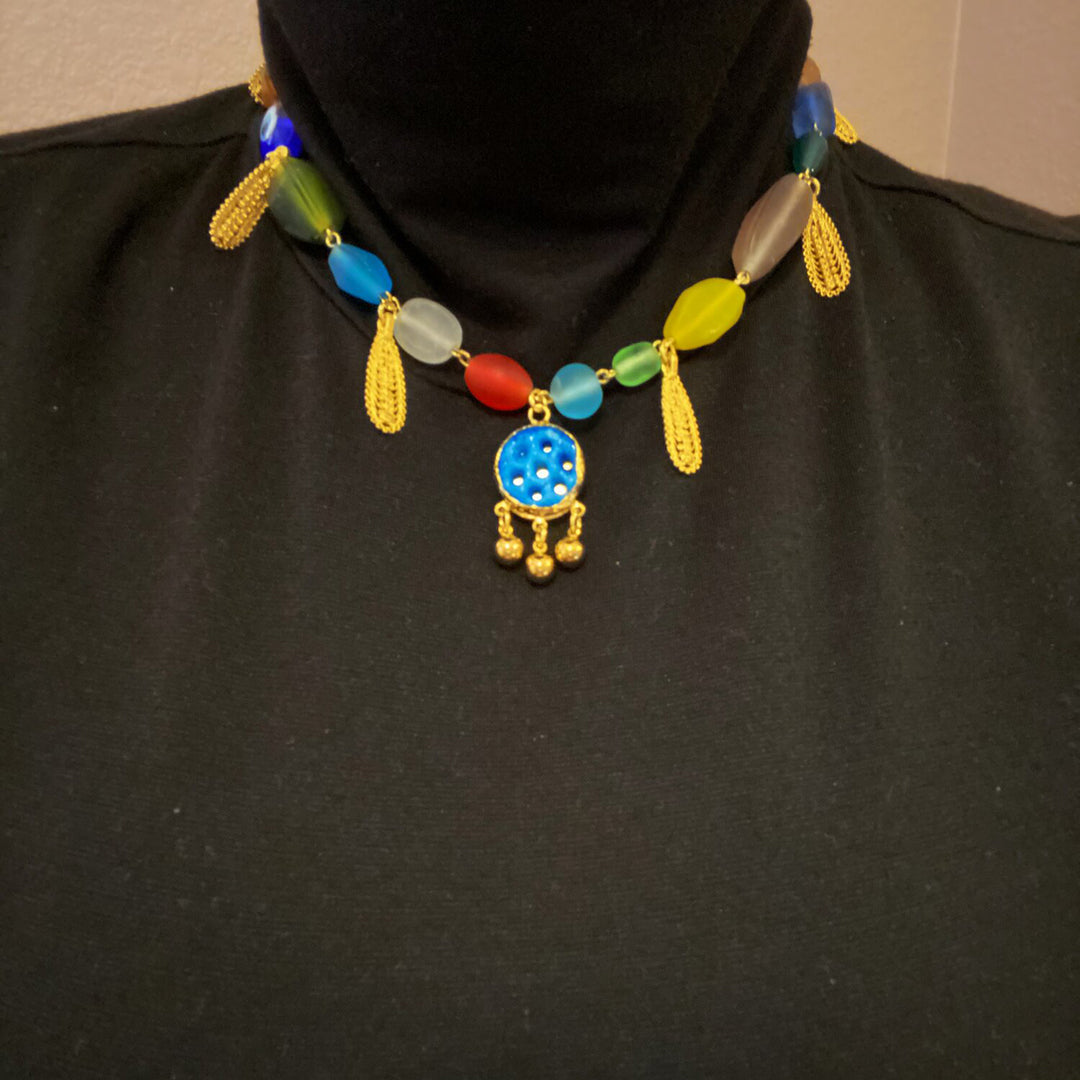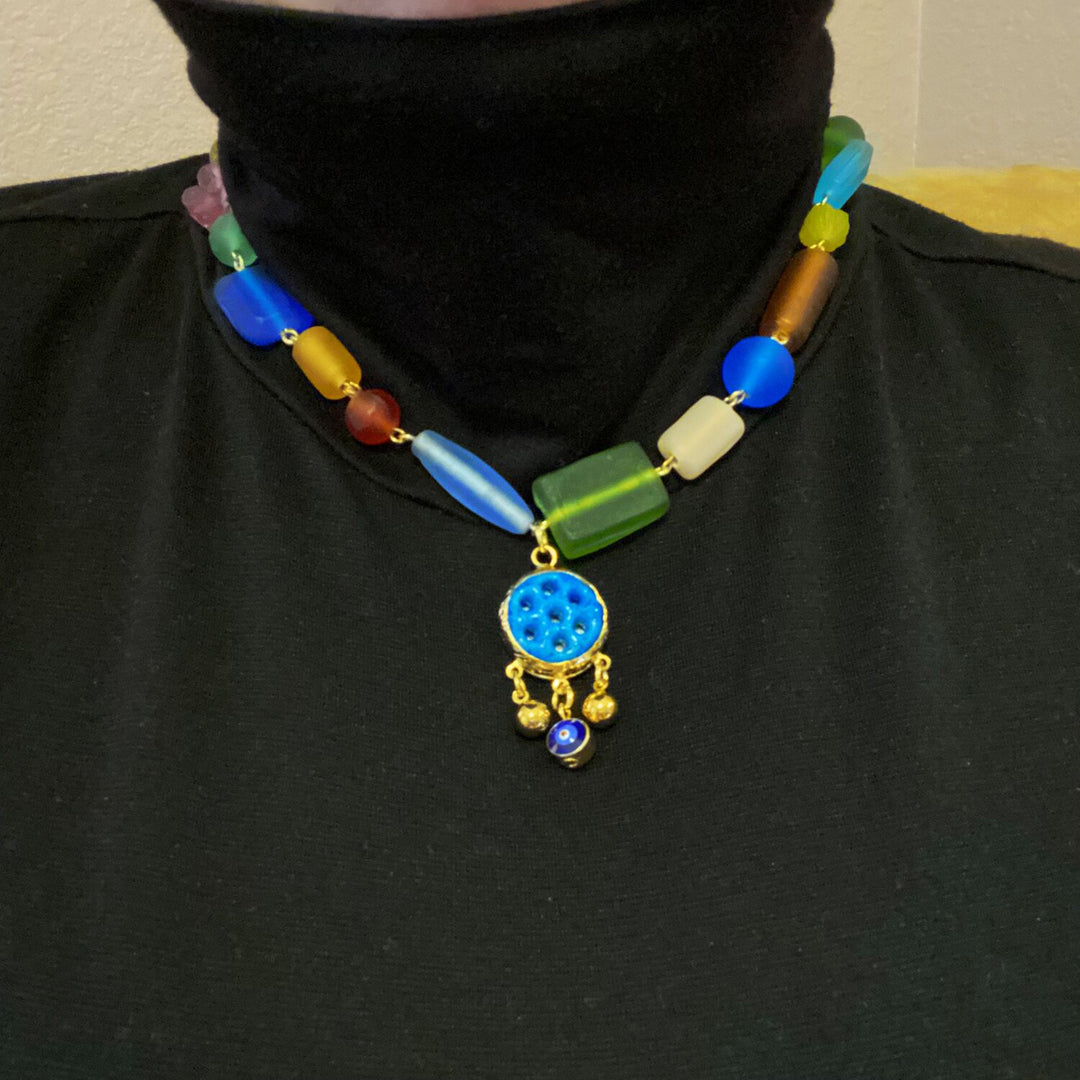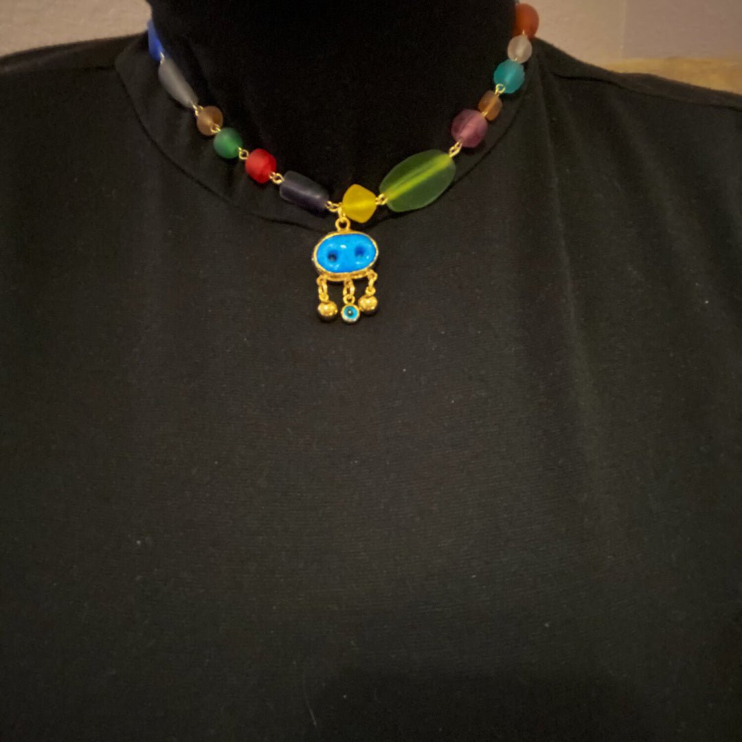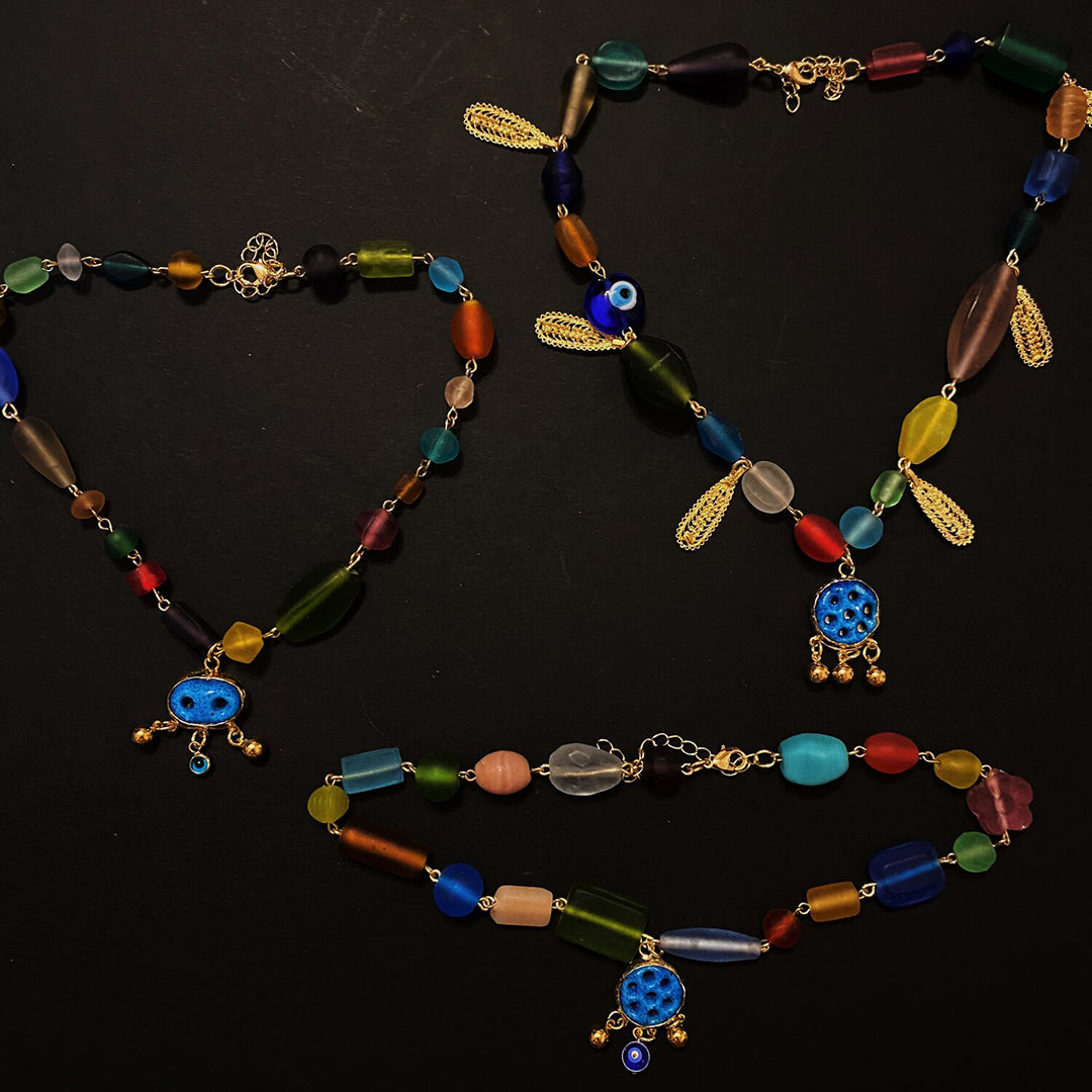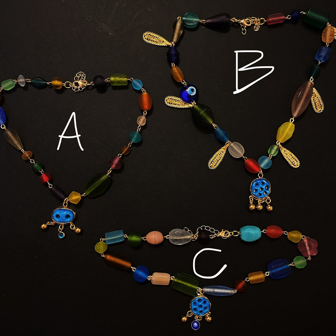All contain 18k gold plated brass hardware and sea glass stones in assorted colors and shapes, and gold plated kuzhaka evil eye bead from Kurdistan. Style A and C (see second photo) each have an evil eye attached to the kuzhaka charm. Style B has matte gold fan style charms all around and a glass evil eye bead.