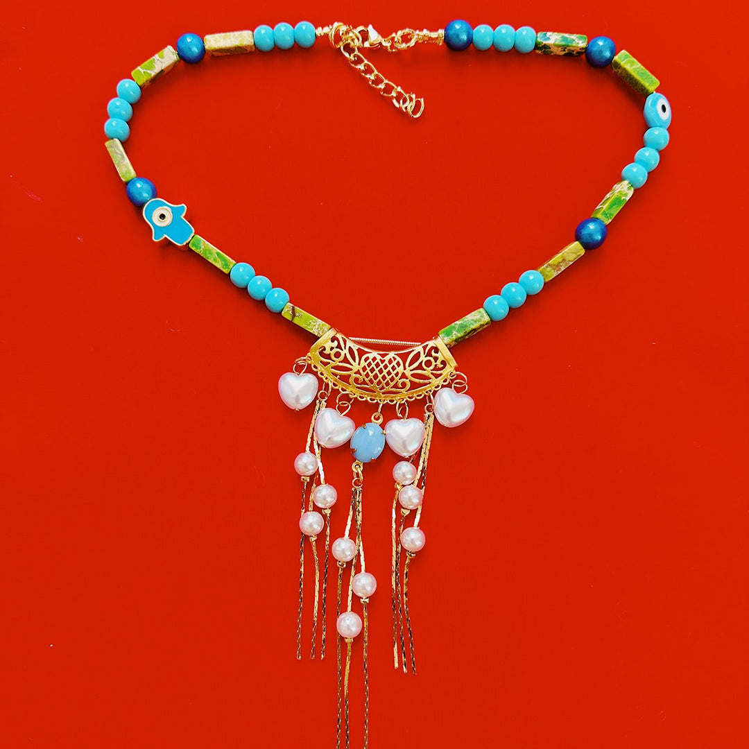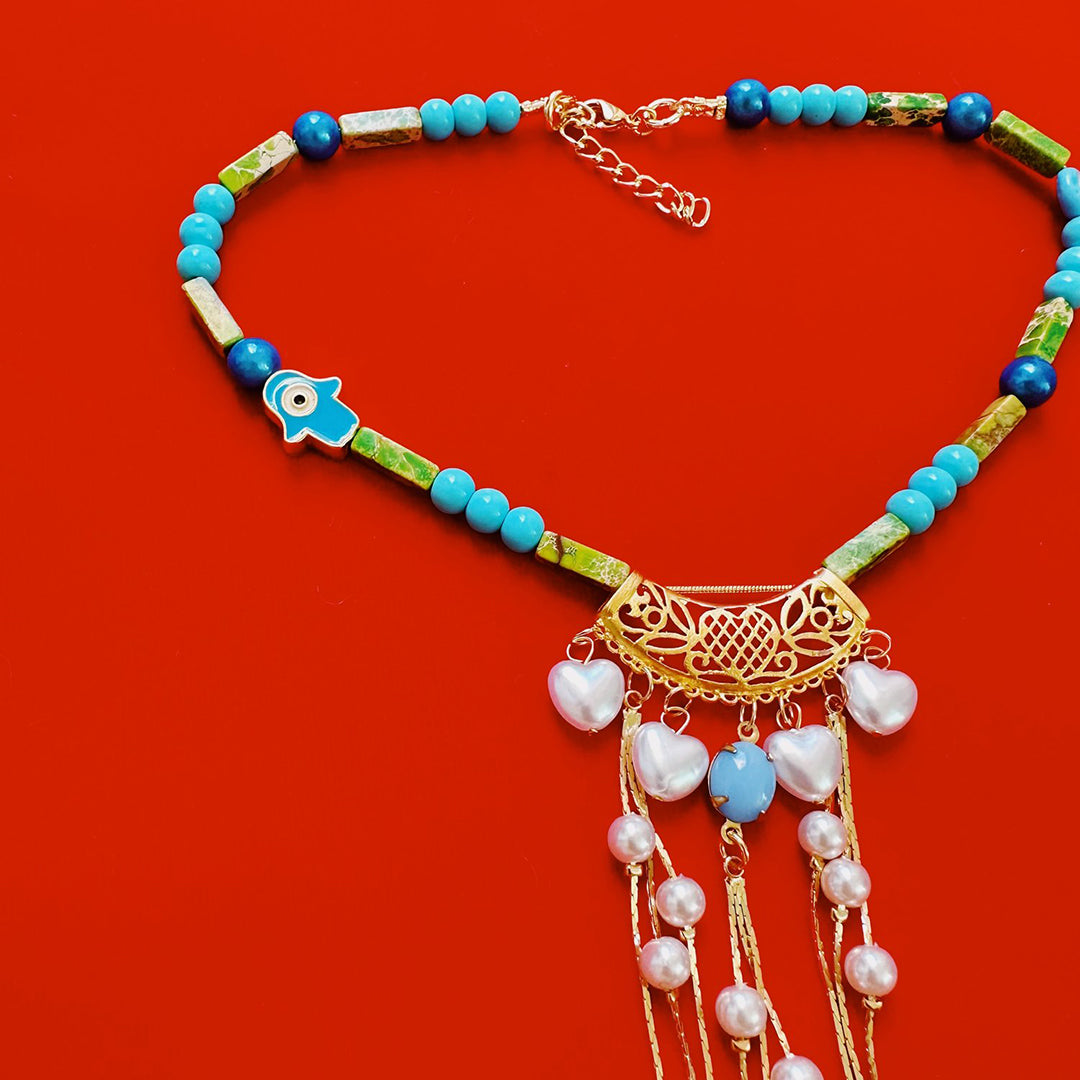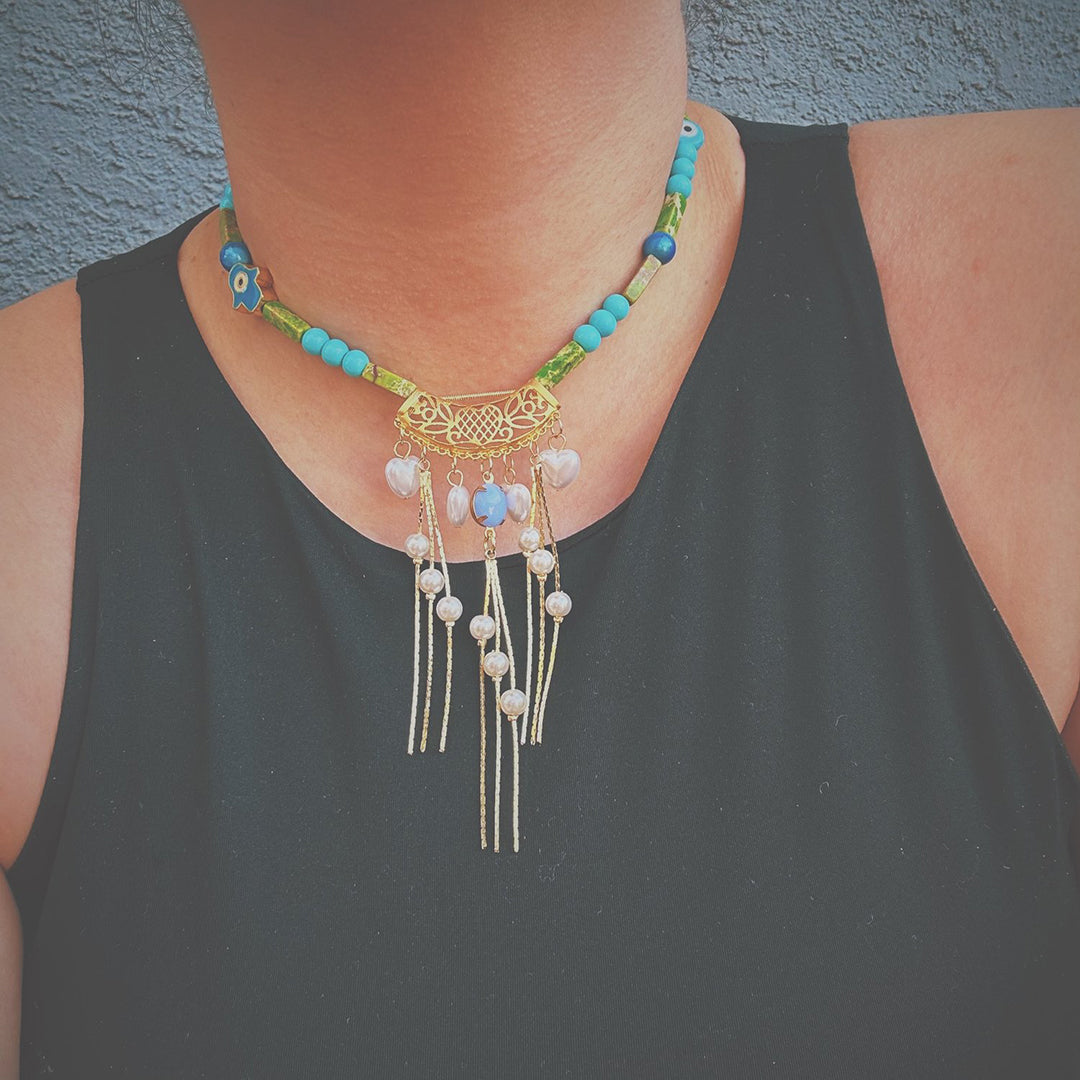 Assorted turquoise and lime green beads, gold plated Hamsa charm, gold plated pendant, pearl tassel and beading. 13 inches with additional extension.