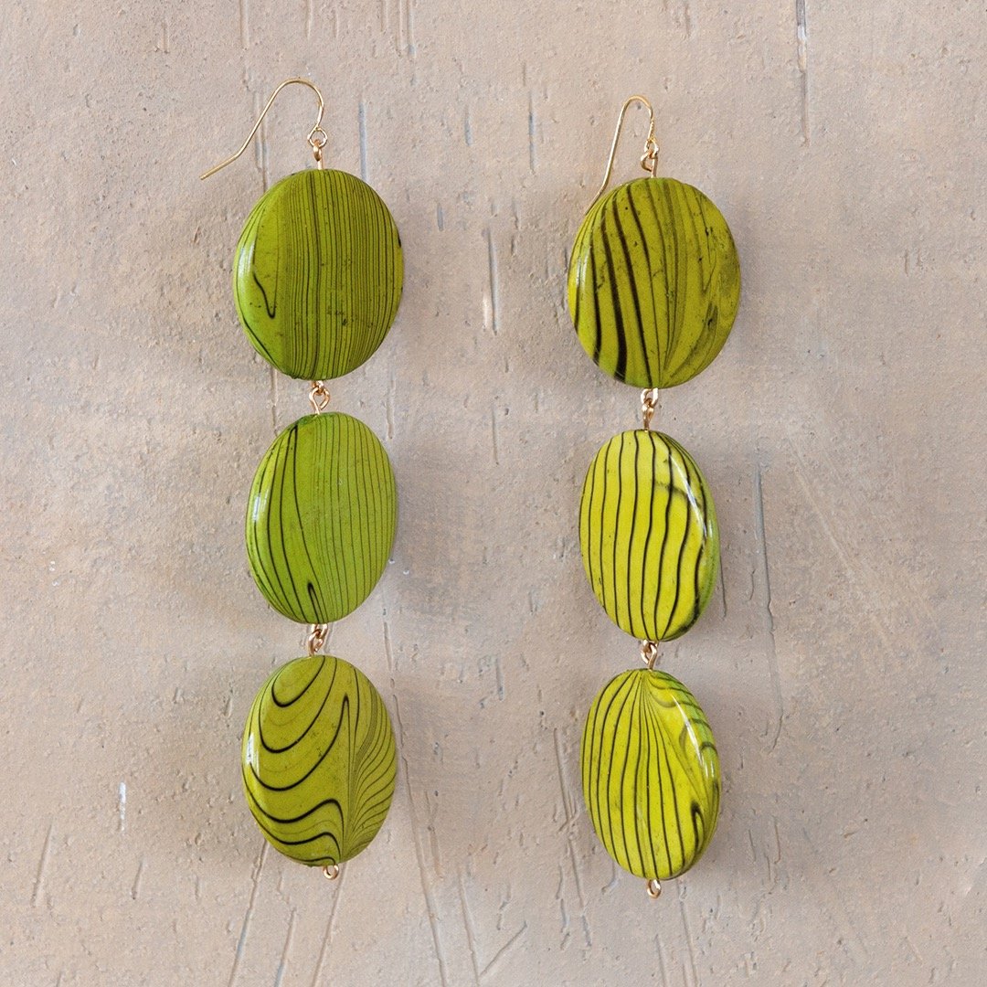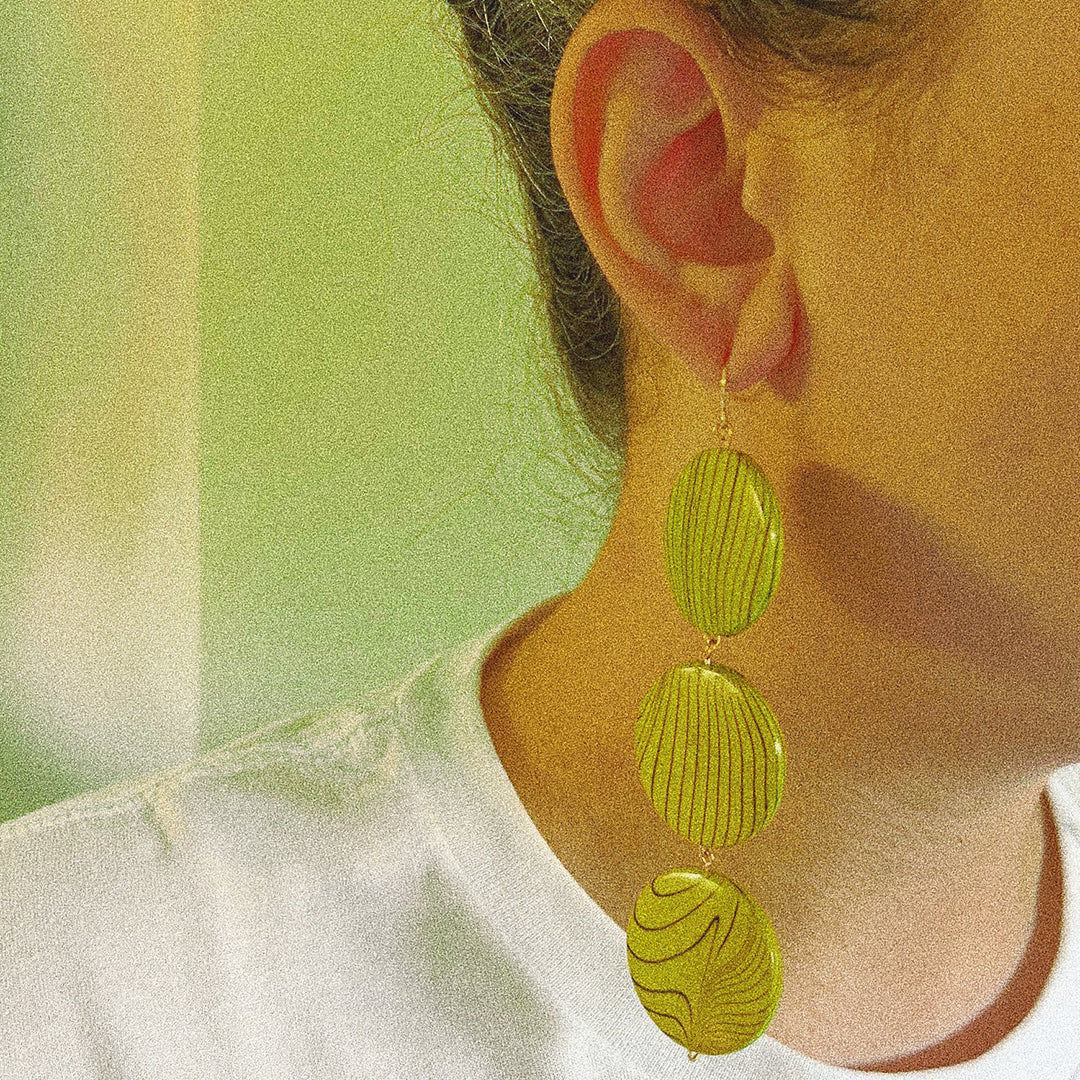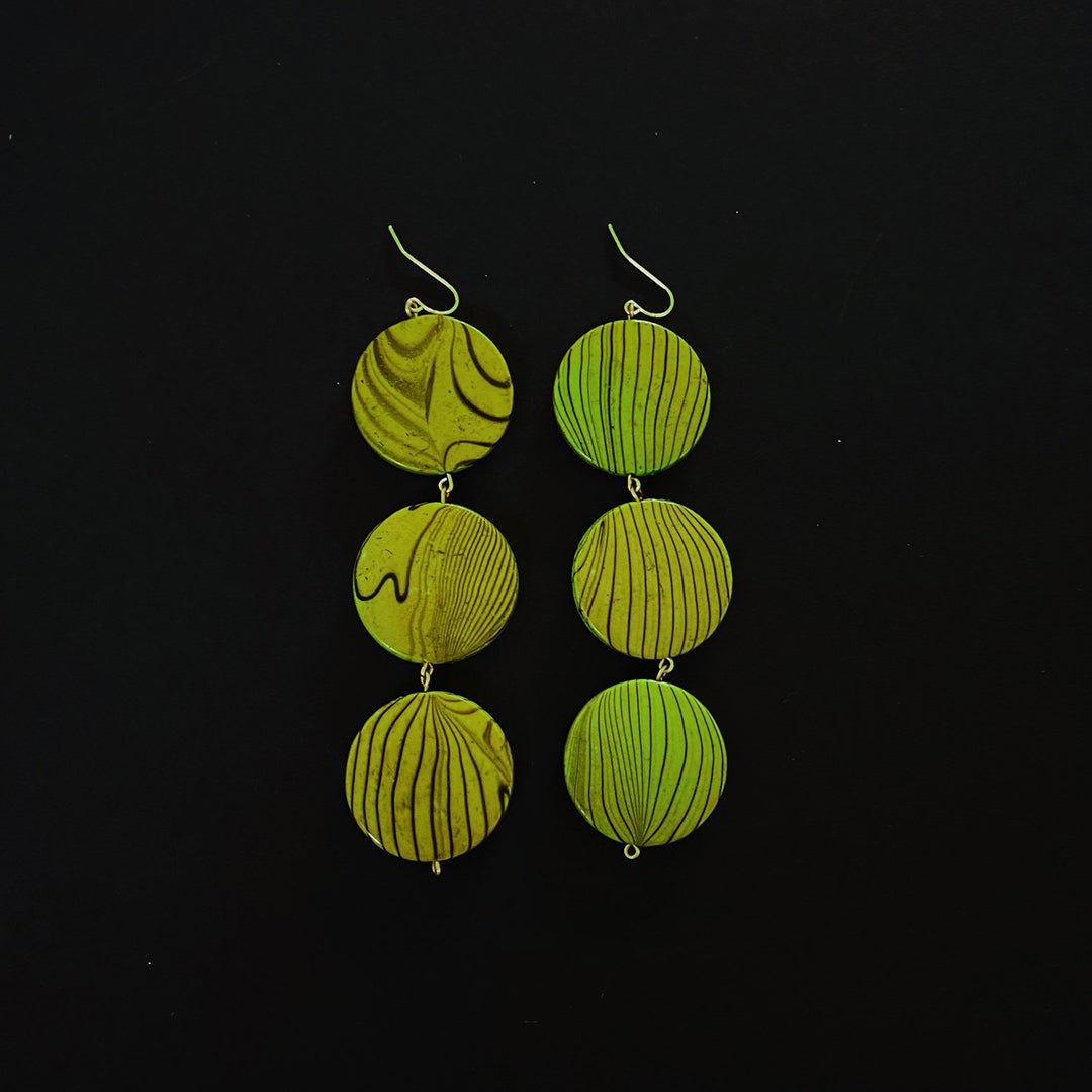 Acrylic lime green-yellow discs, gold plated hardware, pair weighs 0.9 ounces.
