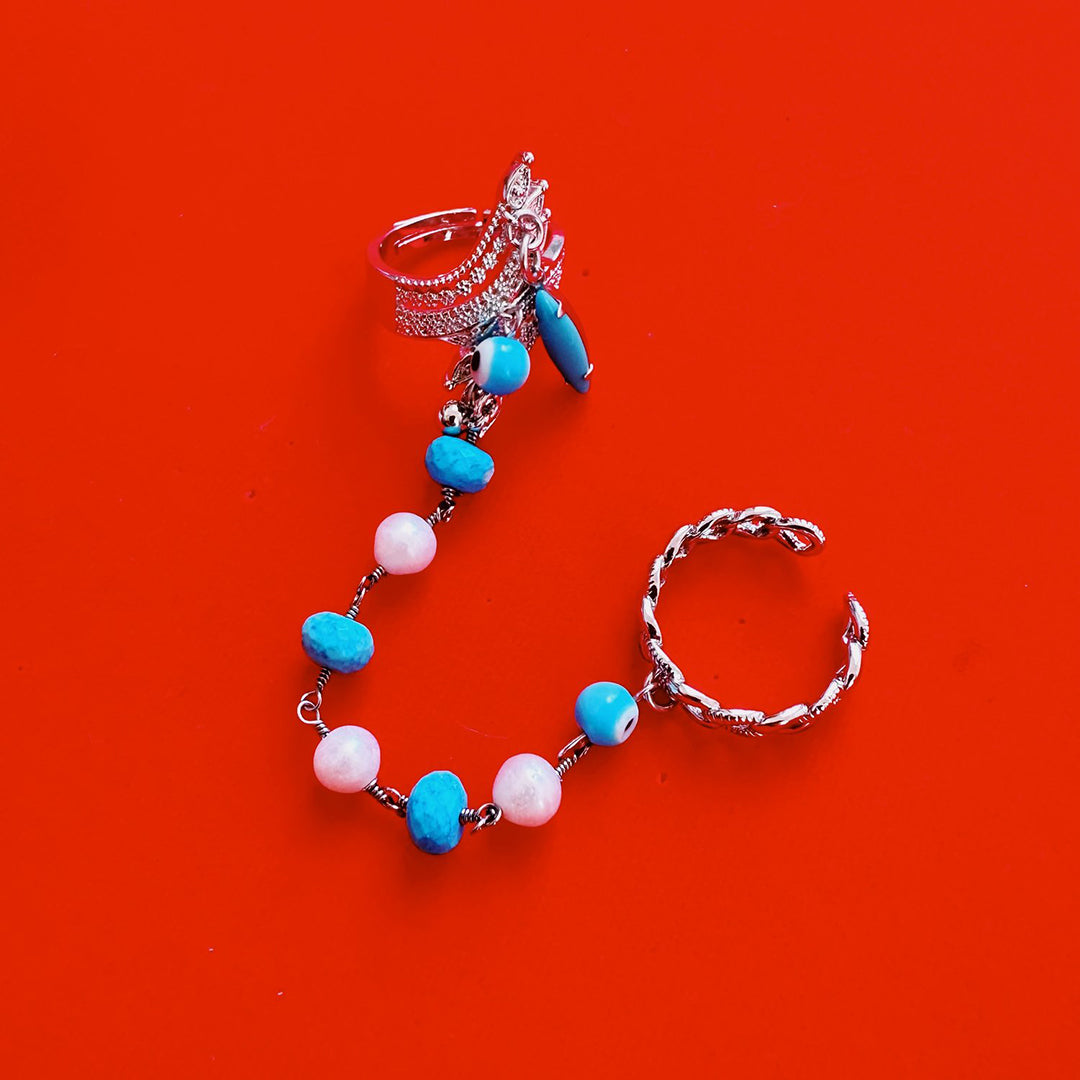Two finger silver ring style, glass eye beads, vintage turquoise set stone, turquoise silver wire wrapped rosary chain style. Both rings are adjustable.