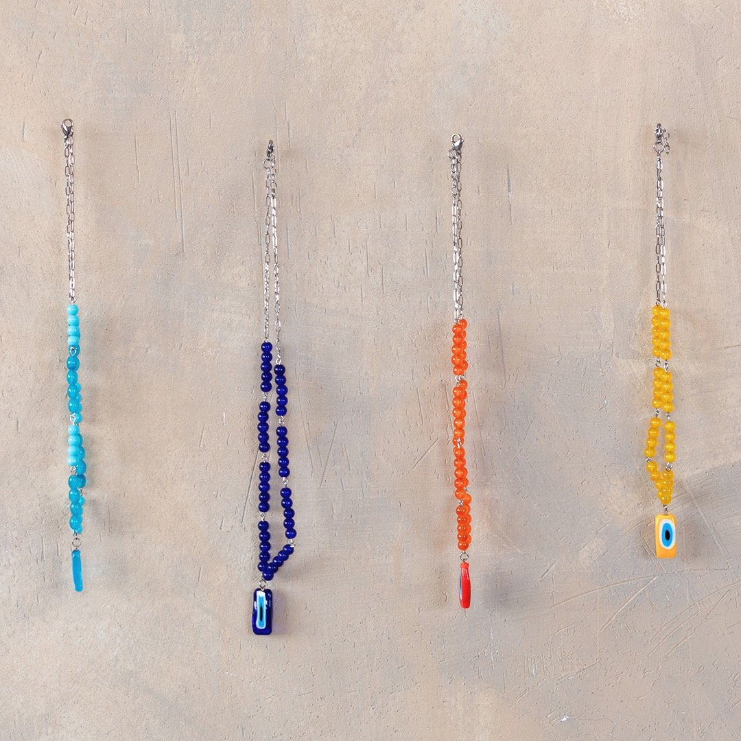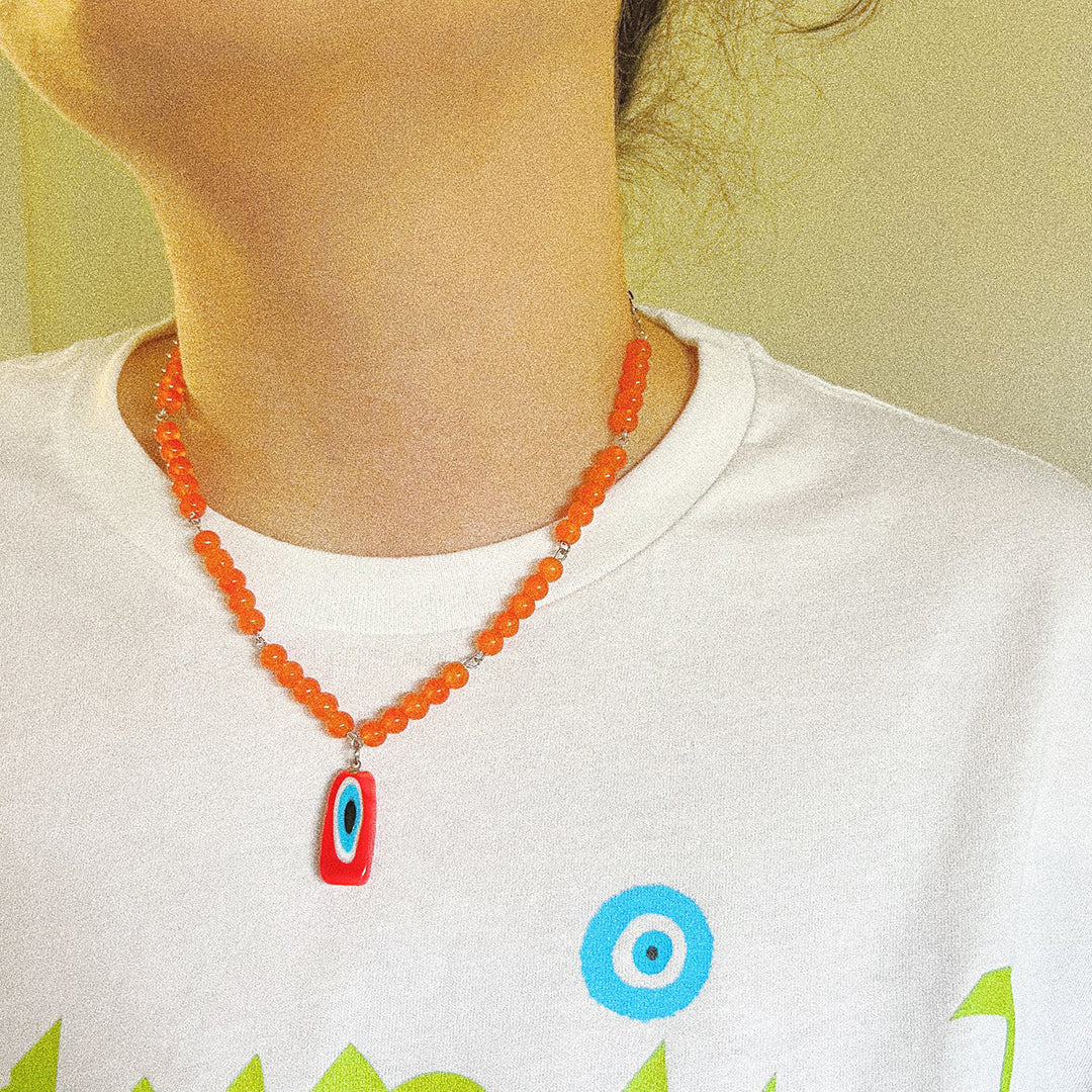17 inch chain with extension, stainless steel chain and hardware/findings, rectangle glass evil eye pendant, glass beads.