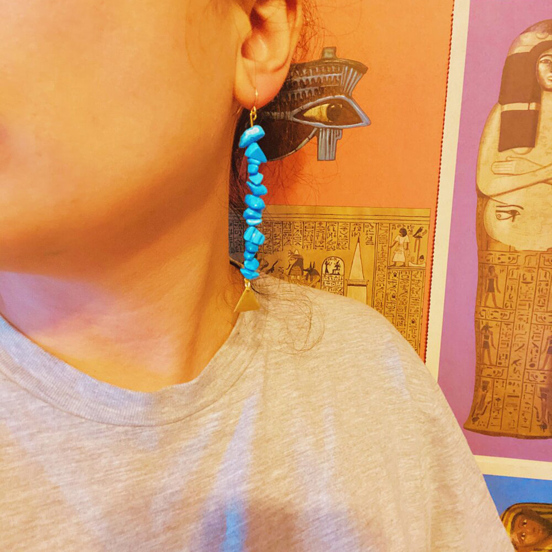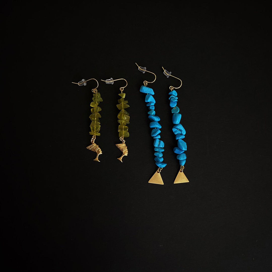 Korean jade with Nefertiti charm, dyed blue howlite with Pyramid charm, 18k gold plated brass hardware.