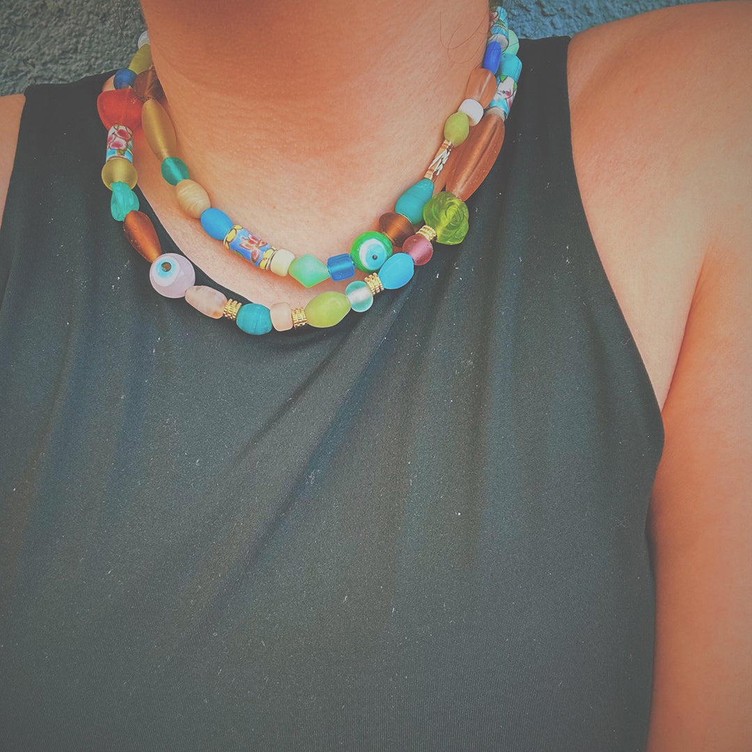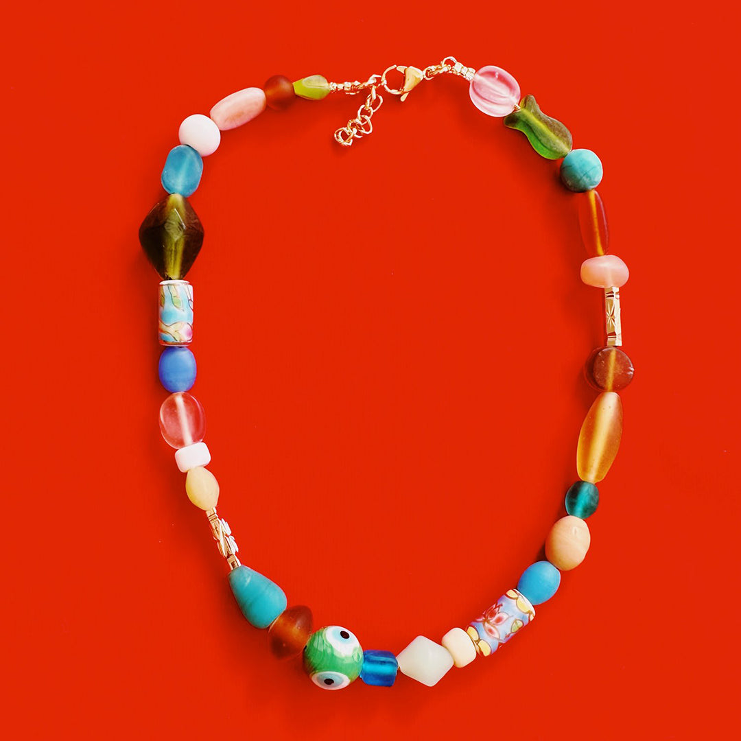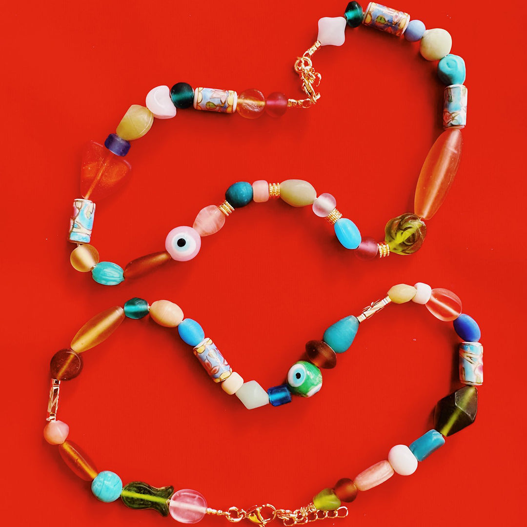 Assorted sea glass beads, lamp work eye beads, gold plated spacers, gold plated stainless steel findings and hardware.