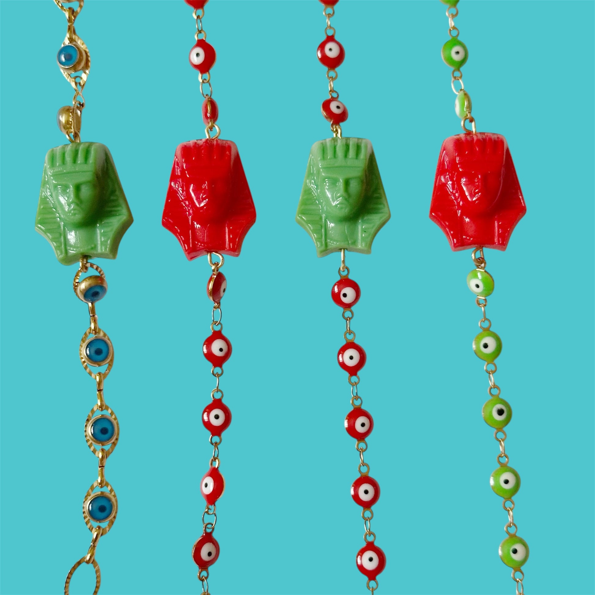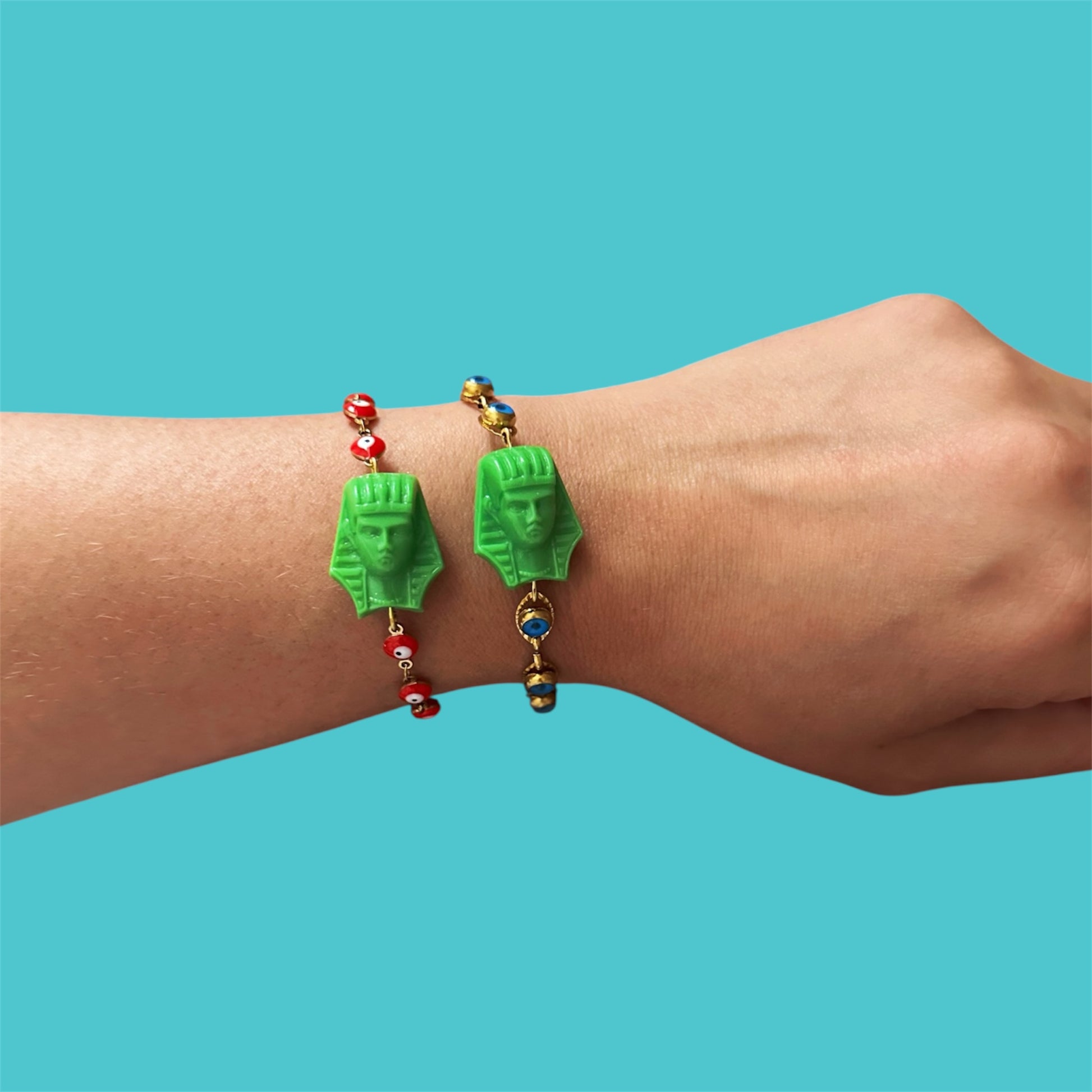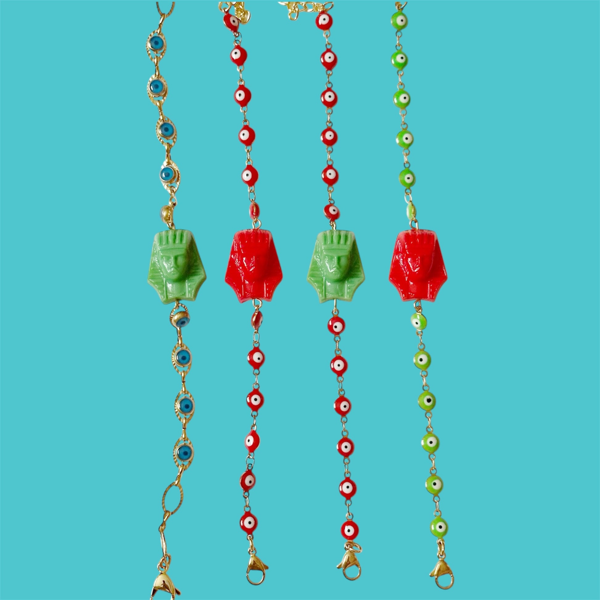 Style 1: Green vintage Tut inspired bead, blue gold plated eye chain, gold plated stainless steel chain, 8" - please specify in notes at checkout if you have another preferred length.
