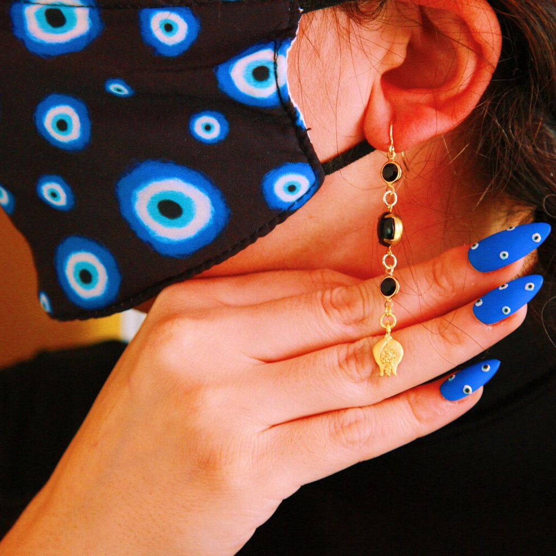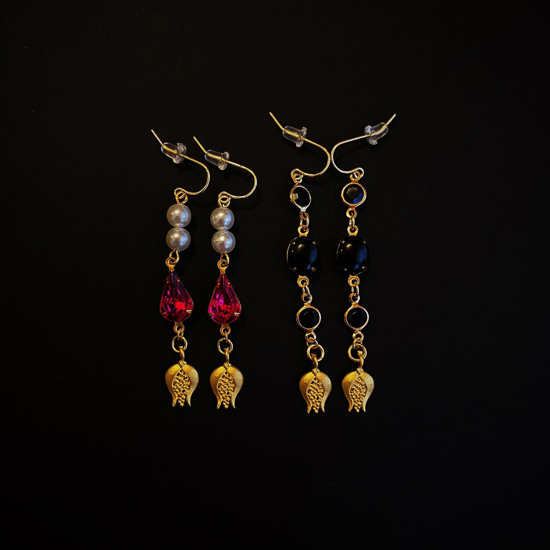 18k gold plated brass hardware, vintage fuchsia and onyx stones, matte gold plated pomegranate charms.