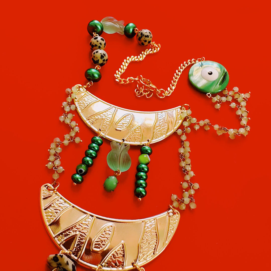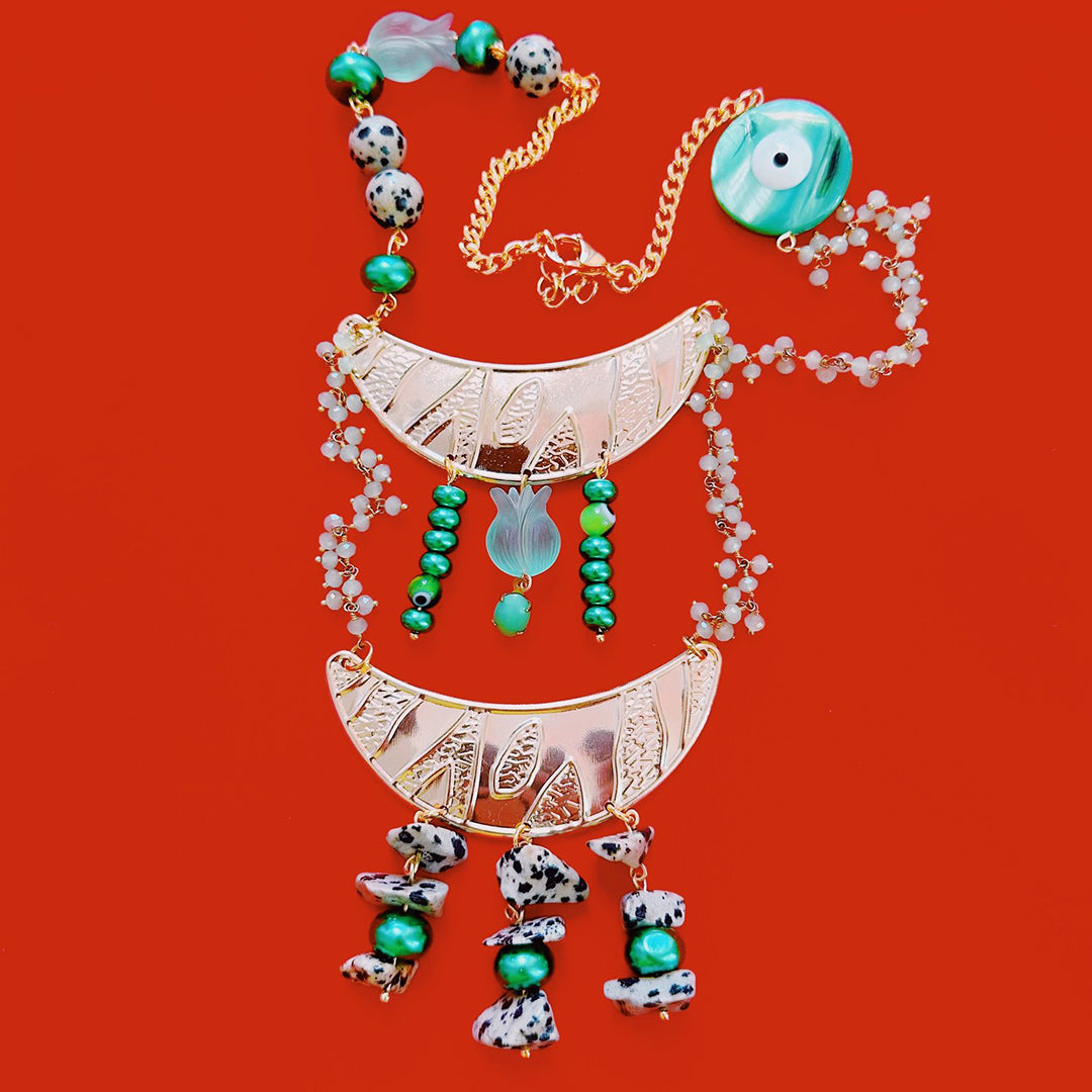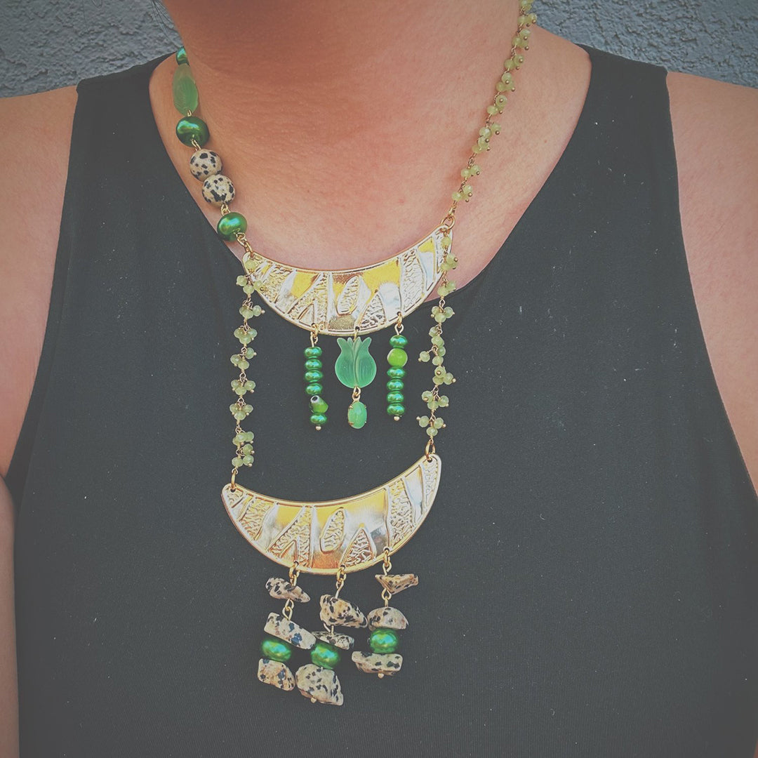 Double crescent pendant, 15-15.5 inches, gold plated stainless steel findings and hardware, wire wrapped light green stone chain, Dalmatian jasper, mother of pearl, and glass beading throughout.