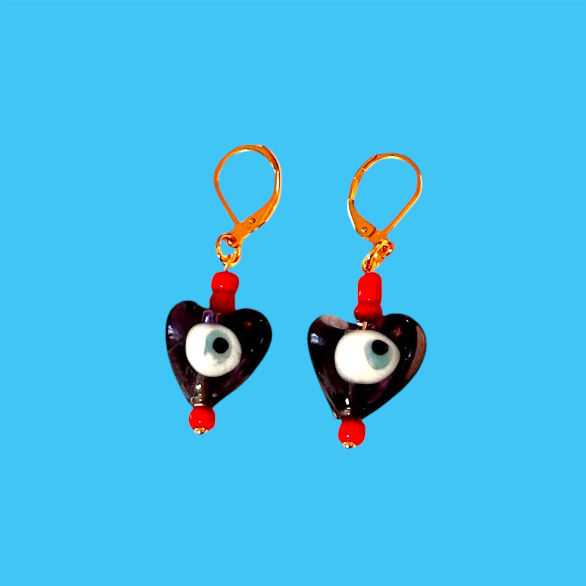 18k Gold plated stainless steel lever back baby hoop earrings, glass heart evil eye beads, seed beads in green/blue/red/yellow, gold plated stainless steel hardware.