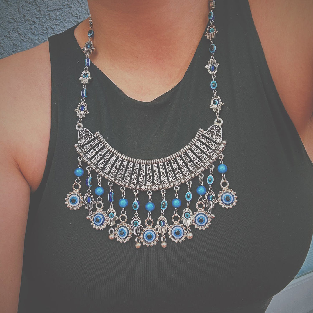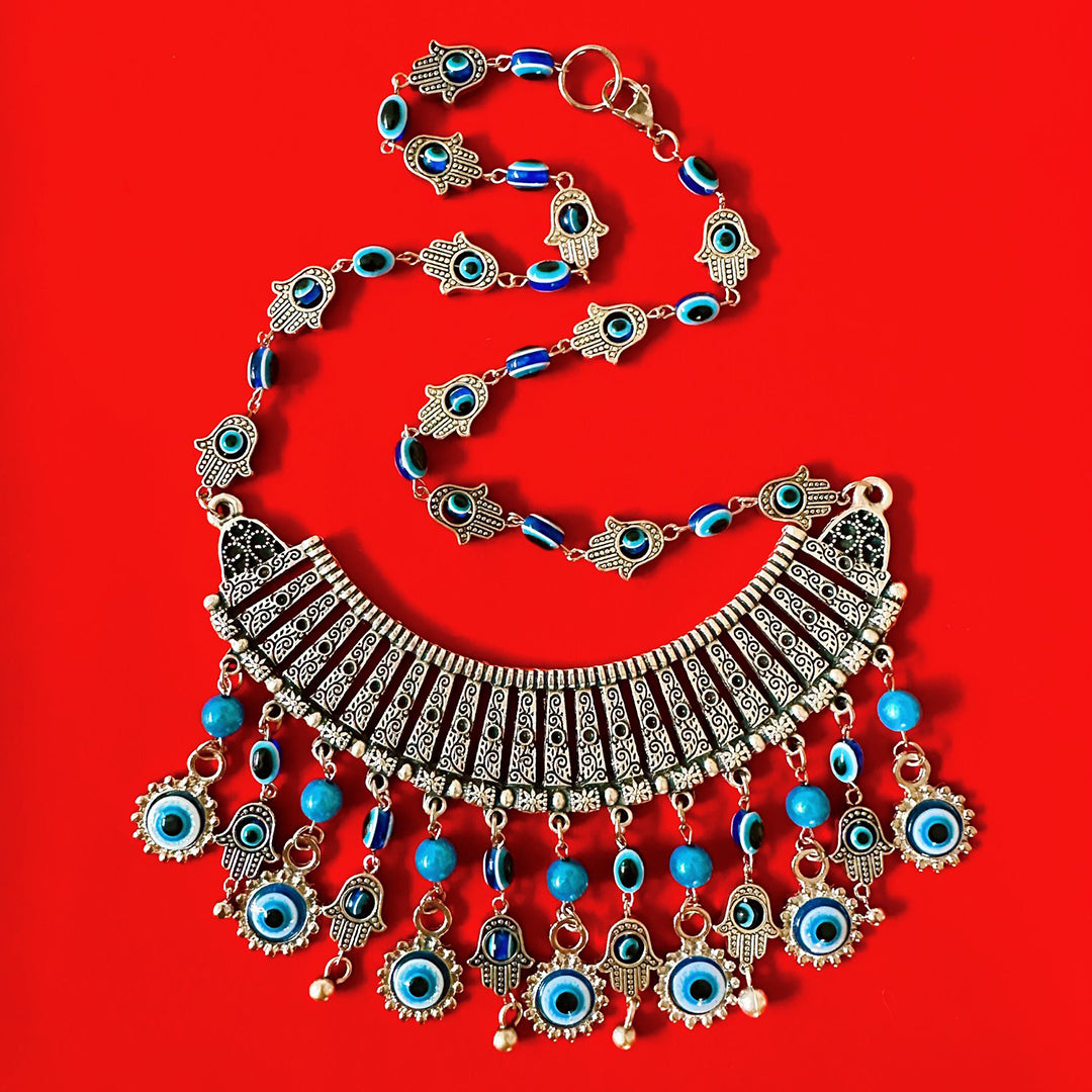 About 19 inches in length, silver findings and charms, blue miracle beads.