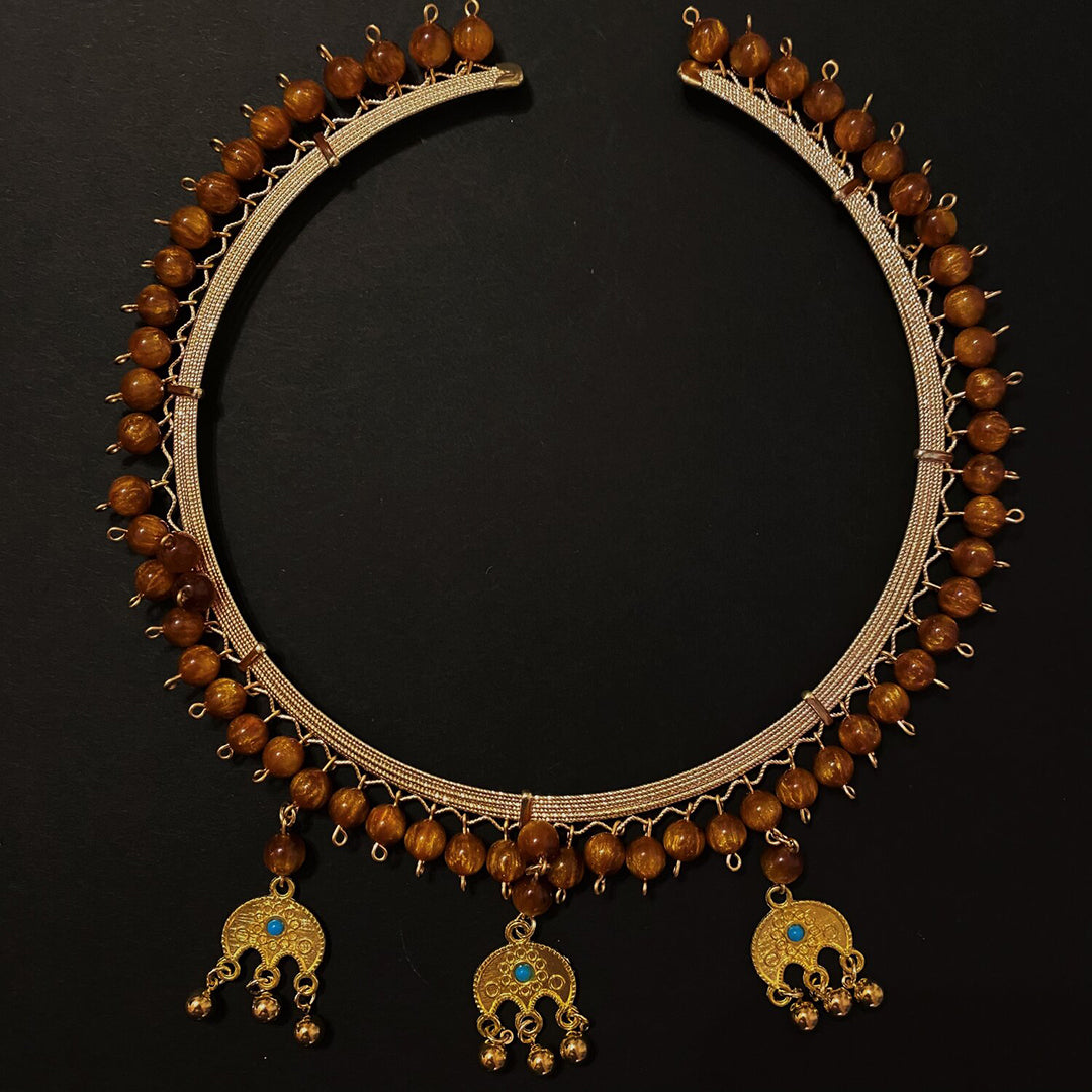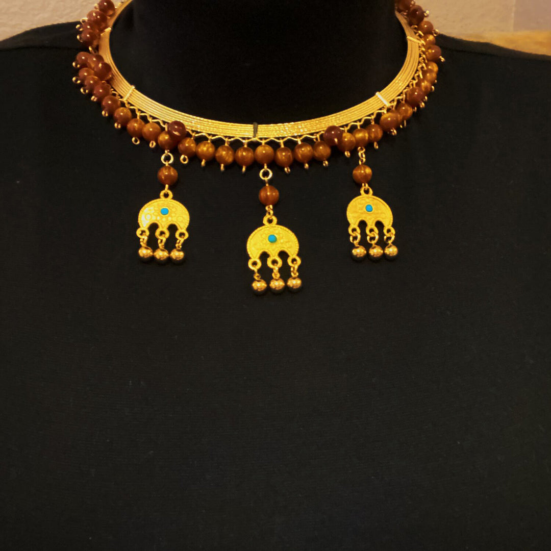 18k gold plated findings/hardware. Brown beads and sarpacham with turquoise from the bazaar in Kurdistan.