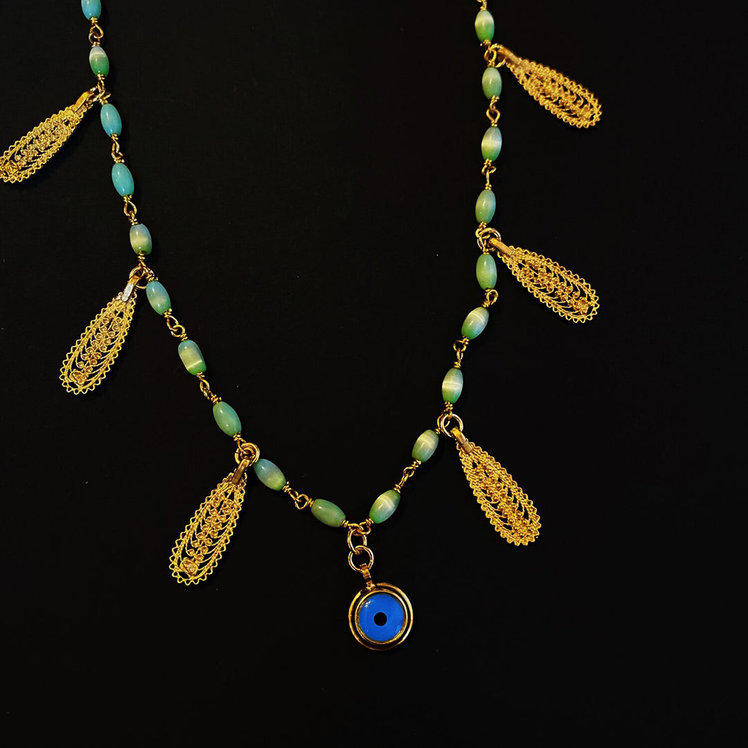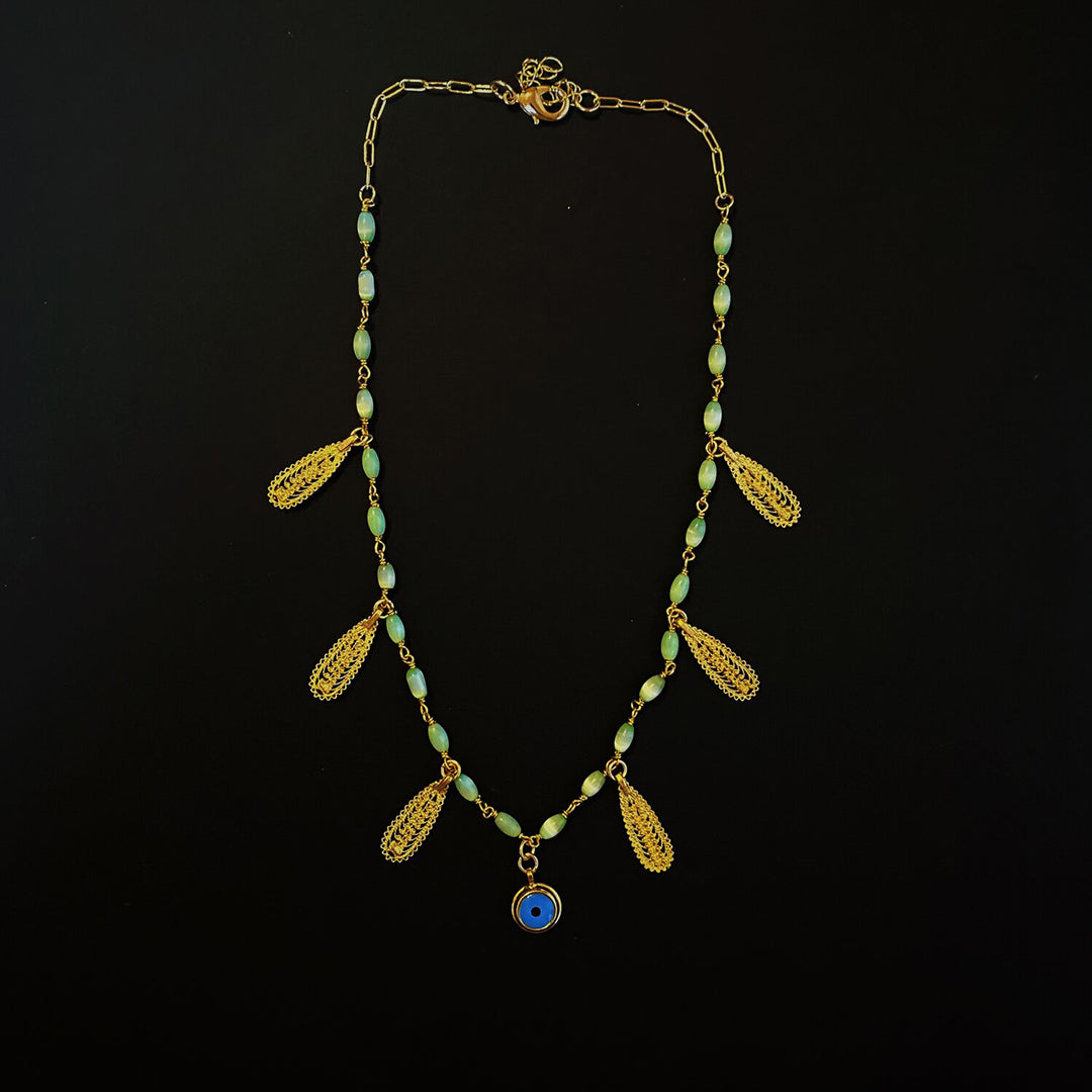 Gold plated wire wrapped green rondelle beads, 18k gold plated brass paper clip chain and hardware, gold plated enamel evil eye and filigree fan charm, 16inch chain with extension.