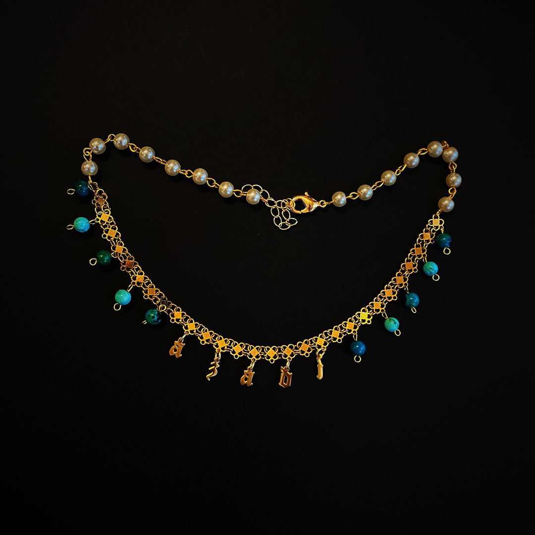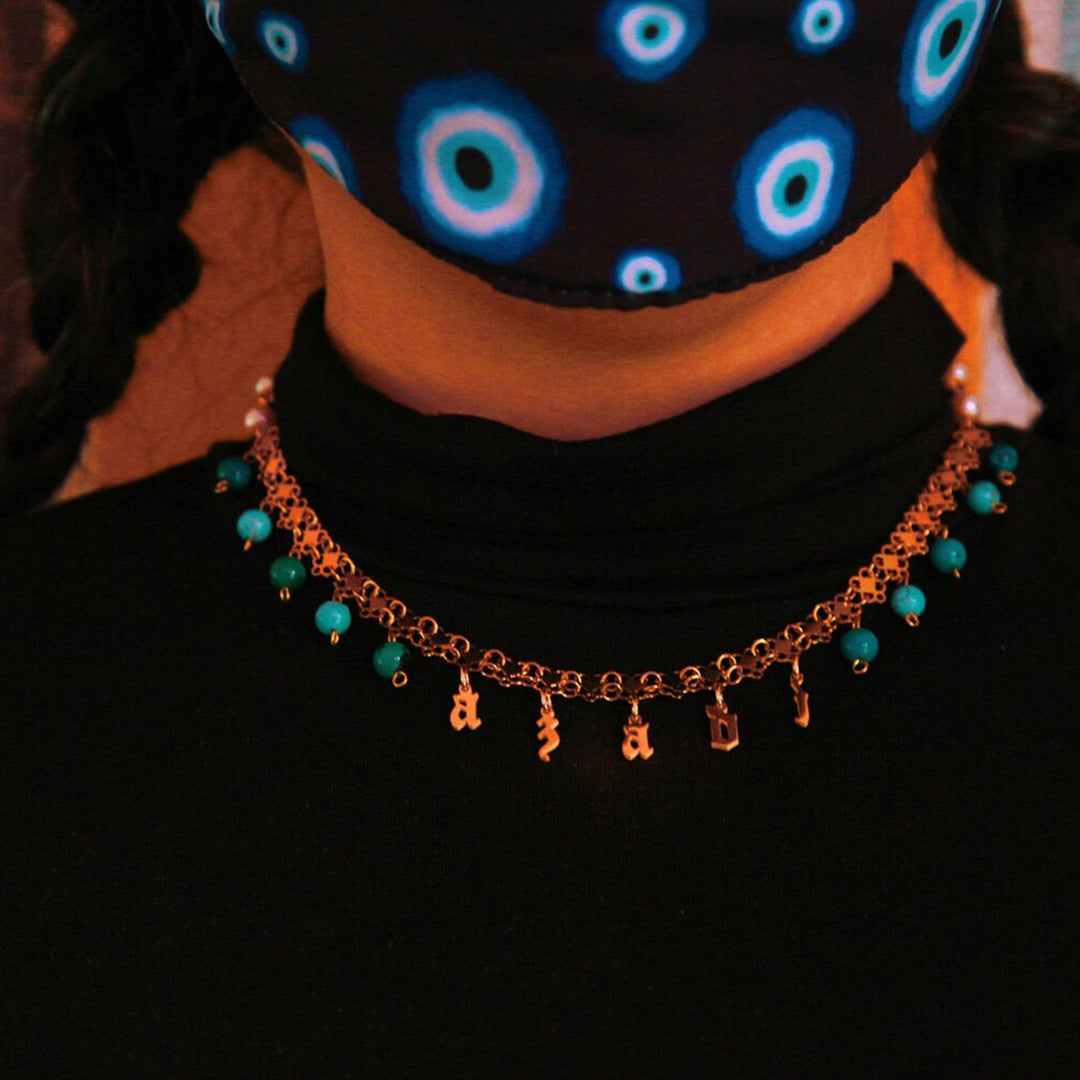 18k Gold plated brass hardware, Kurdish Gardana inspired chain, custom designed old English AZADI letters, 15.5 inch chain with extension, natural Australian jasper stone.