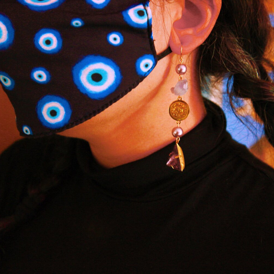 18k gold plated brass hardware, amethyst raw stone, vintage glass pyramid charm.