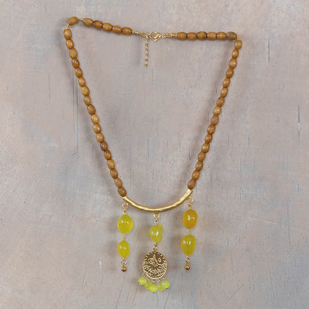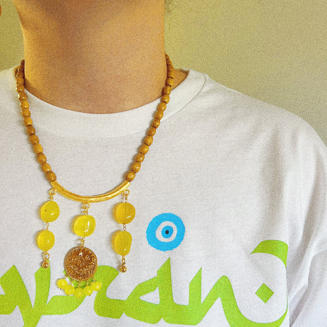 These specific Qazwan beads were given to me by my maternal grandmother and maternal aunt to use and are years and years old. Gold plated findings and hardware. The yellow stones are “honey” chalcedony stones, and the smaller beads are glass beads, gold plated coin charm. Limited quantity of 2.