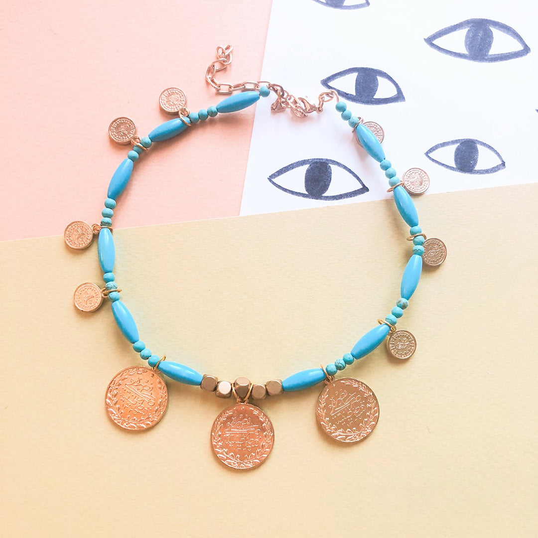This necklace/choker is a combination of inspiration from both Ancient Egyptian beaded costume jewelry as well as Kurdish jewelry traditionally worn with Kurdish clothing. The beads, color and style, are an ode to Ancient Egypt while the Lira coins are an ode to Kurdish fashion jewelry.