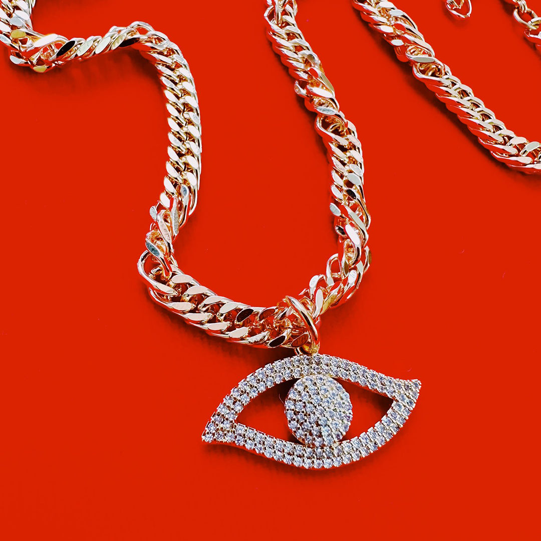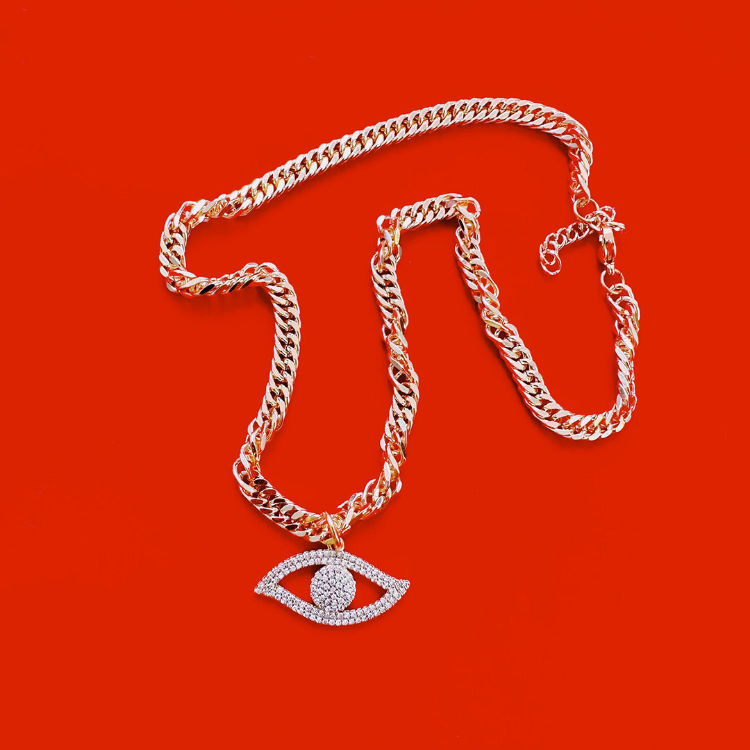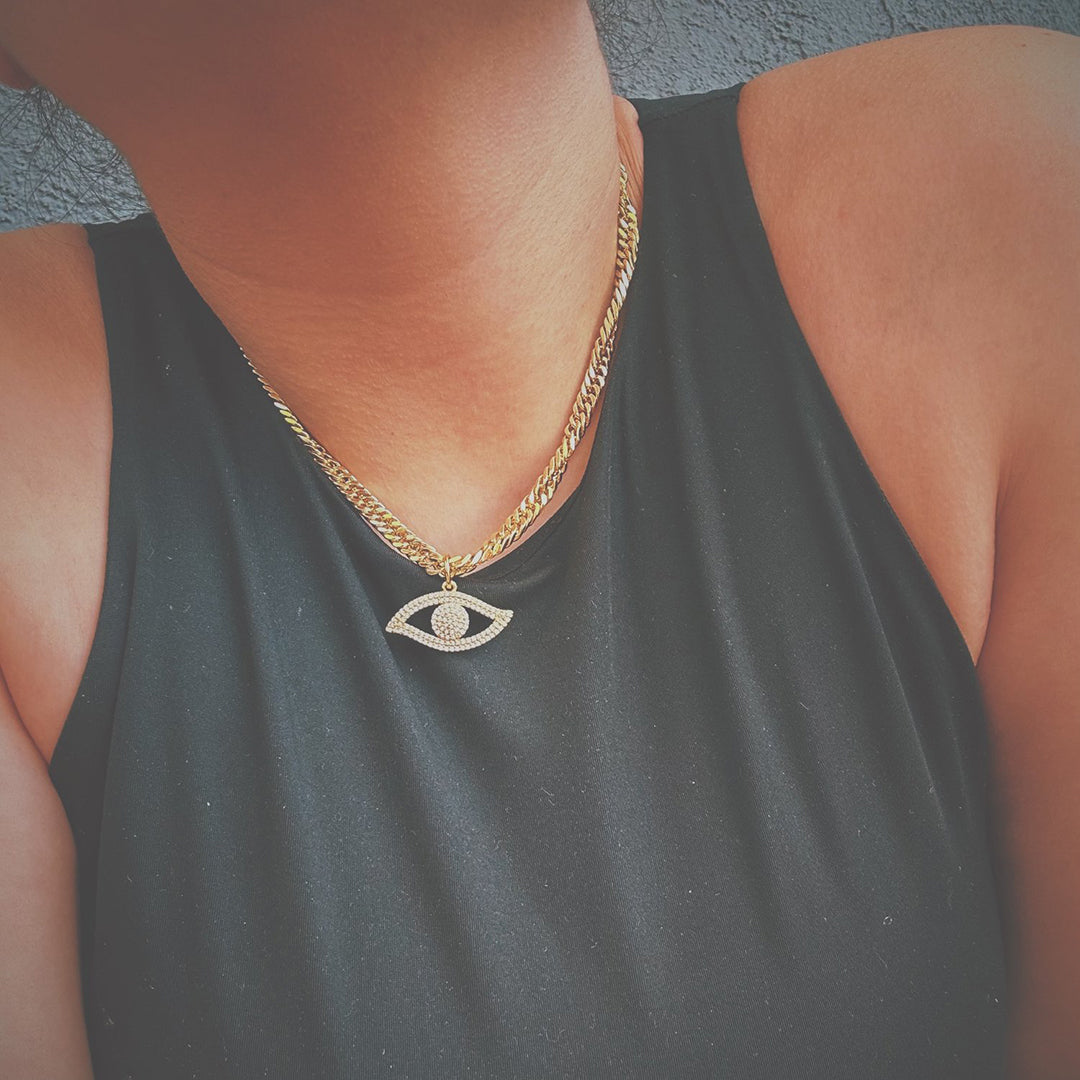 Gold plated stainless steel chain, hardware and findings, CZ medium sized glam eye charm. 15 inches with additional extension.