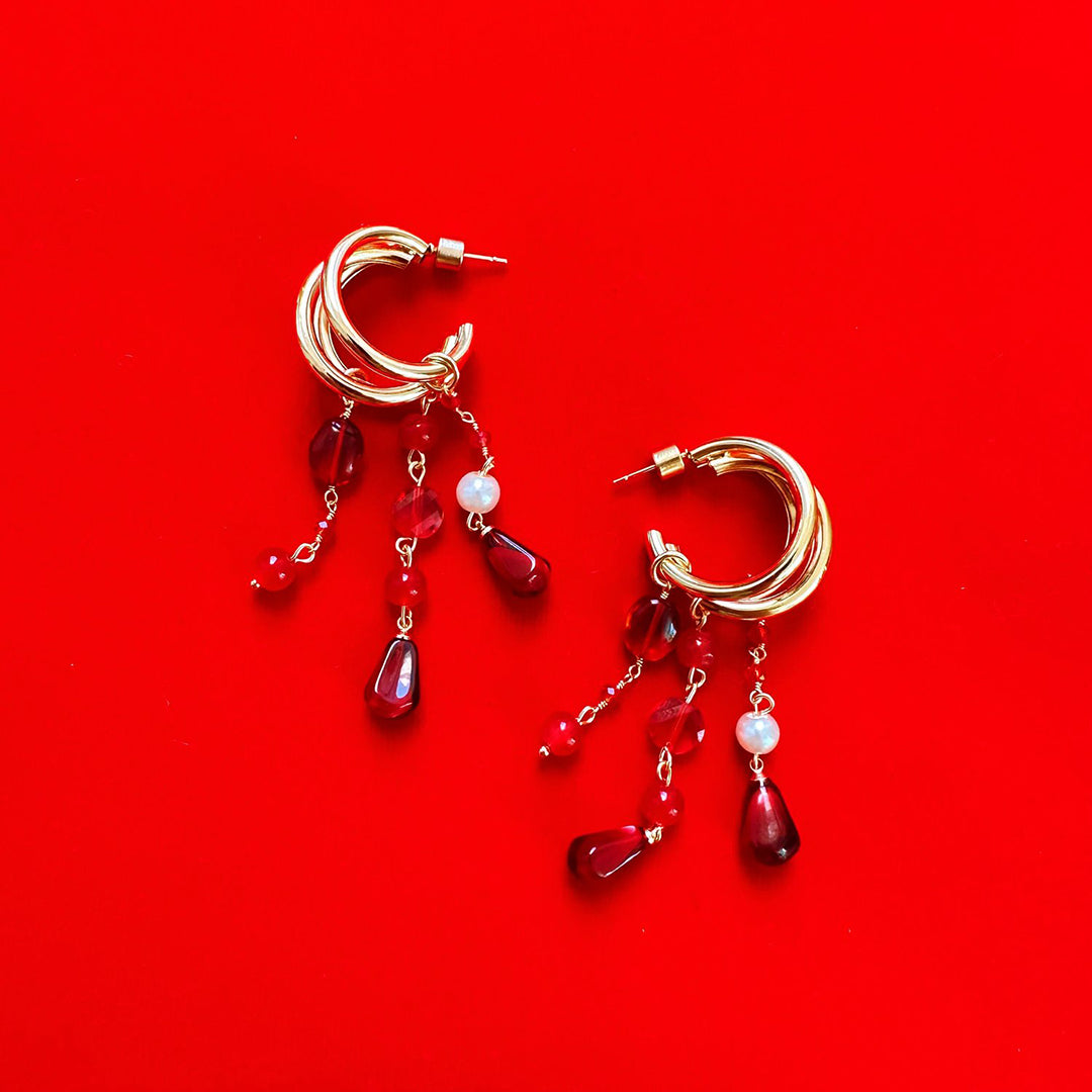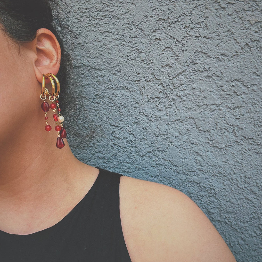 Gold plated stainless steel hoops and hardware, pomegranate (Rumman in Arabic) seed charms, glass and crystal beads throughout. Pair weighs 0.5 ounces.