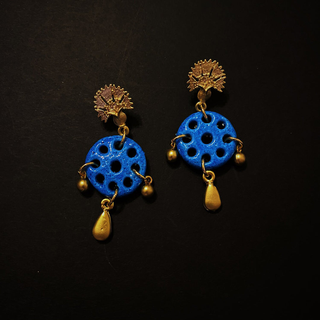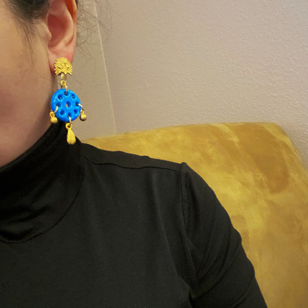 24k gold plated fan style earring studs, 18k gold plated brass hardware, gold plated teardrop and ball charms, ancient blue Kuzhaka evil eye stone from Kurdistan.