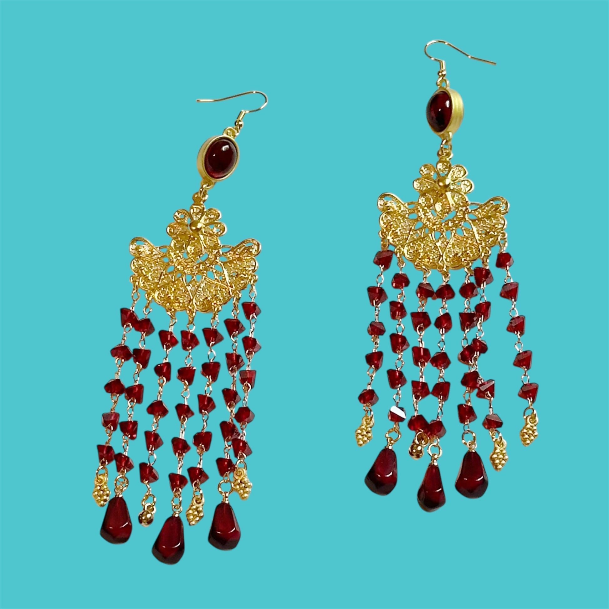 Gold plated stainless steel hardware, red garnet wire wrapped stones, pomegranate seed charms/matte gold plated mini grape charms. Pair weighs 0.9oz.