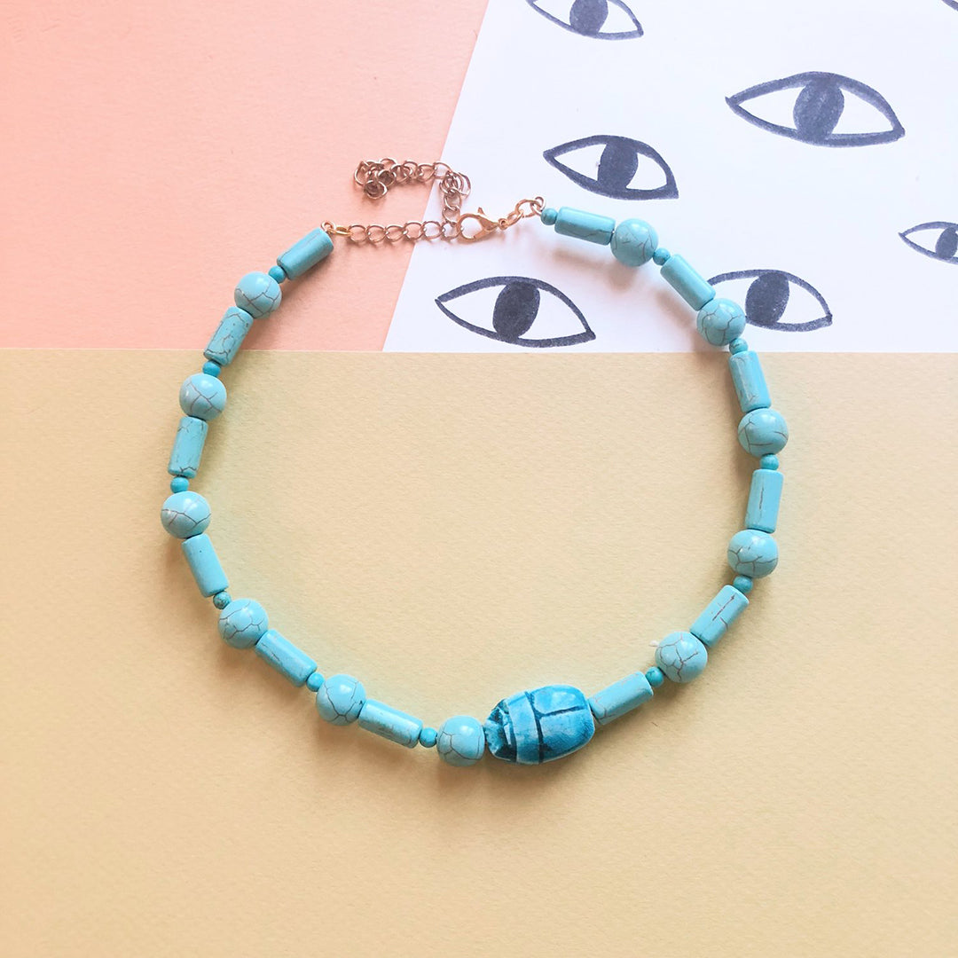 This necklace/choker is inspired by Ancient Kemetic/Egyptian beaded costume jewelry. The beads, color and style, are an ode to pieces worn in Ancient Egypt.
