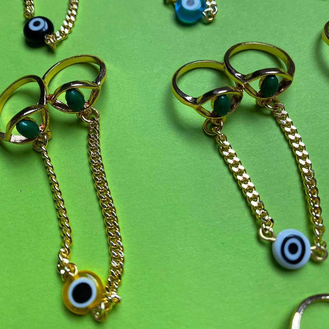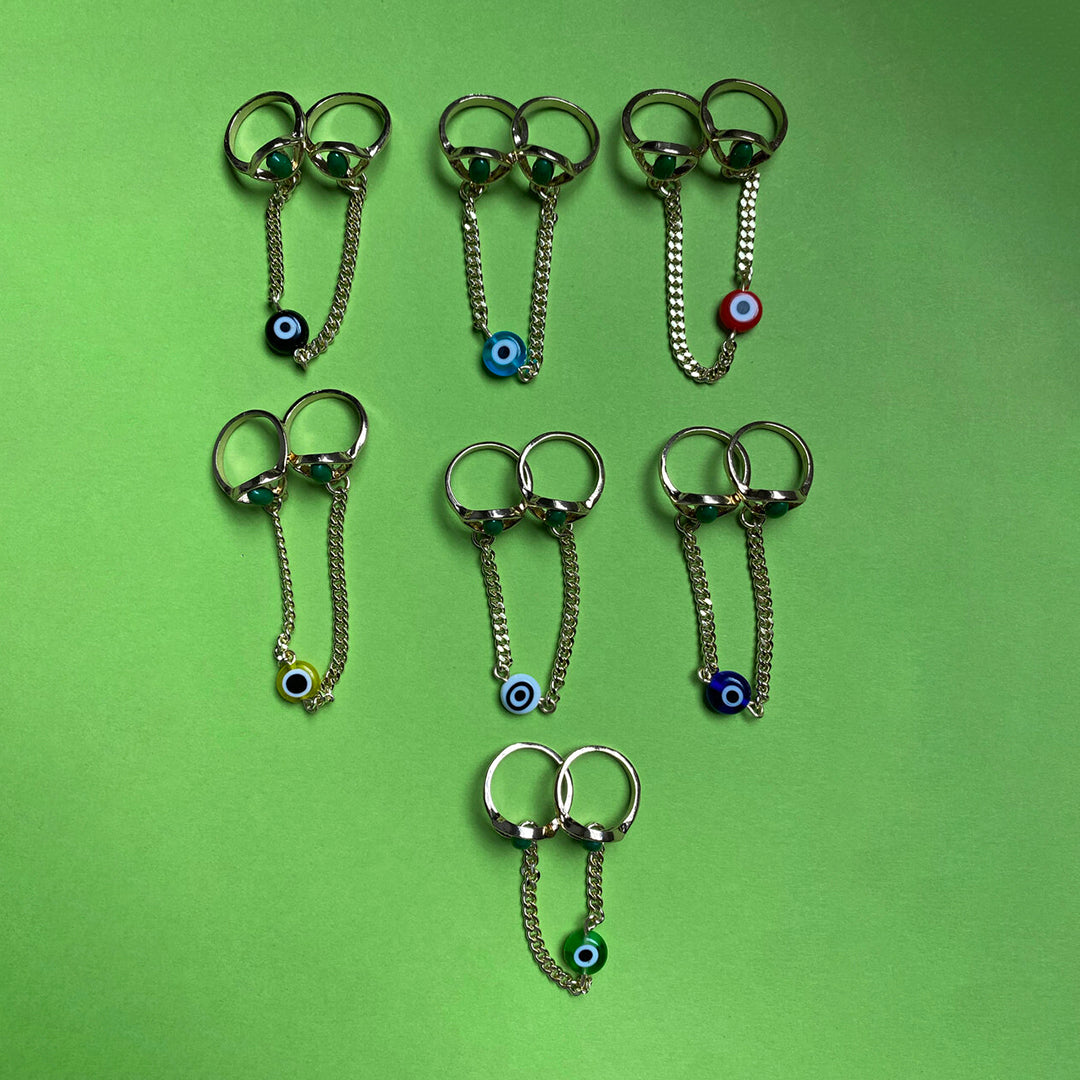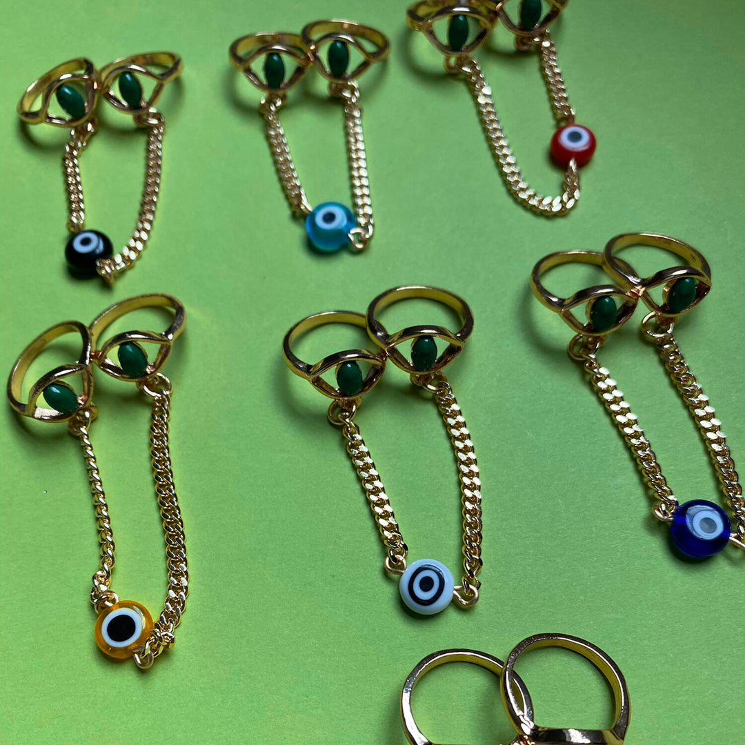 Gold plated hardware/chain, 7 different variations for evil eye bead. Metal alloy rings. Can be worn in several ways, as shown in the photos.