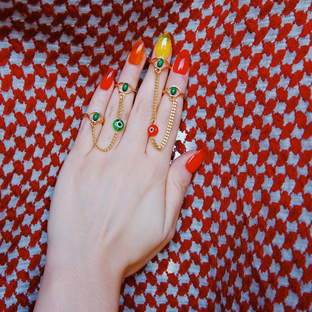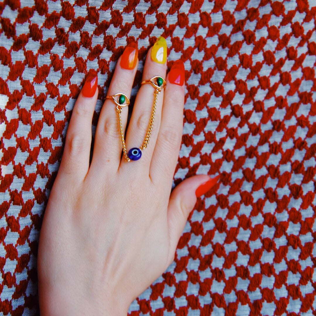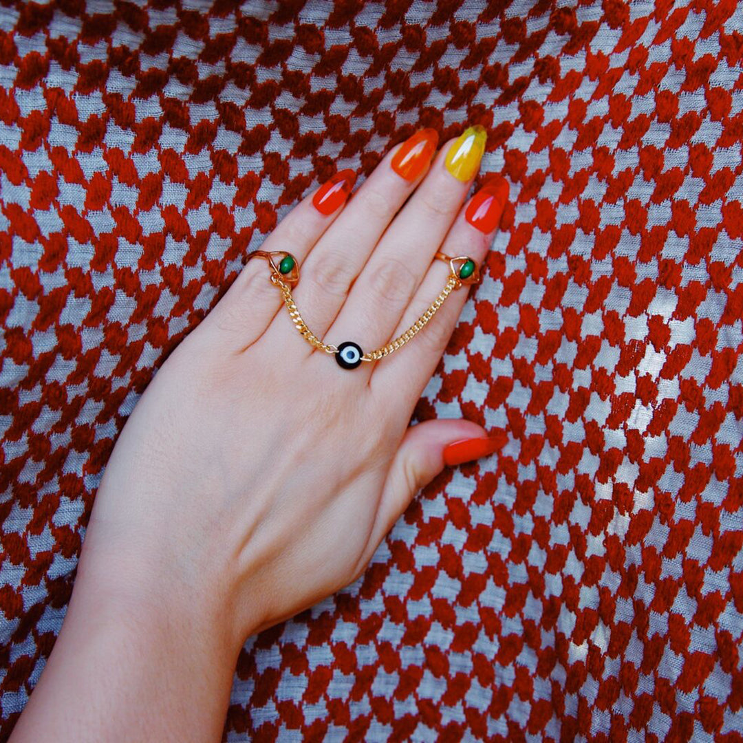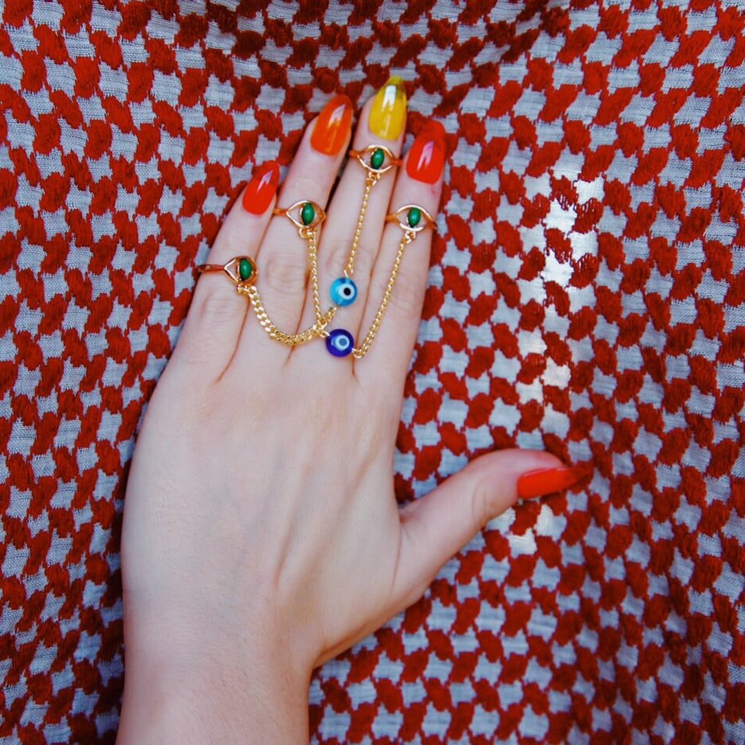 Gold plated hardware/chain, 7 different variations for evil eye bead. Metal alloy rings. Can be worn in several ways, as shown in the photos.