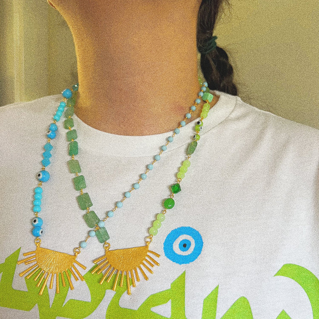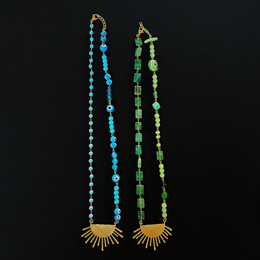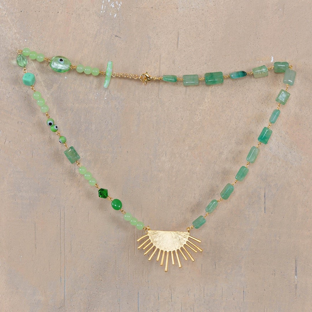 Green: Matte gold plated sun ray charm, 22 inch chain with extension, glass green and evil eye beads, natural green quartz gold plated wire wrapped chain, gold plated hardware and findings.