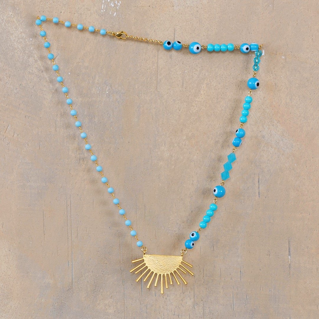 Blue: Matte gold plated sun ray charm, 22 inch chain with extension, natural turquoise rosary style chain, gold plated hardware and findings, glass turquoise and evil eye beads, opaque blue crystal beads.