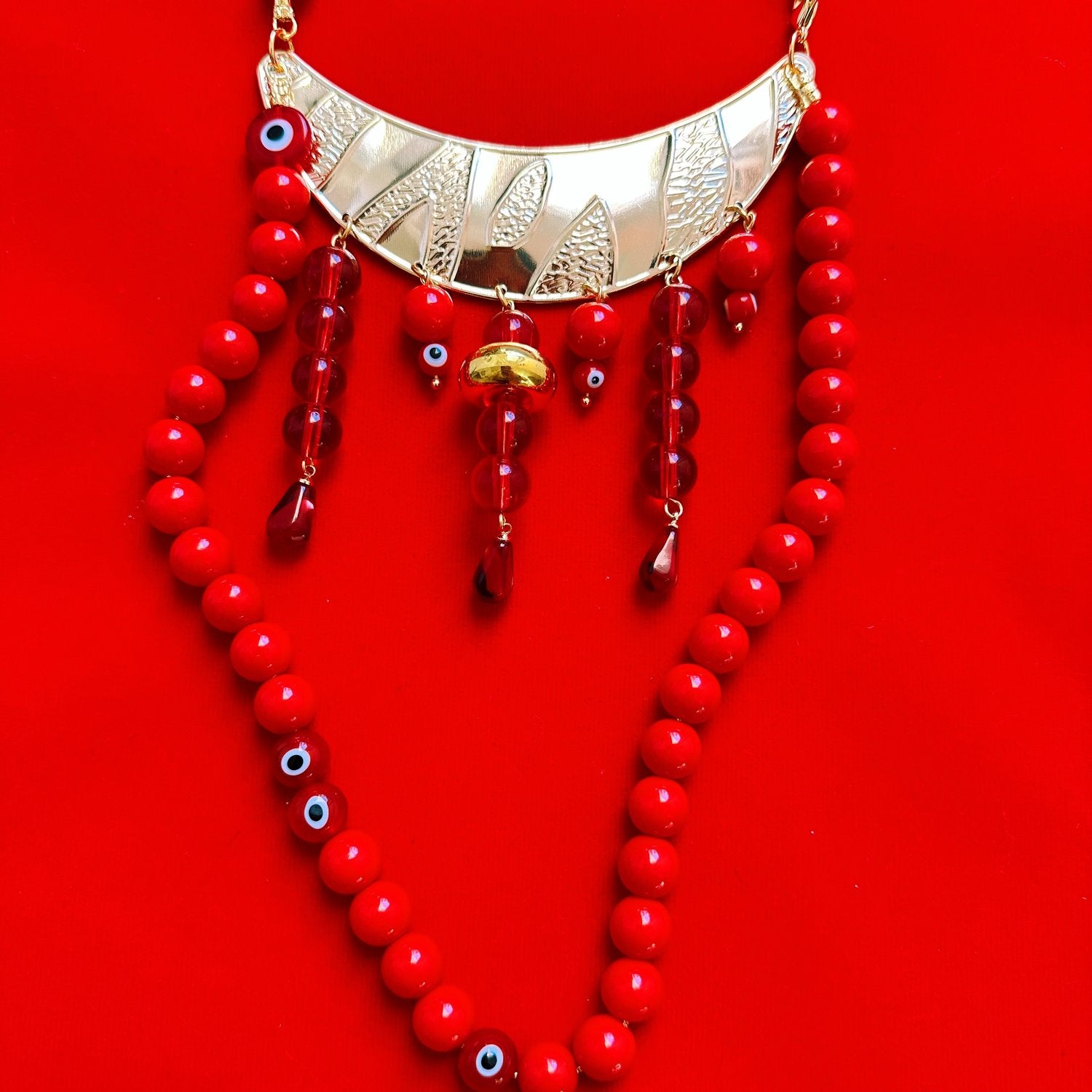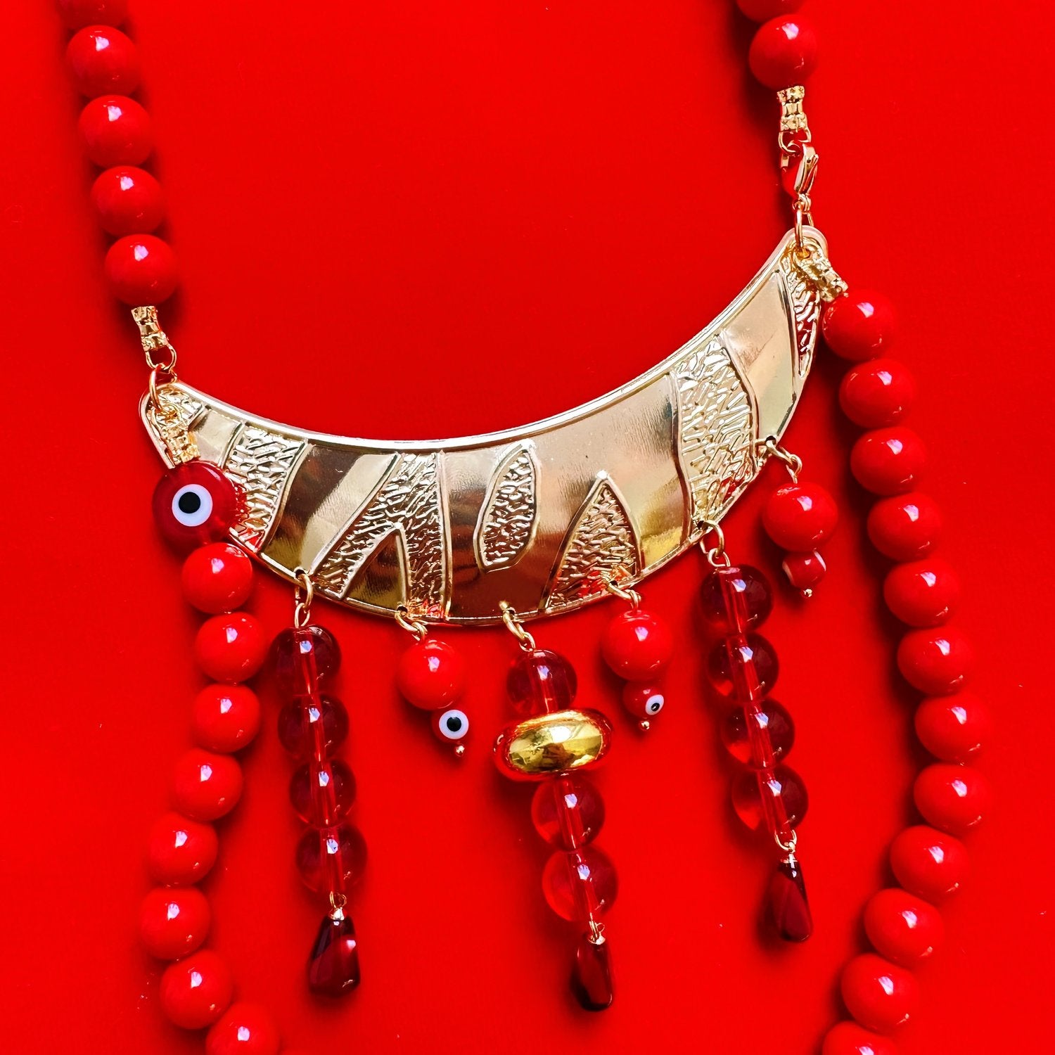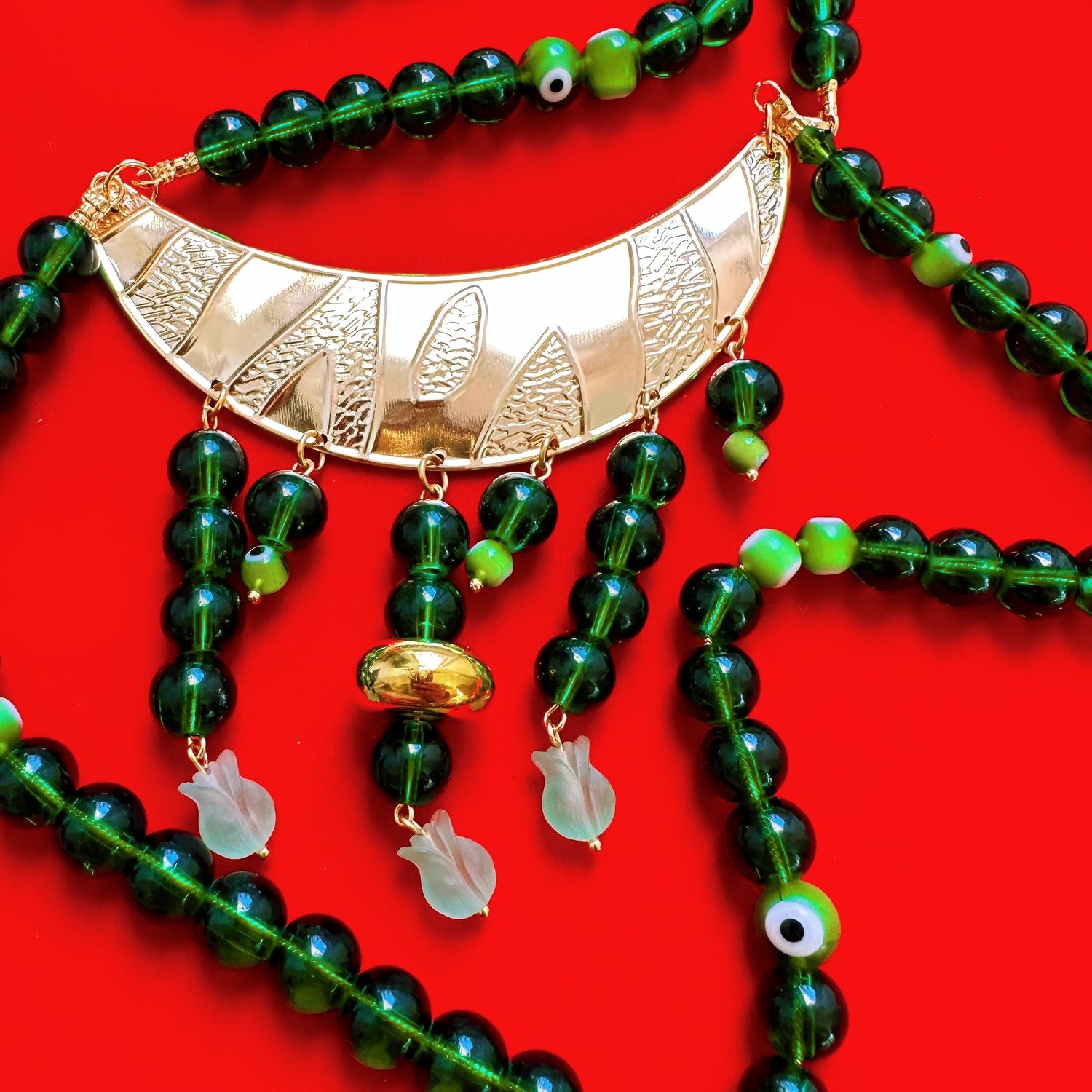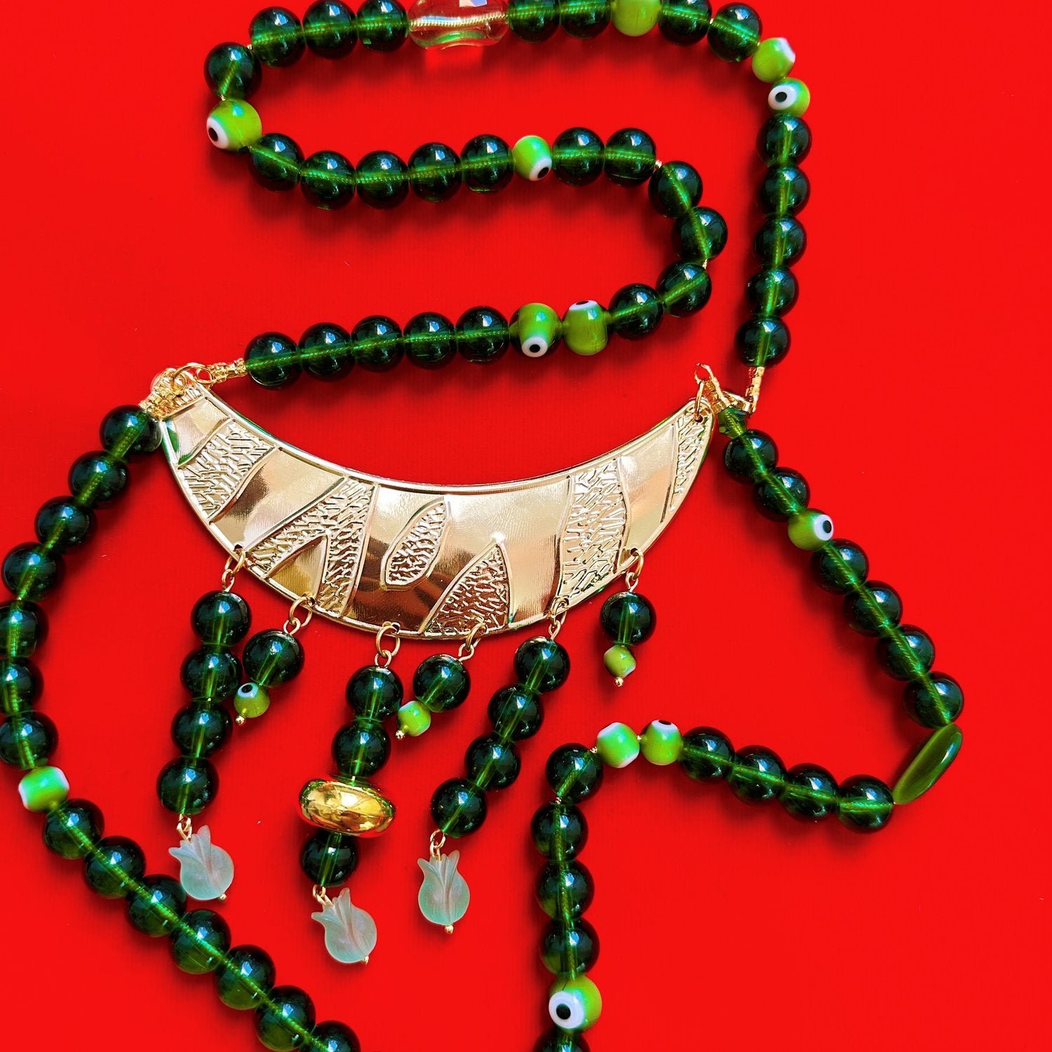 14inch chain, assorted glass beads, gold plated hardware and findings.