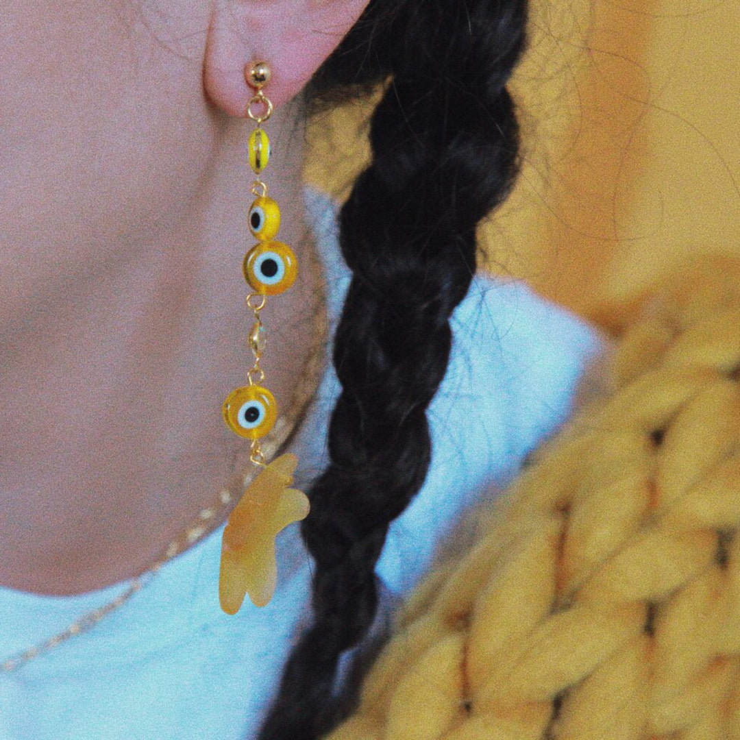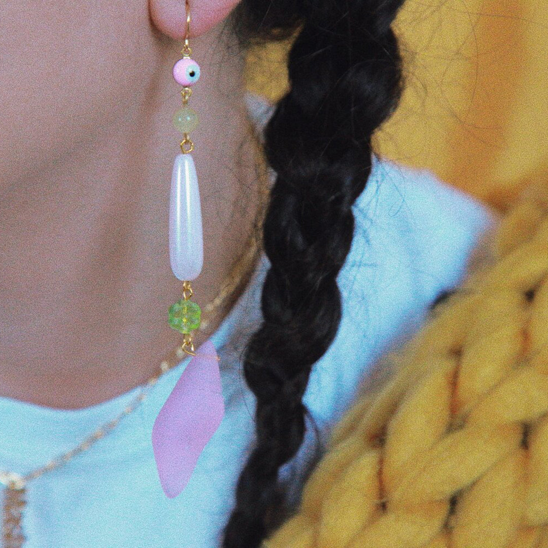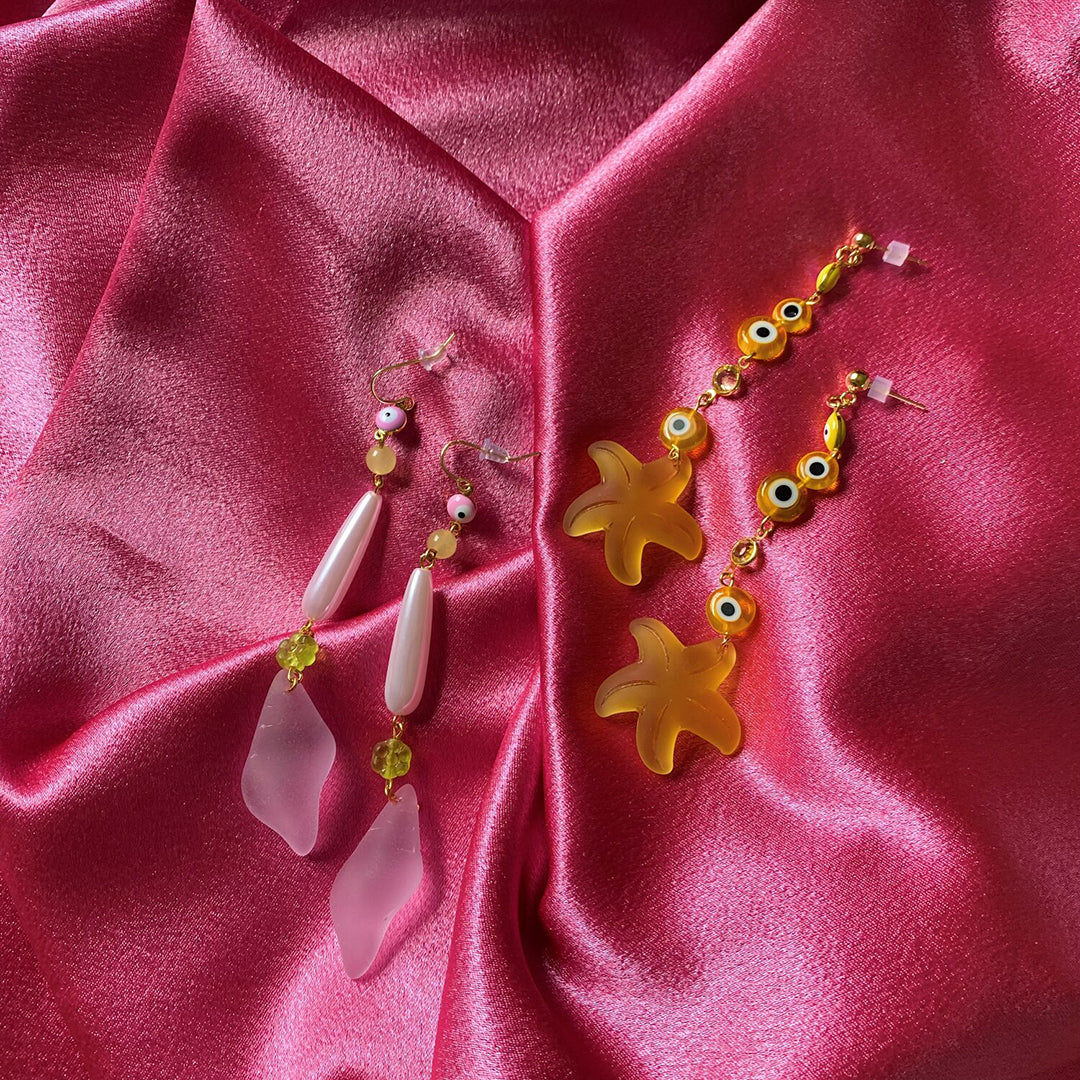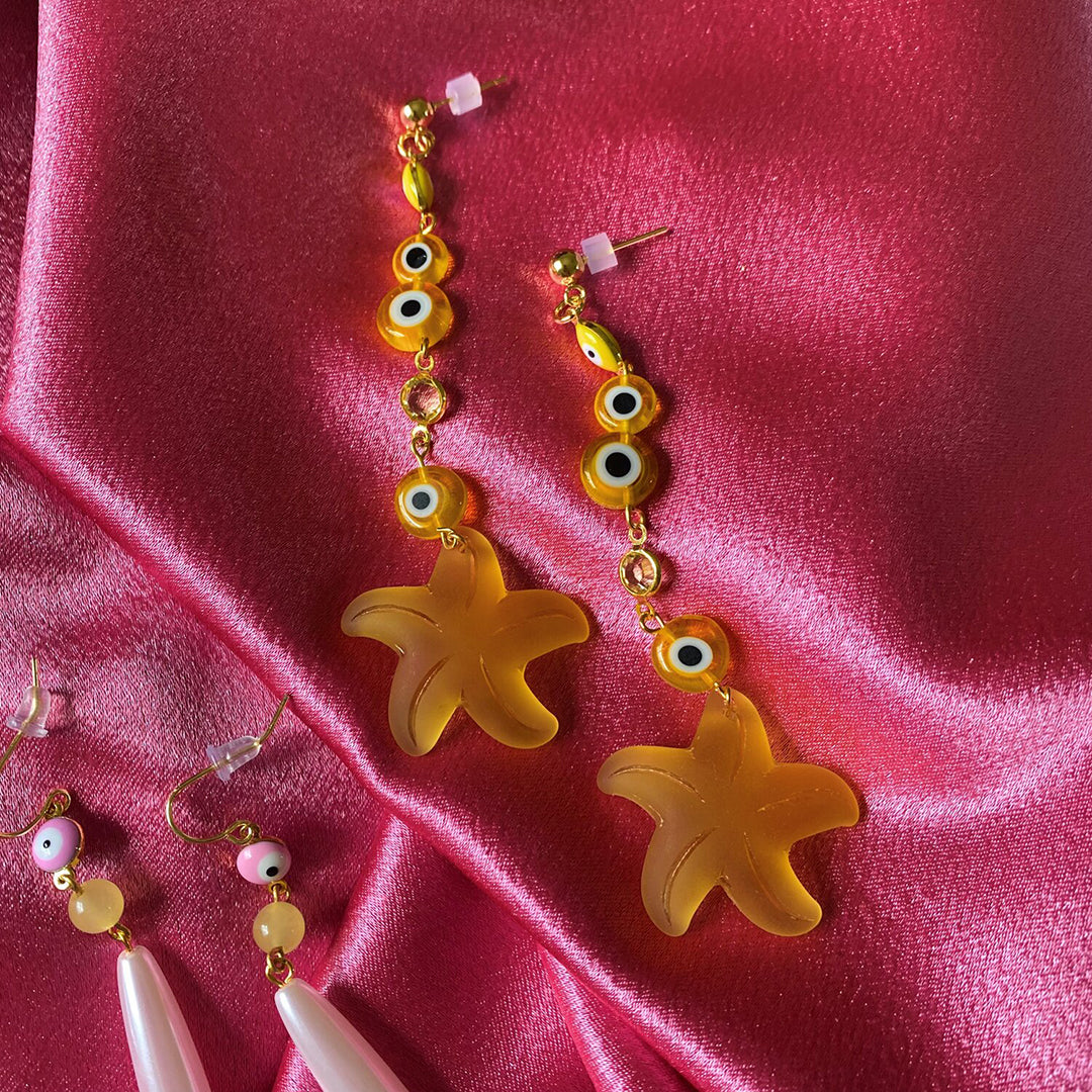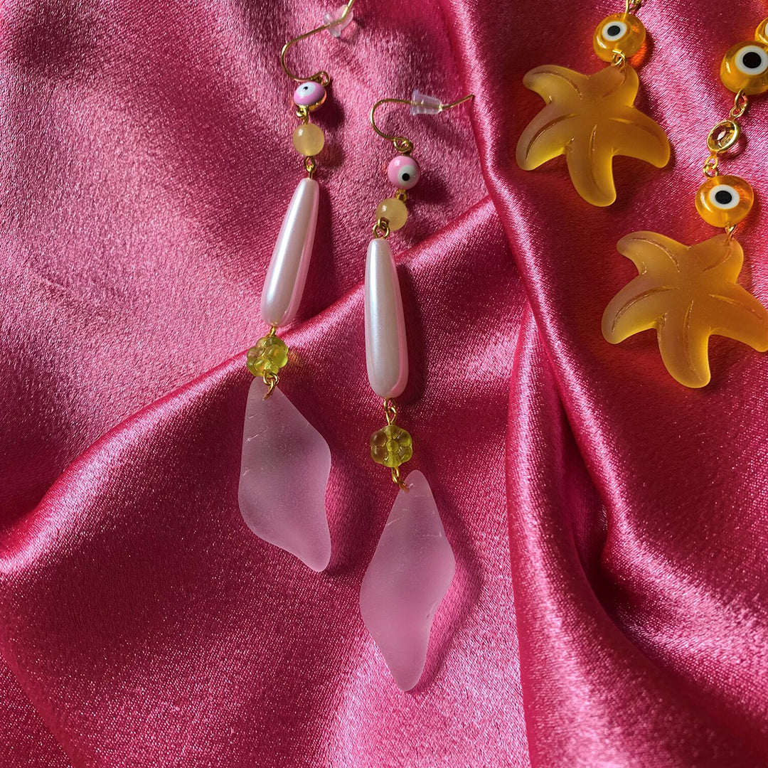 Gold plated hardware/findings. Vintage light pink long acrylic teardrops, dyed yellow jade, enamel evil eyes in pink and yellow, sea glass beads, up cycled pink seashell made of sea glass and yellow starfish made of sea glass.