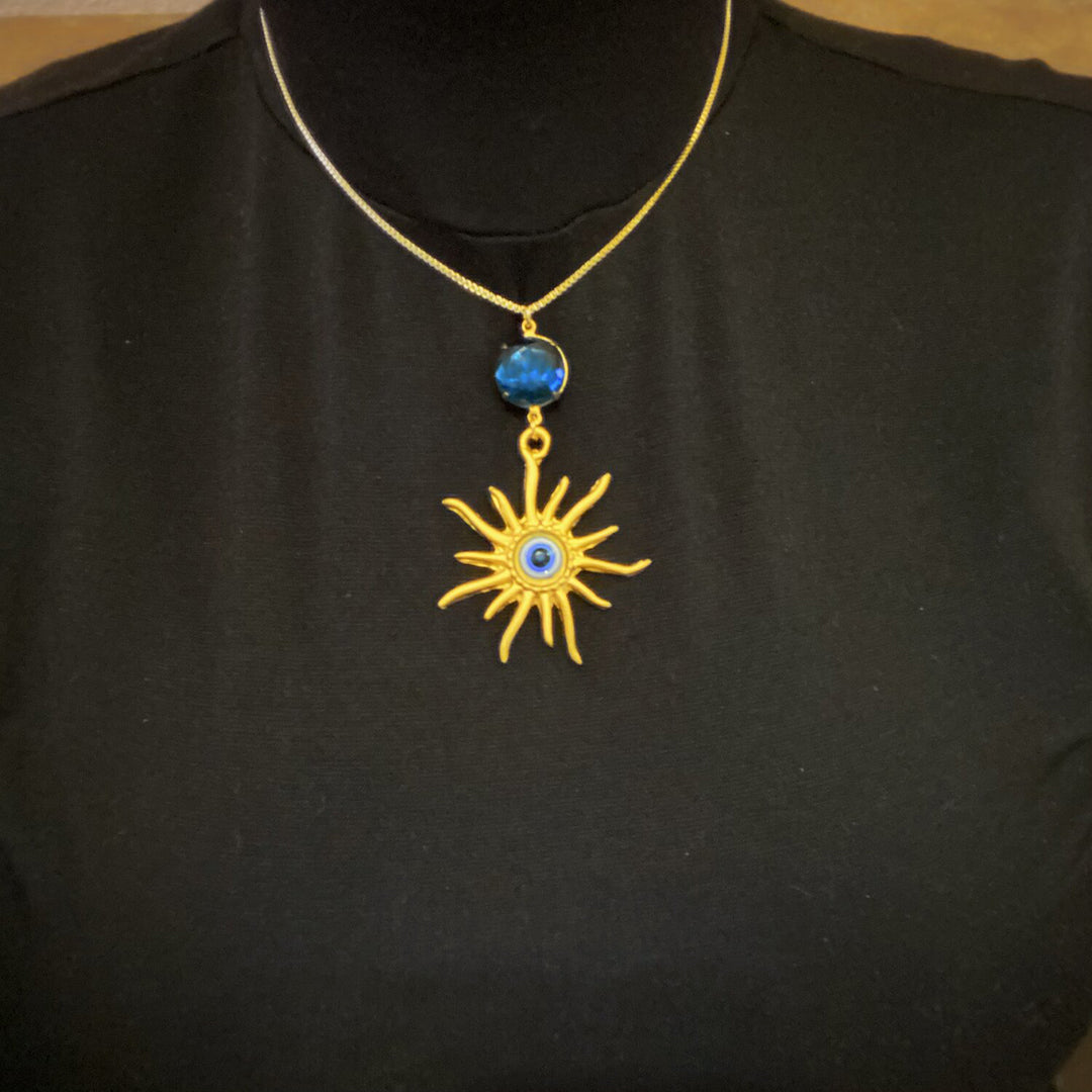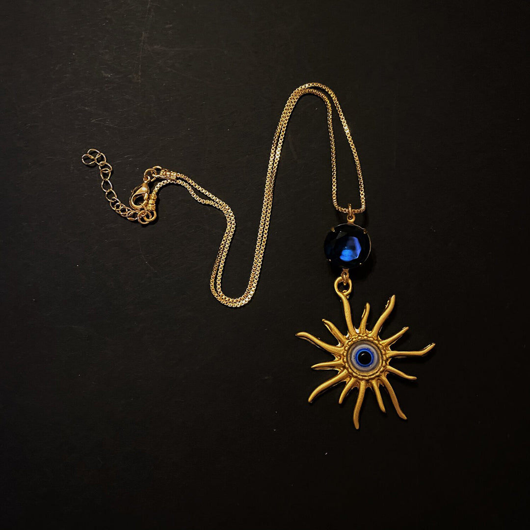 18k gold plated brass box chain and hardware/findings, matte gold sun pendant with evil eye, vintage oversized sapphire stone.