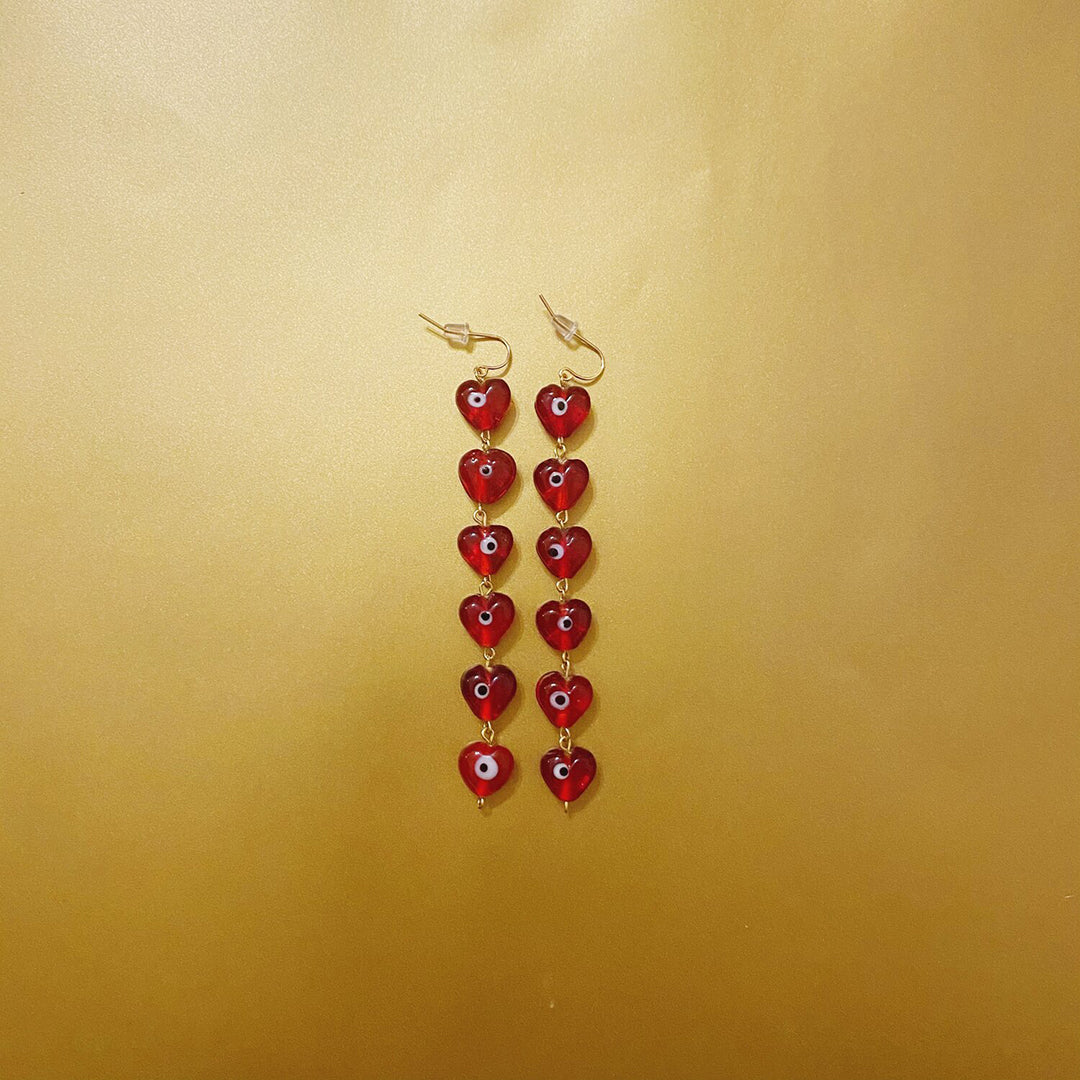 Indian glass heart eye beads, 18k gold plated hardware. Pair weighs 0.5 ounces and is 4inches from hook to bottom.