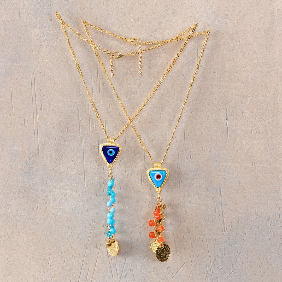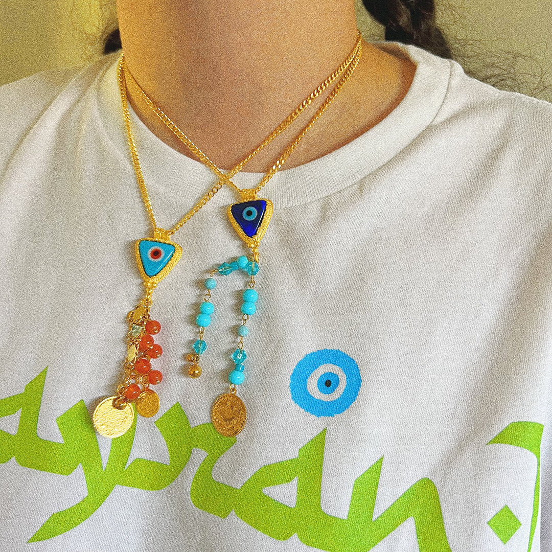 15 inch chain with extension, gold plated brass hardware, findings and chains, gold plated evil eye charm and coin, mix of crystal and glass beading.