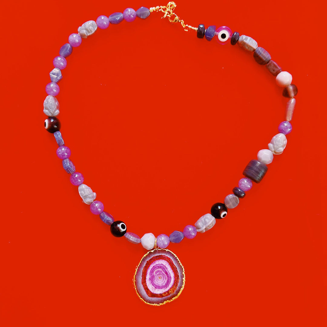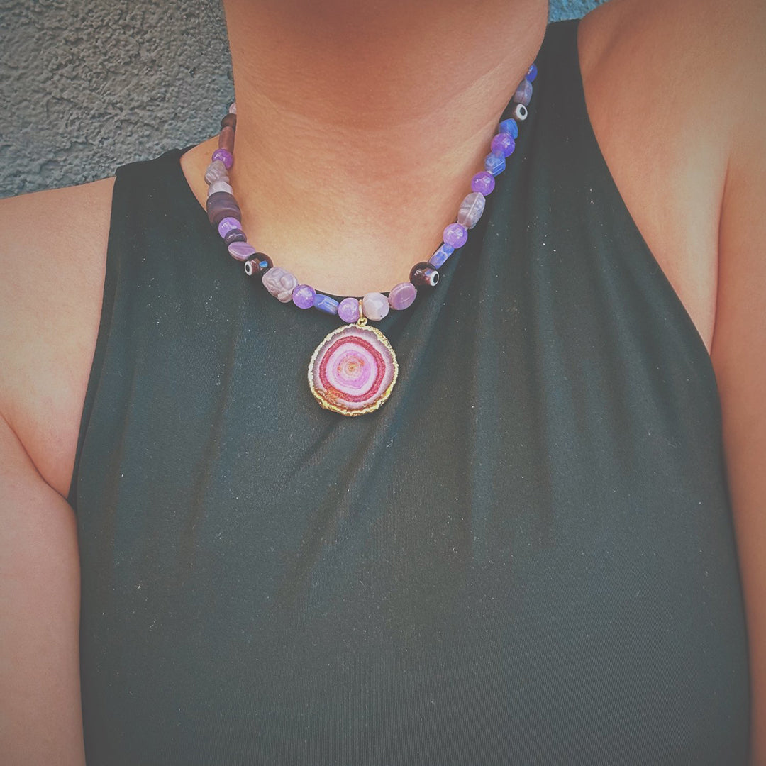 16 inch chain, gold plated chain, hardware and findings, assortment of glass and sea glass beads, genuine purple solar quartz pendant in gold plating.