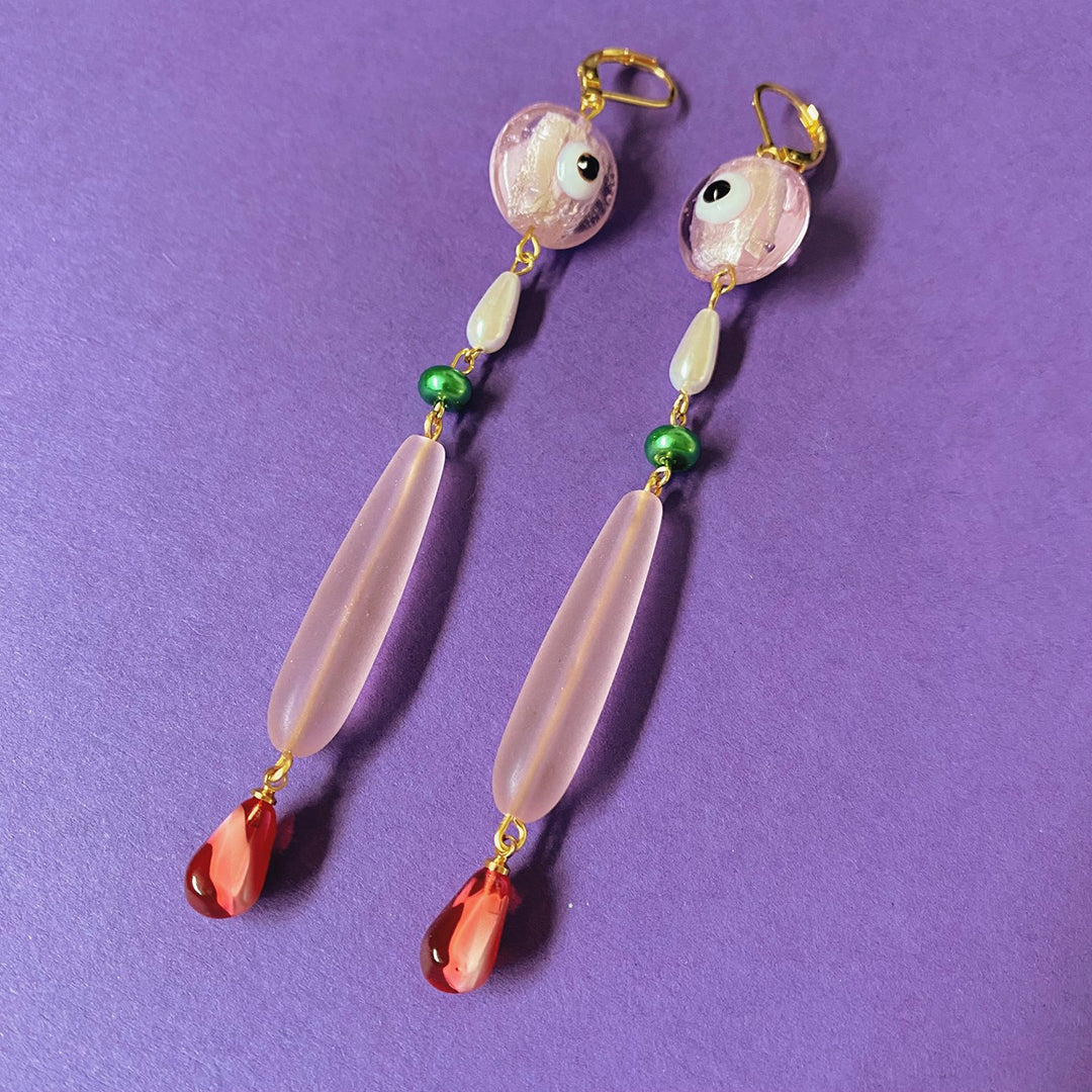 Glass evil eye bead, pink elongated sea glass bead, pomegranate charm, 18k gold plated stainless steel hoop earrings and hardware.
