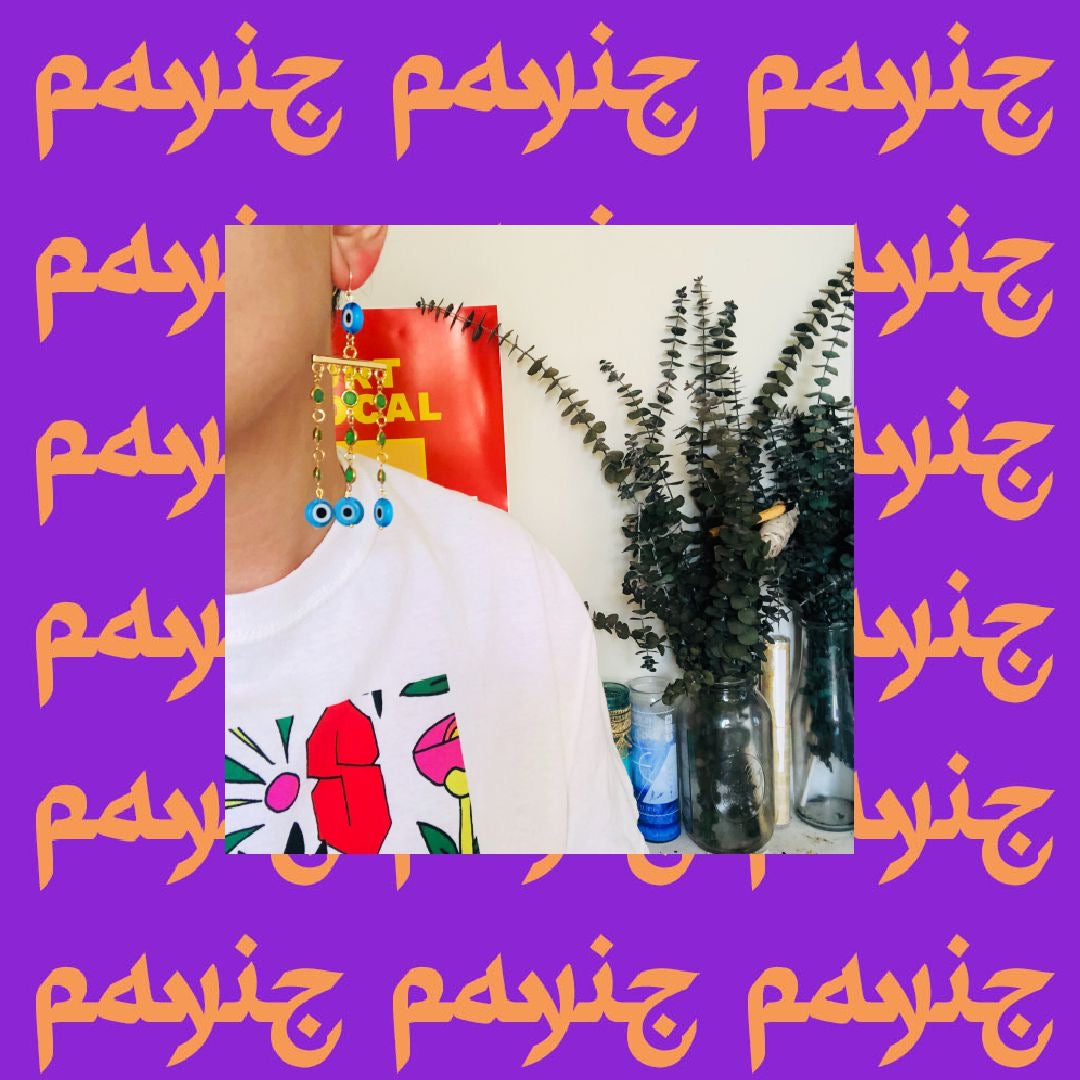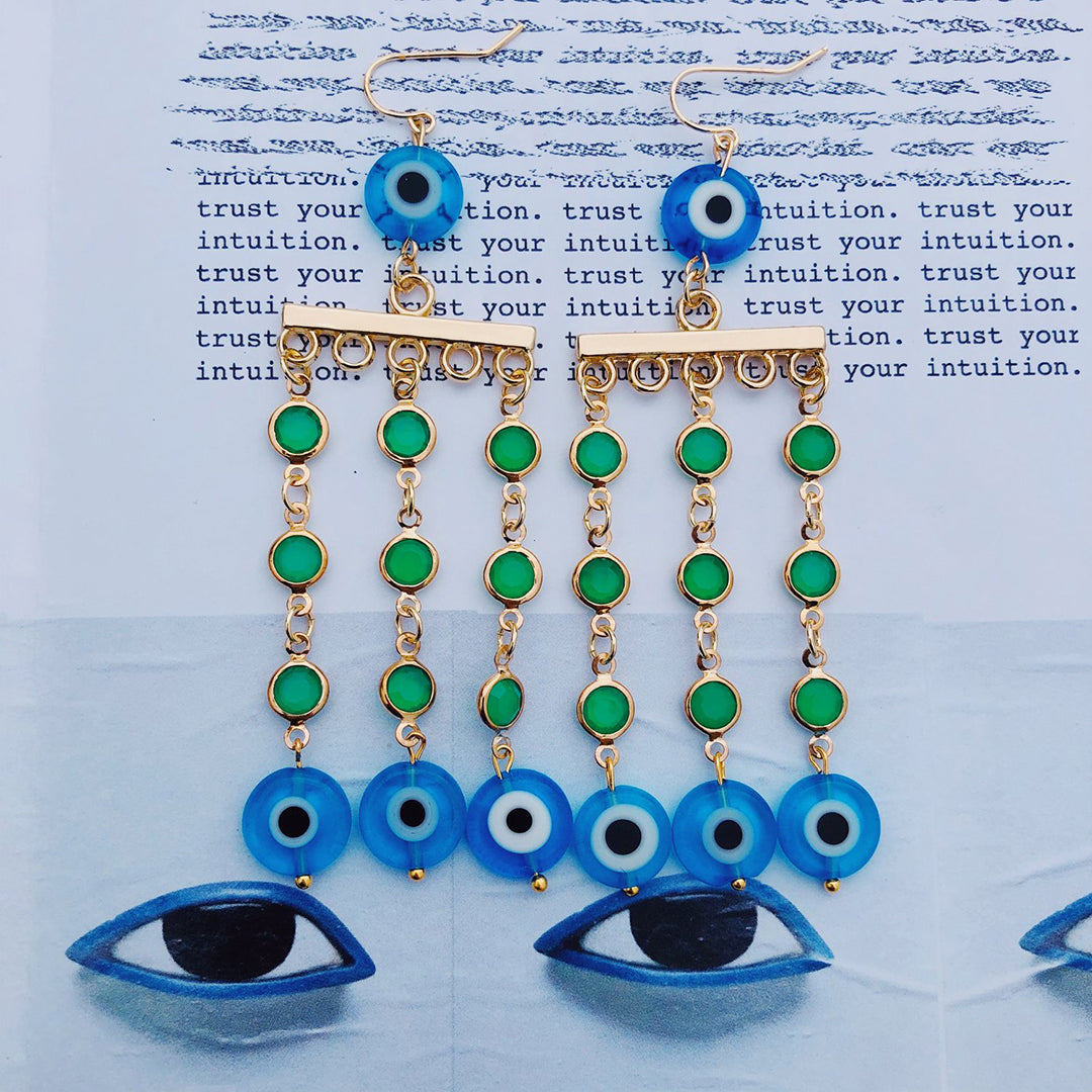 Gold plated hardware, beaded eyes, green faceted gemstone.