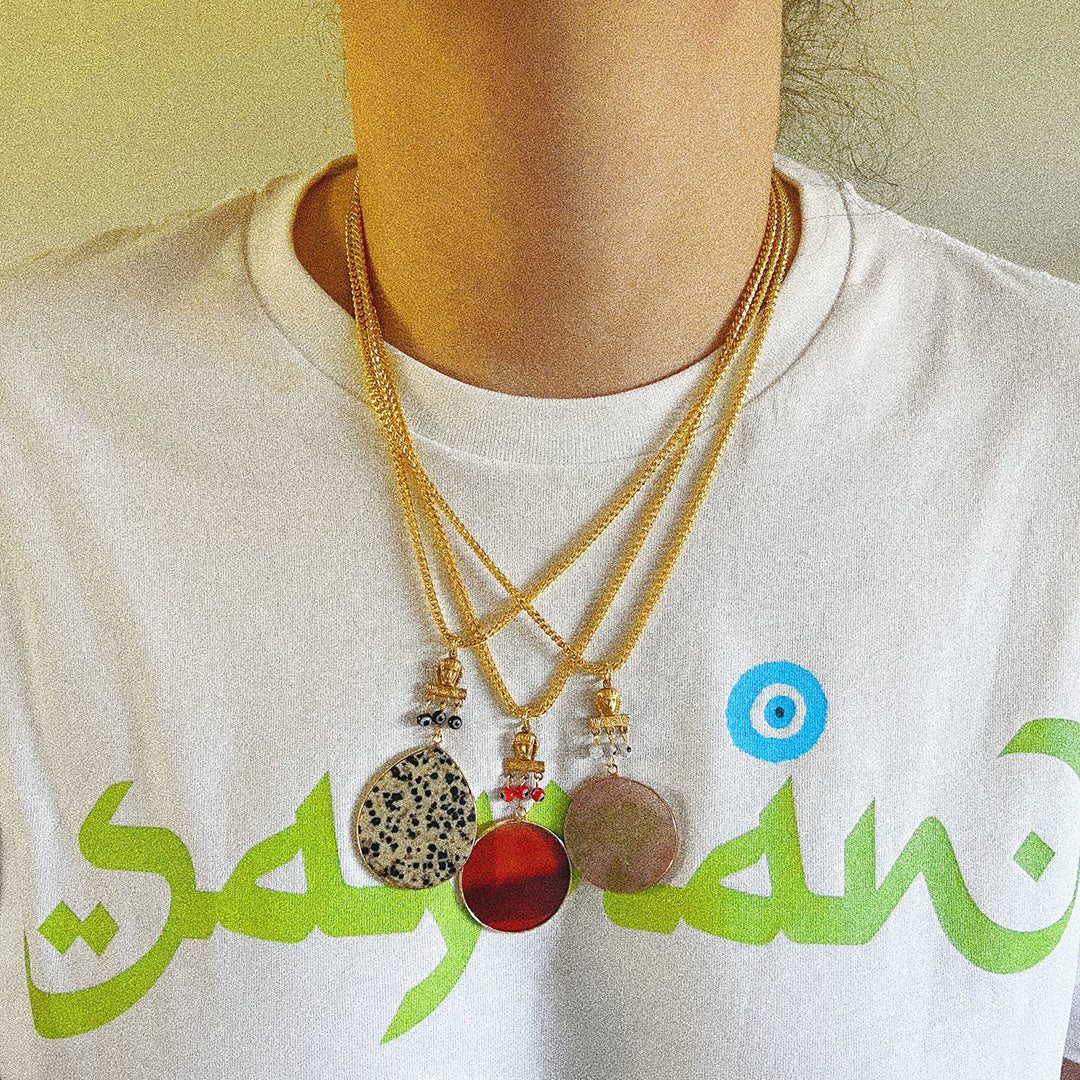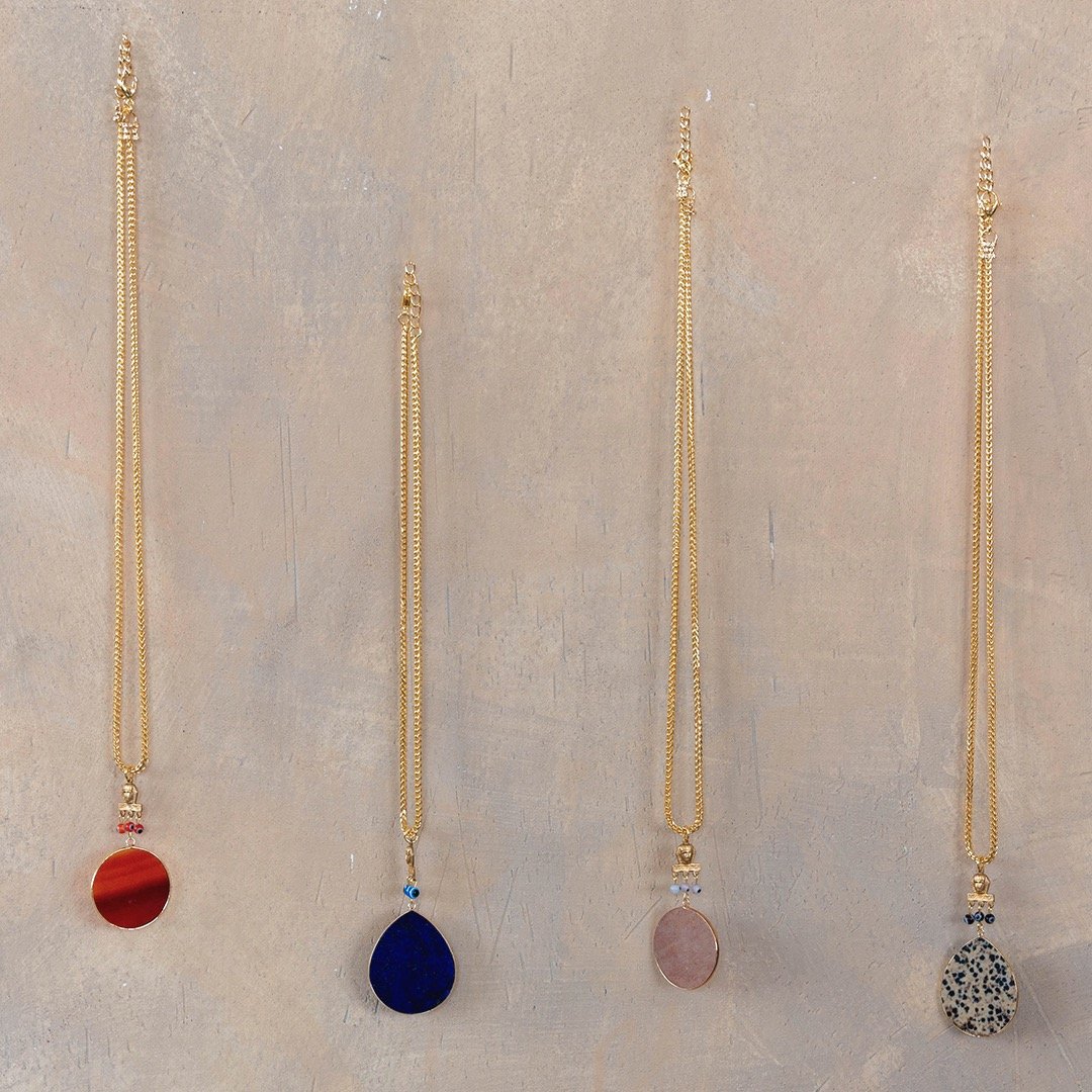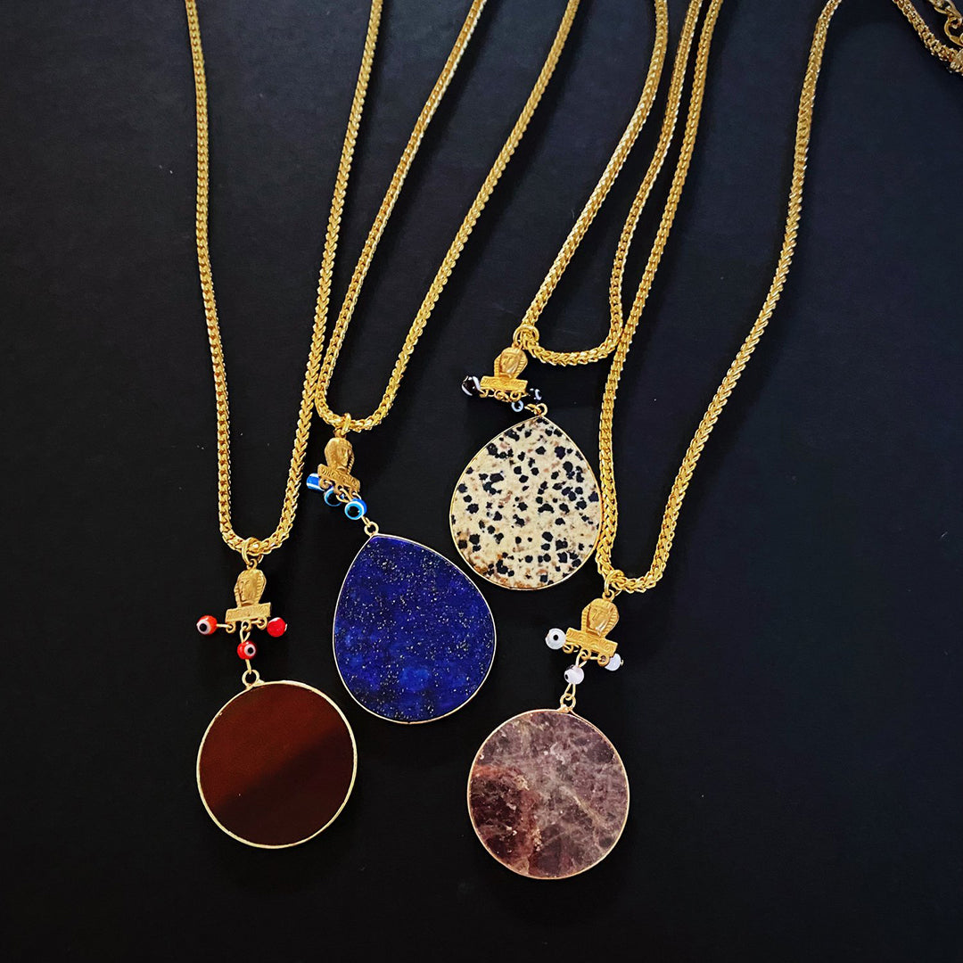 Gold plated stainless steel chain, findings and hardware, 19 inch chain with extensions, vintage pharoah head made of raw brass, gold plated bezel on all four styles of CARNELIAN, LAPIS LAZULI, STRAWBERRY QUARTZ AND DALMATIAN JASPER gemstone pendants.