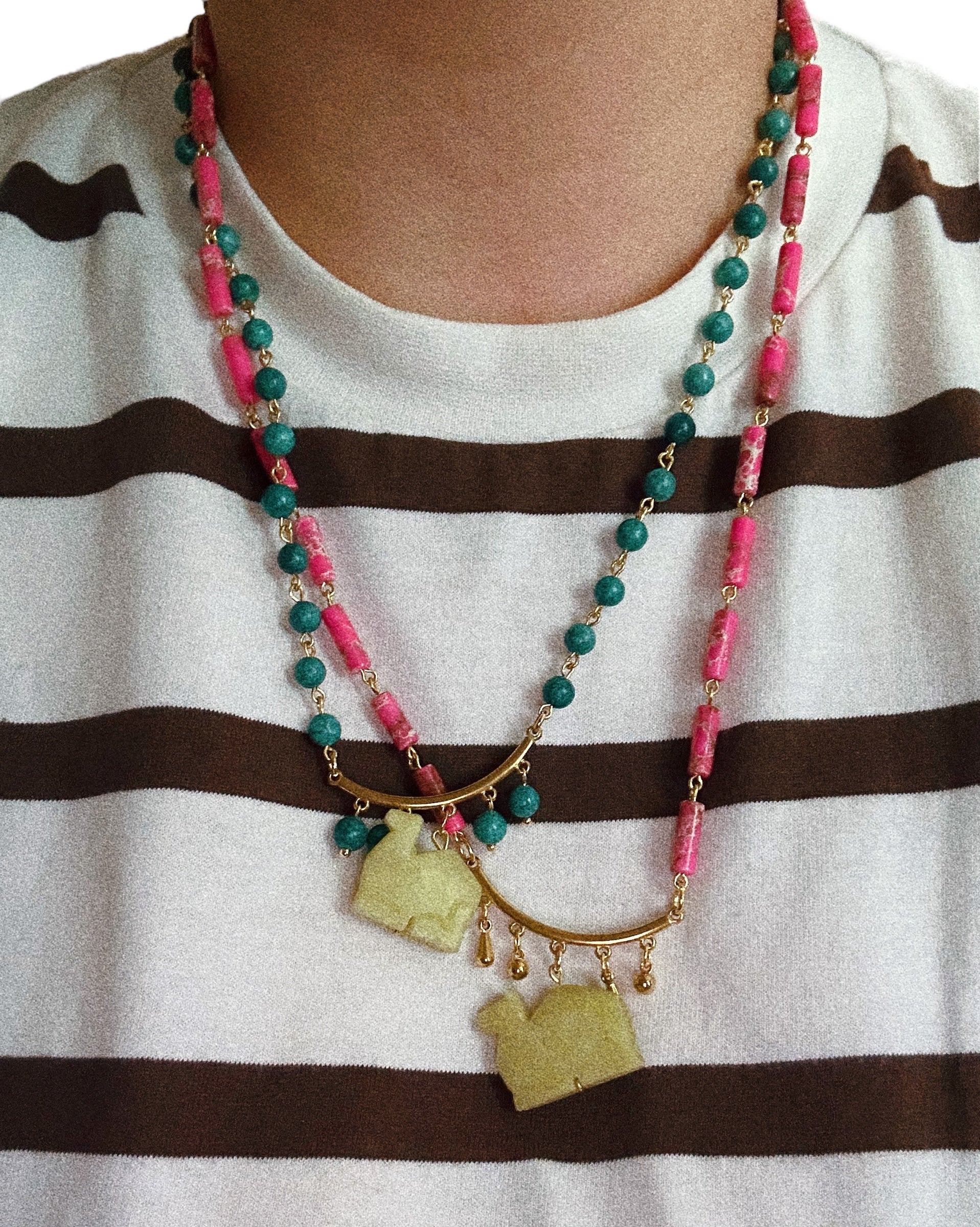 Gold plated stainless steel hardware and findings, pink beading is 22" and teal beading is 20.5".
