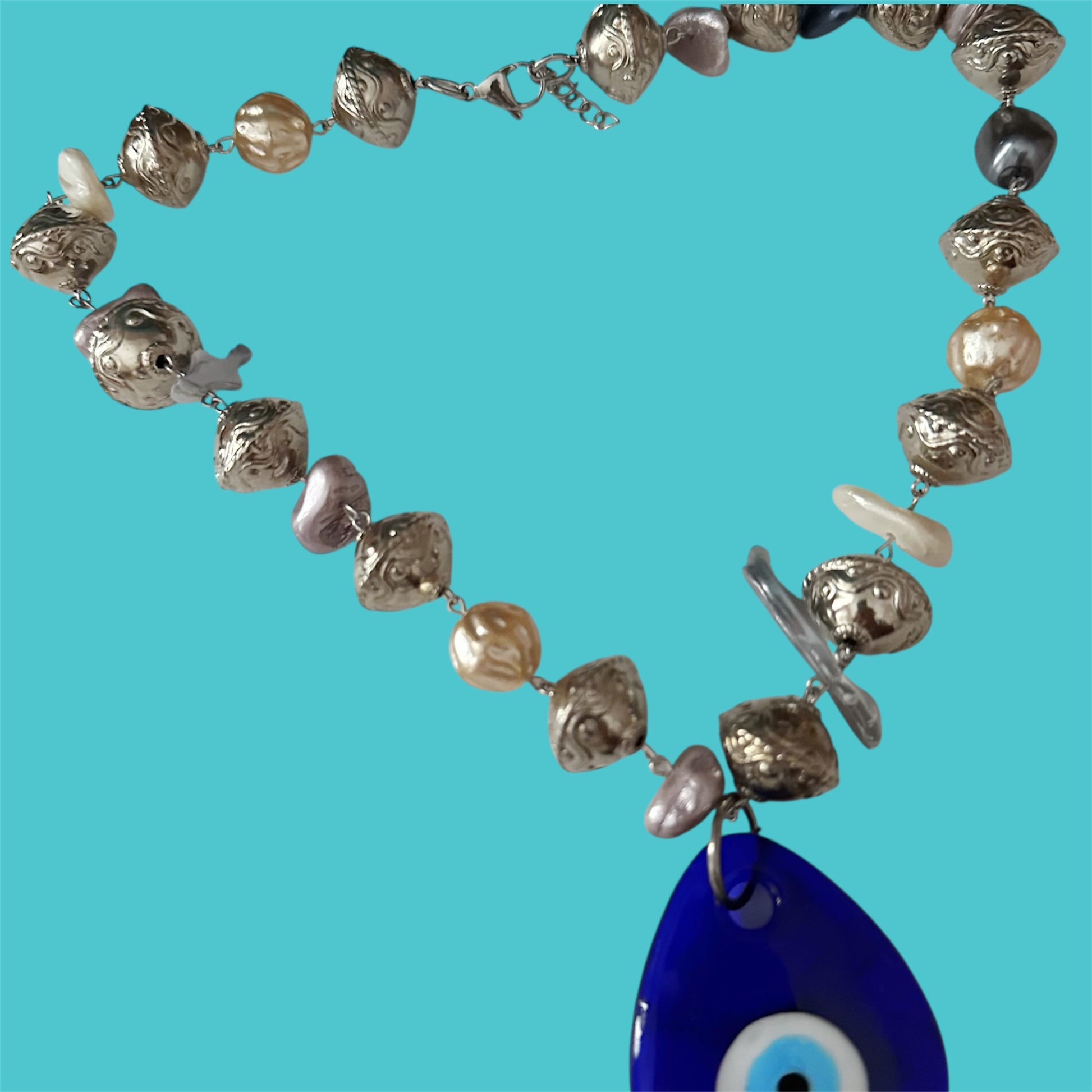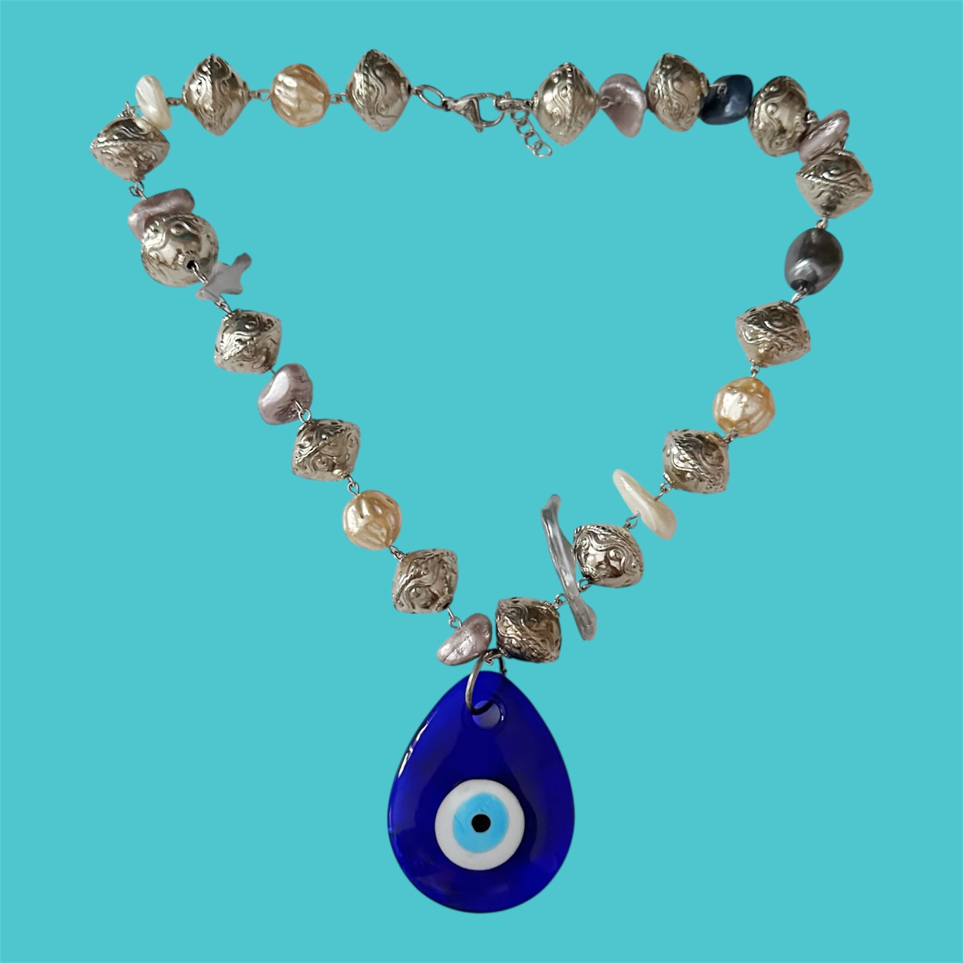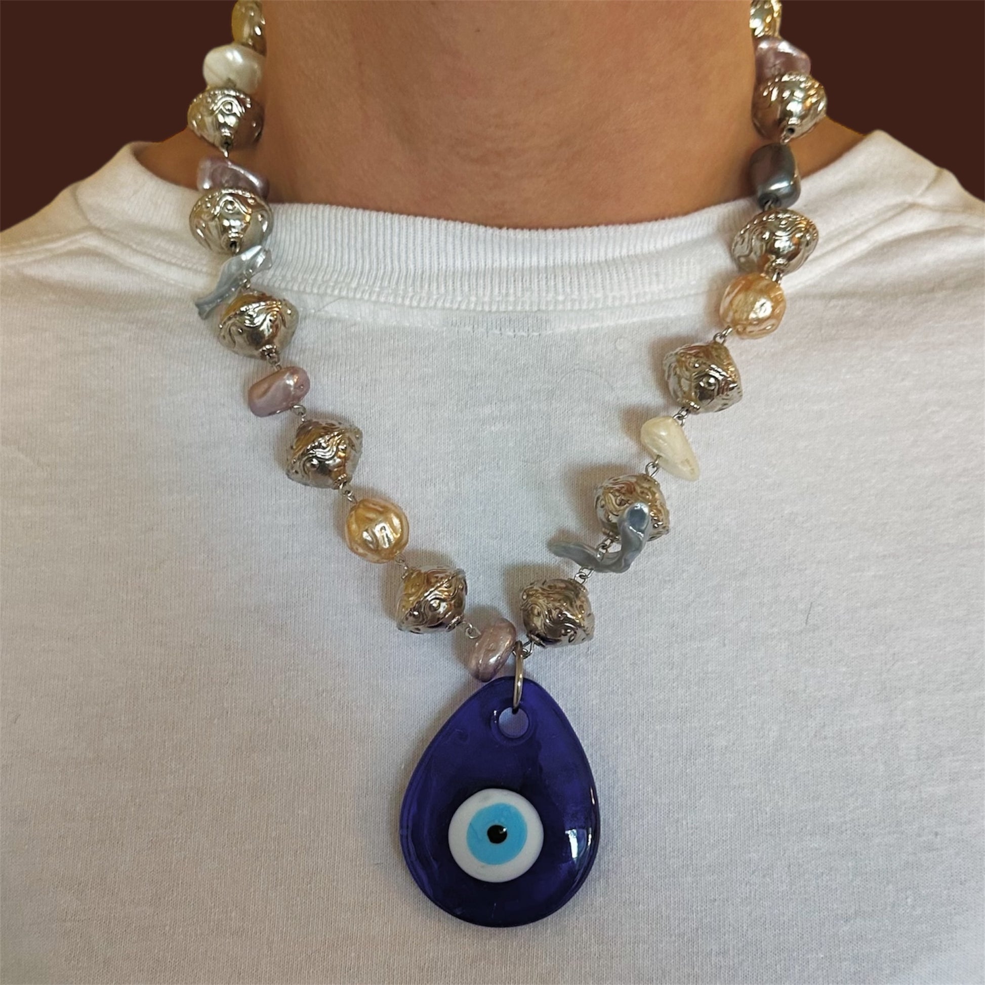 19" beaded chain, silver plated details, pearlized glass and metal beads throughout, glass teardrop evil eye pendant.
