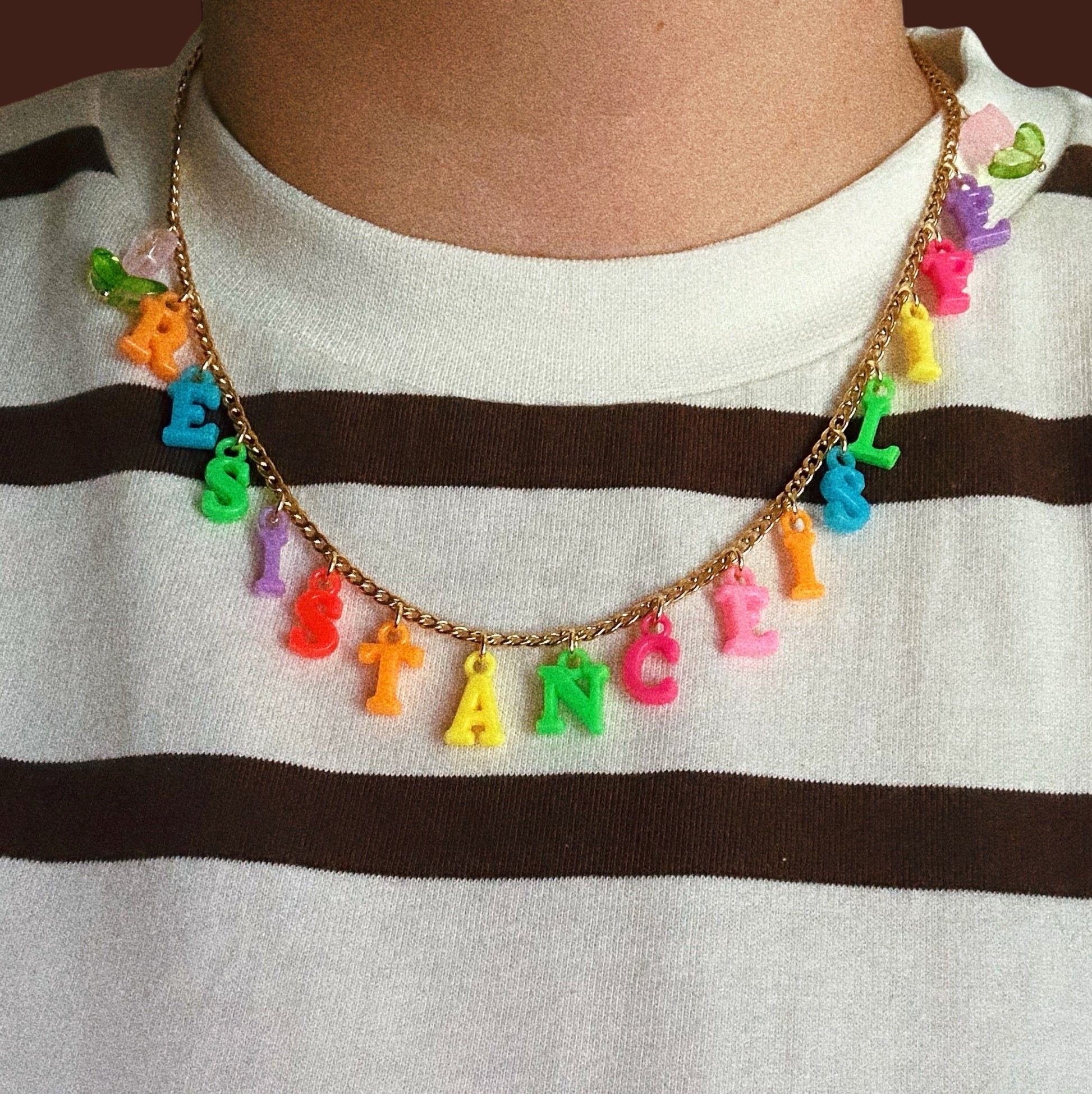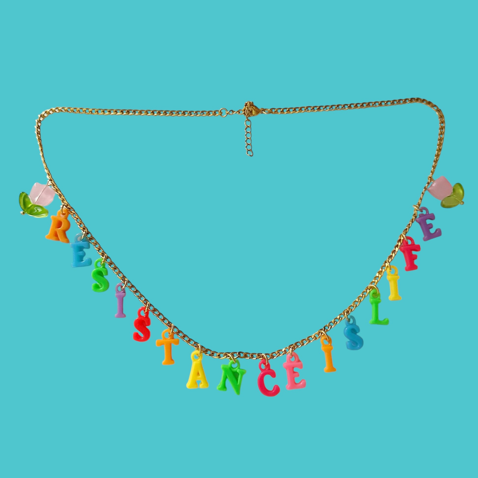 Style 1 - Resistance Is Life, 17.5" stainless steel chain and hardware, acrylic letters, tulip beads.