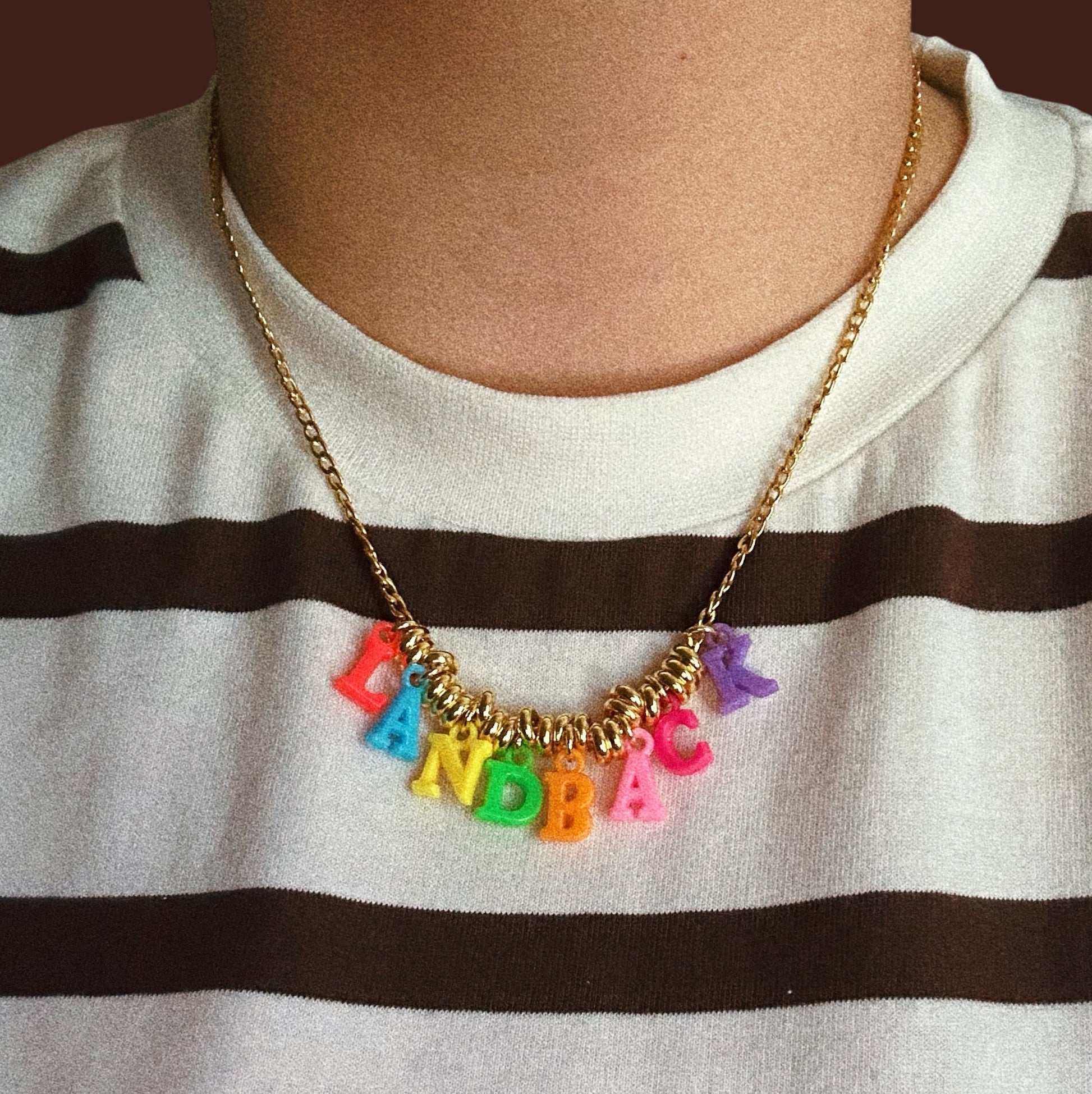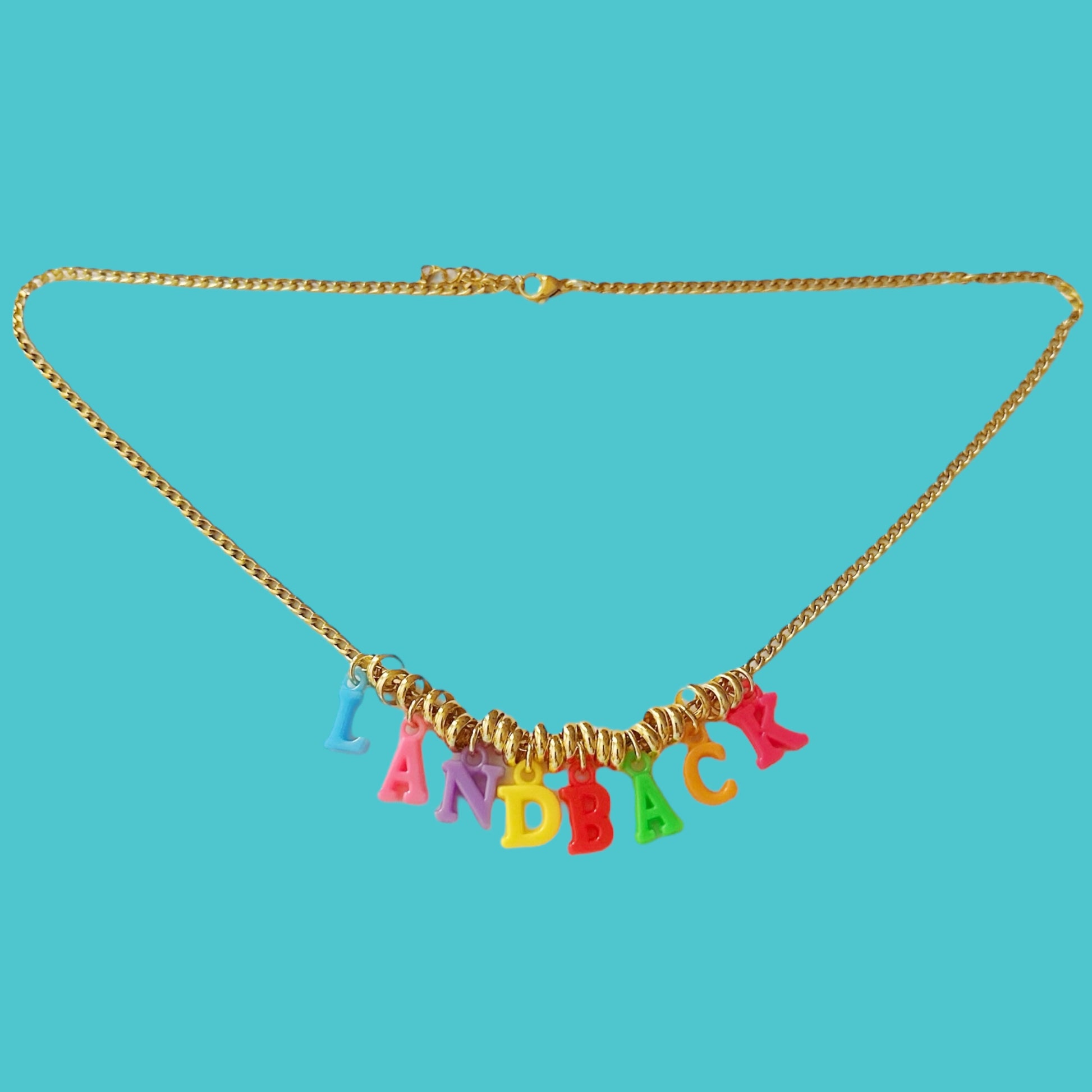 Style 5 - Land Back, 17" gold plated stainless steel chain, hardware and spacers, acrylic letters.