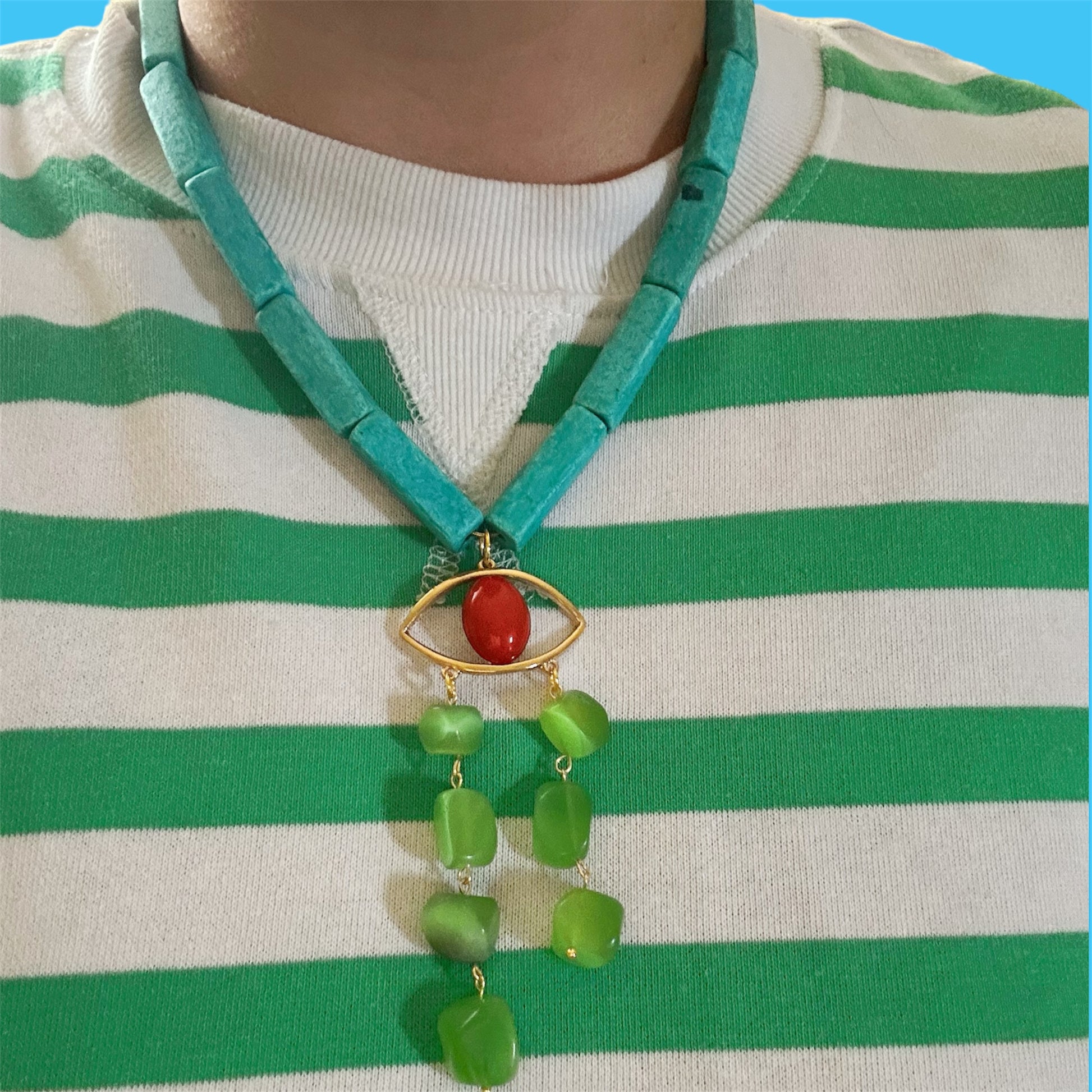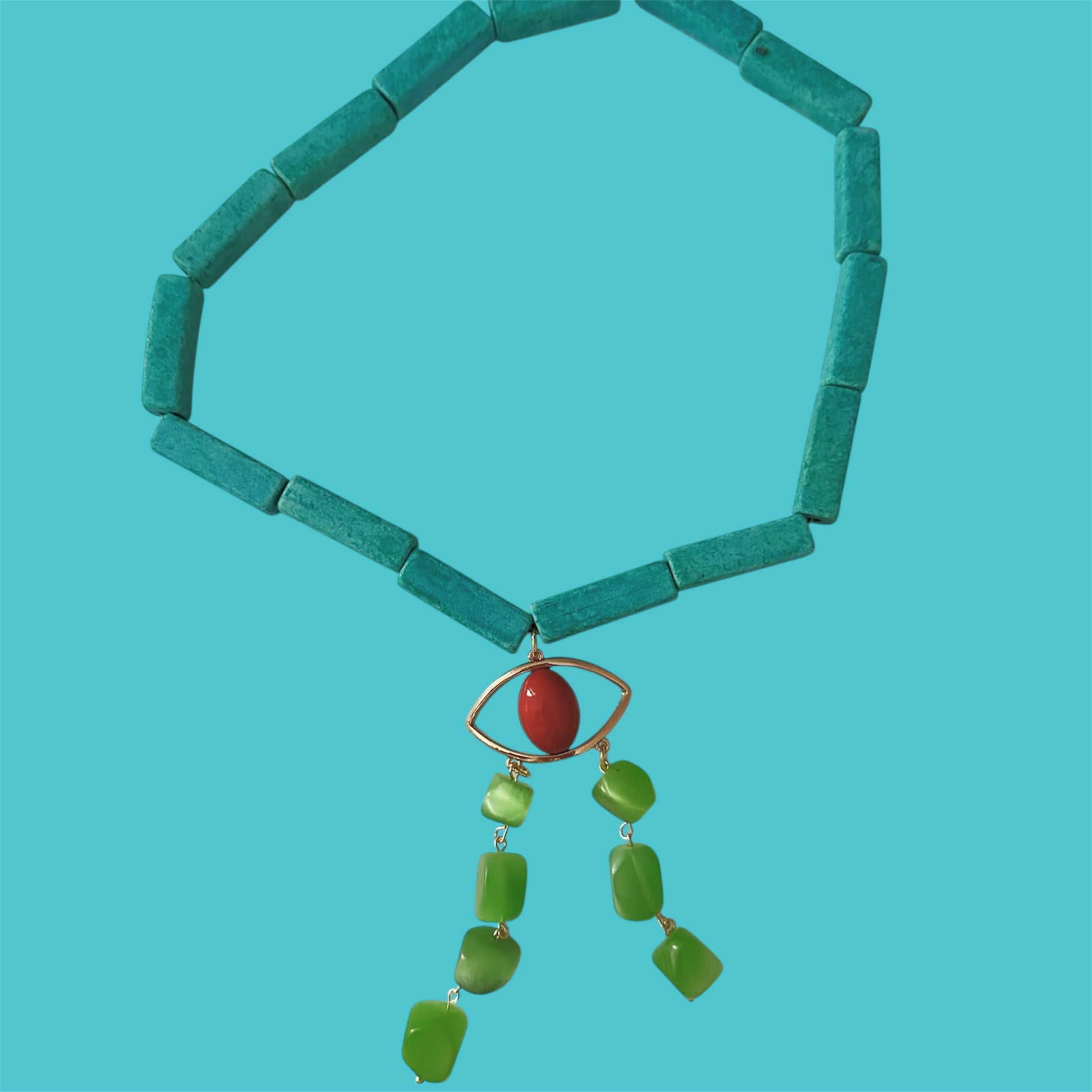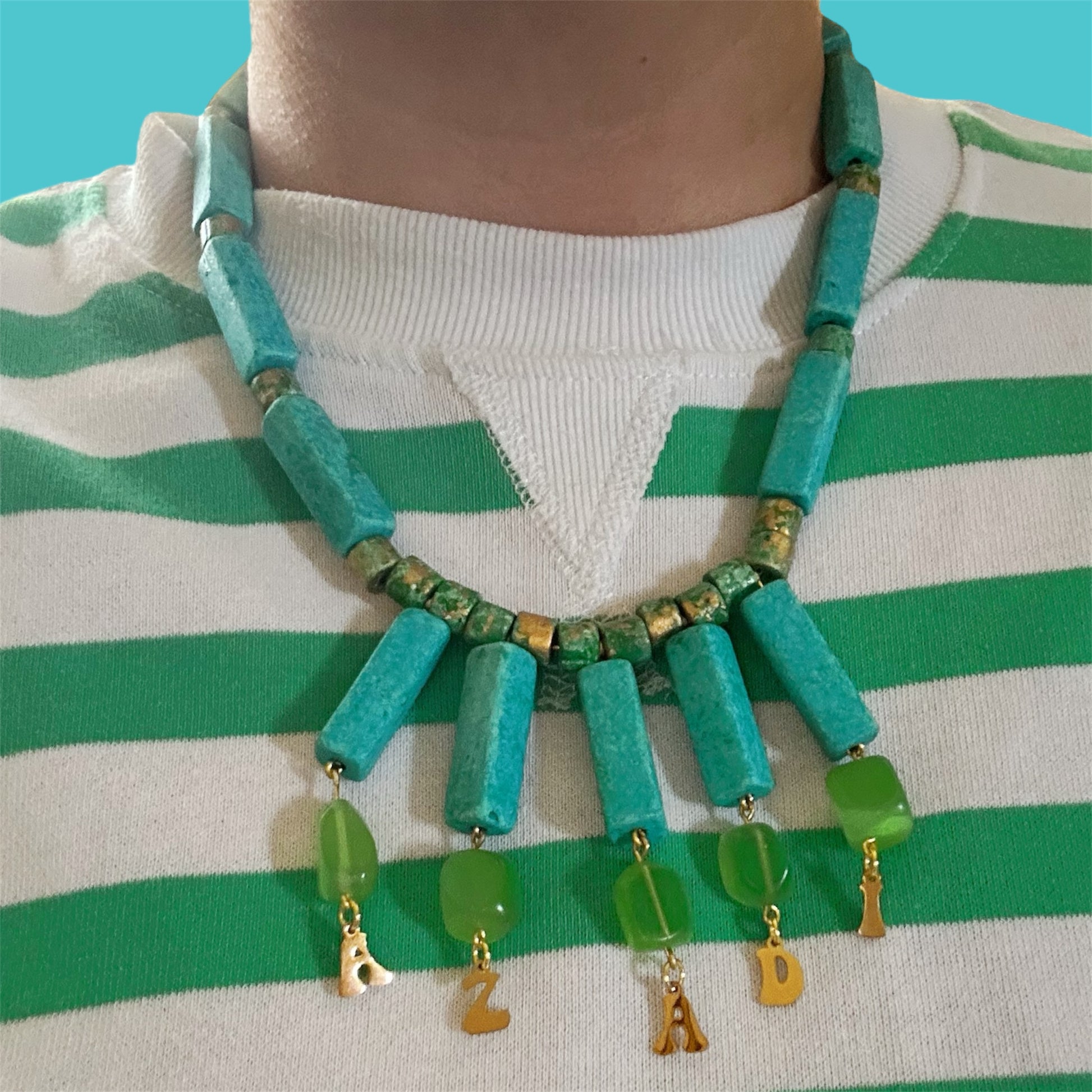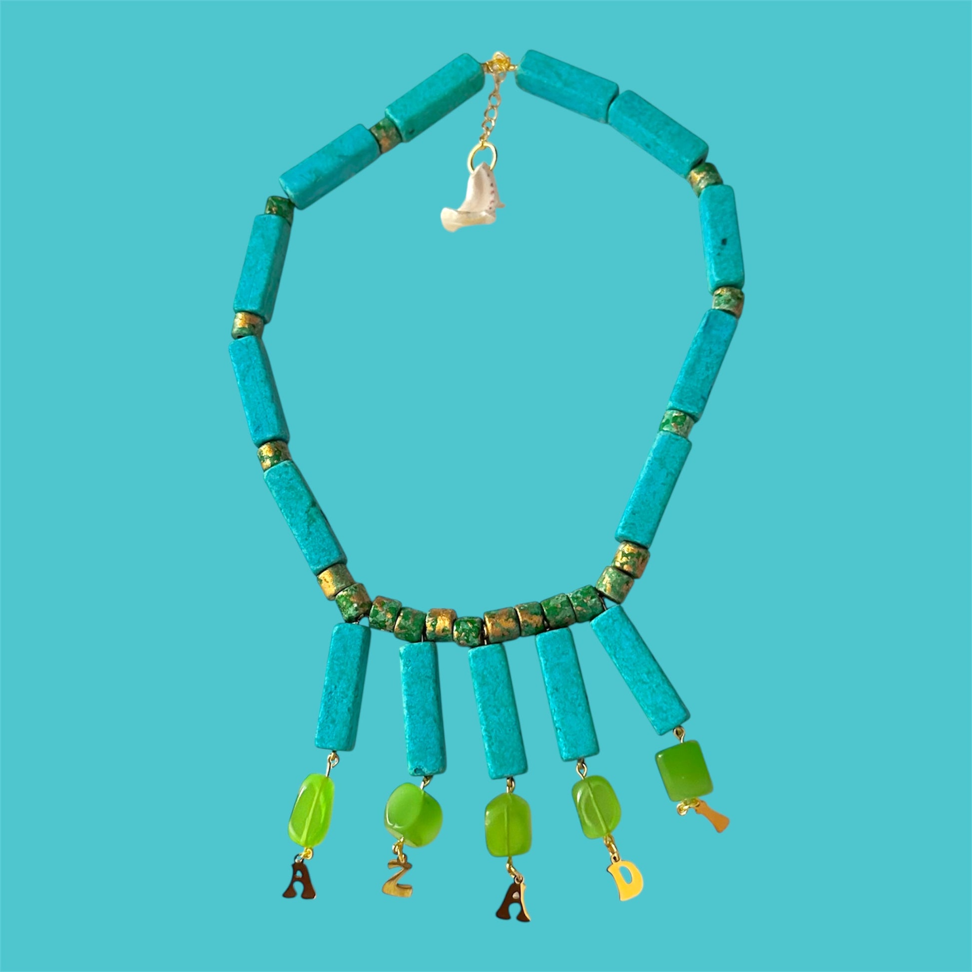 18", ceramic and glass beading, gold plated stainless steel hardware and AZADI lettering.