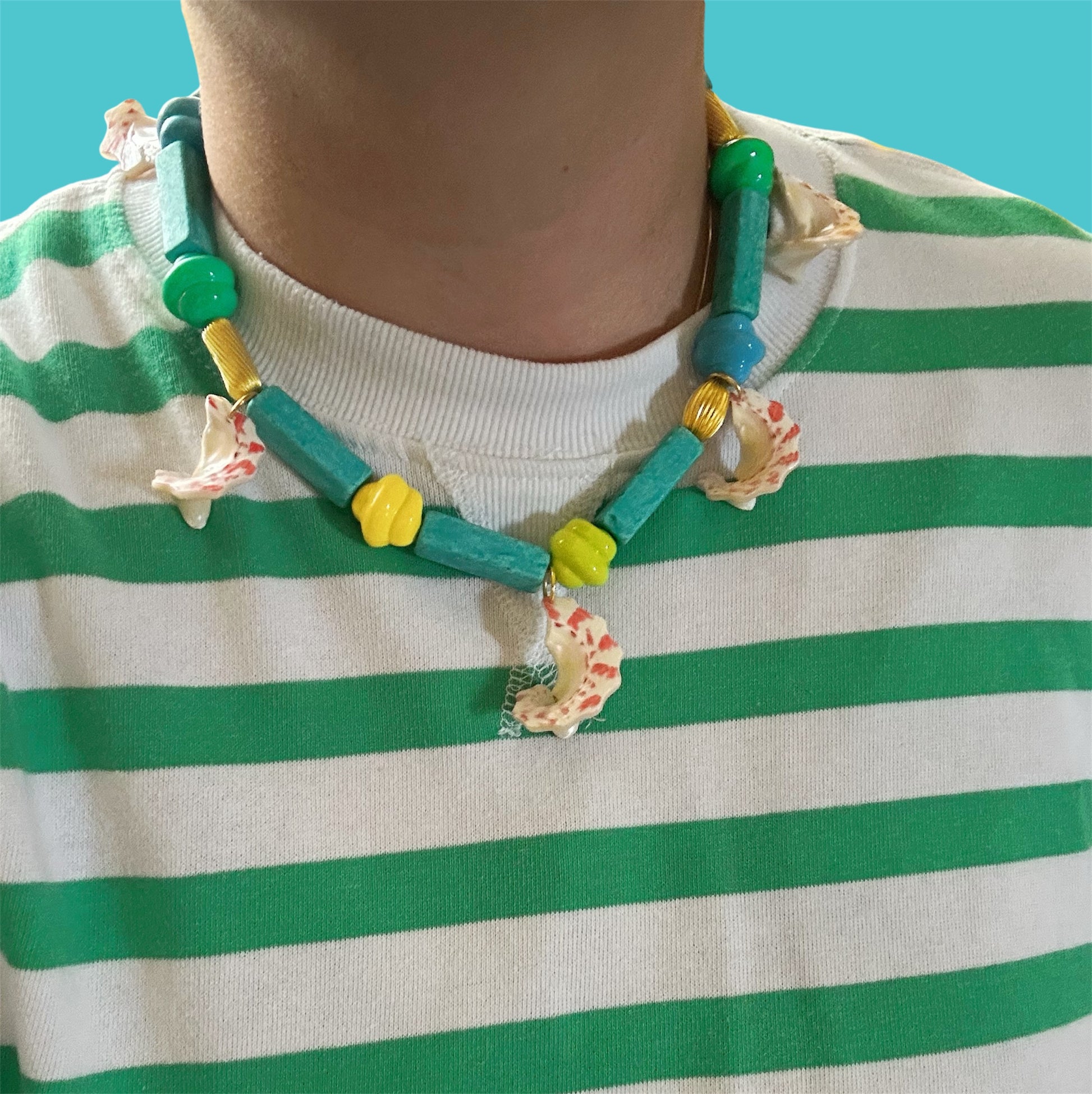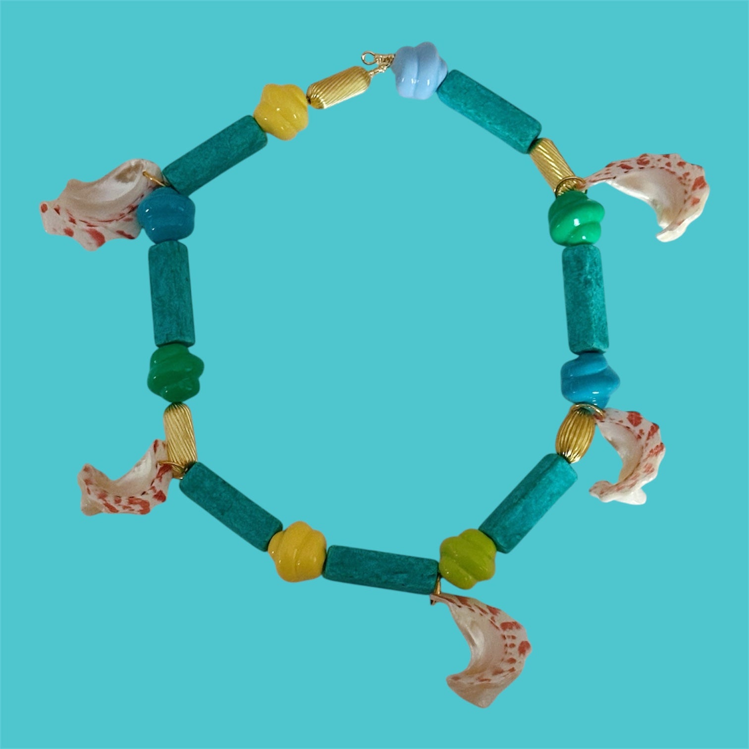 17", gold plated stainless steel hardware, shell pendants, glass, acrylic and ceramic beading.