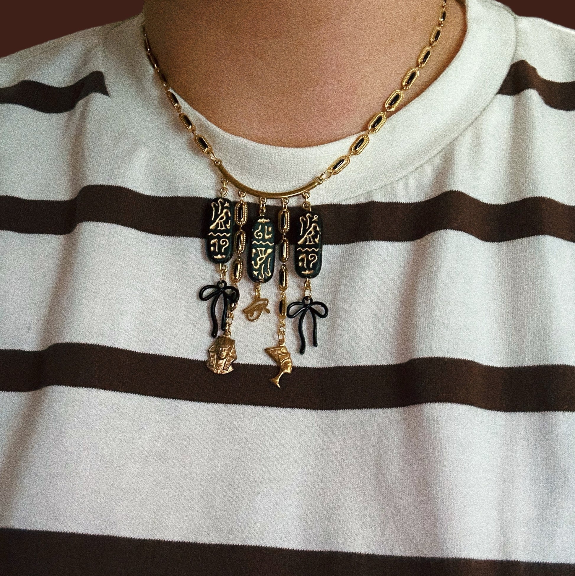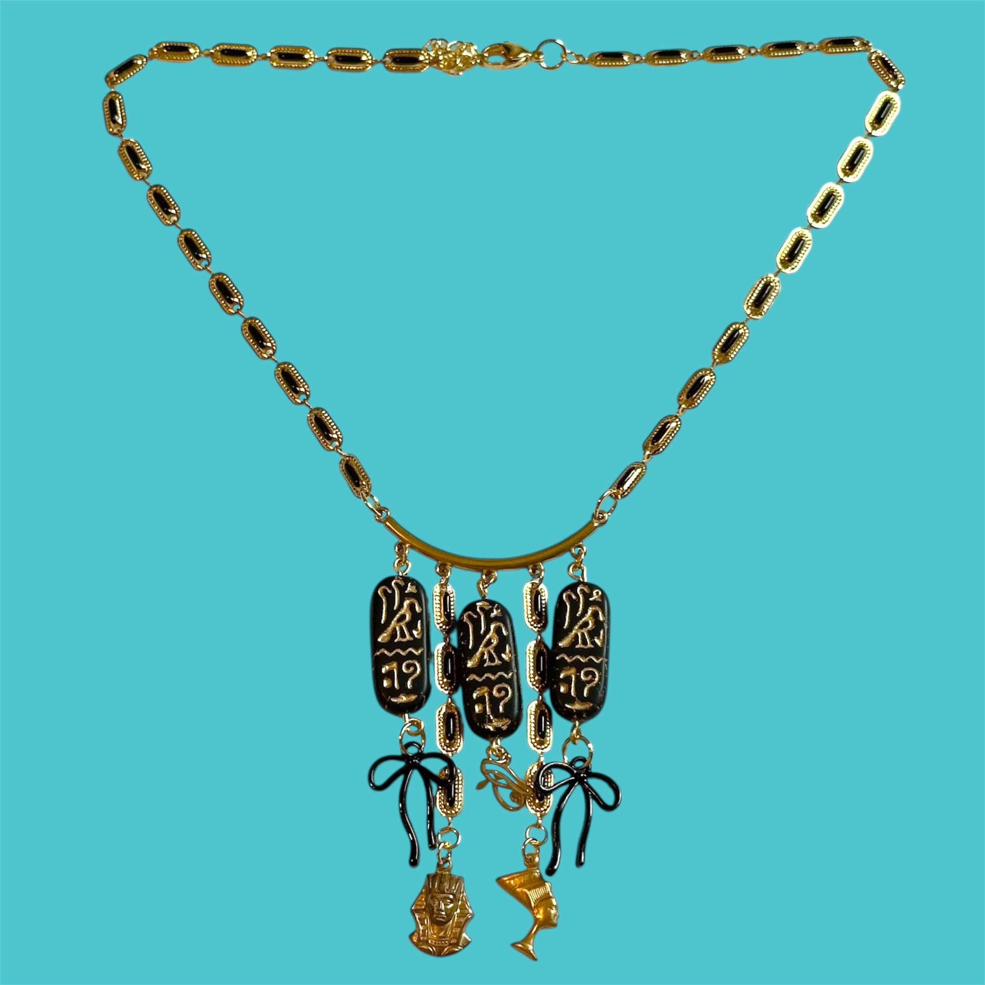 14.5" gold plated stainless steel throughout, vintage cartouche and charms.