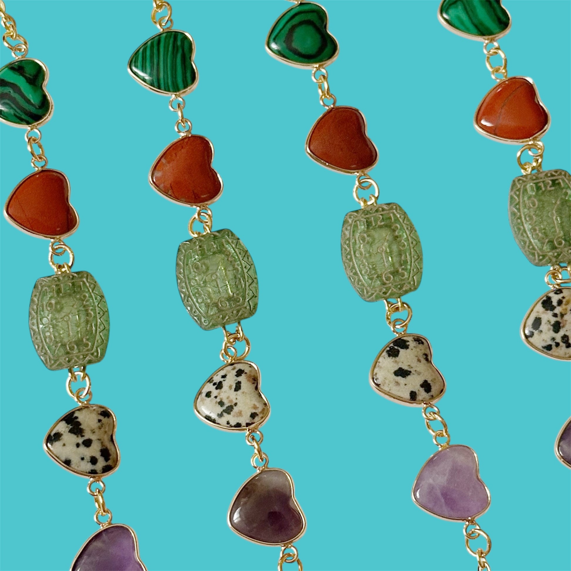 6.5" gold plated heart stone charms and gold plated stainless steel chain/hardware, vintage light green watch face pendant. Happy to make any length just let me know at notes at checkout what wrist size works best for you.