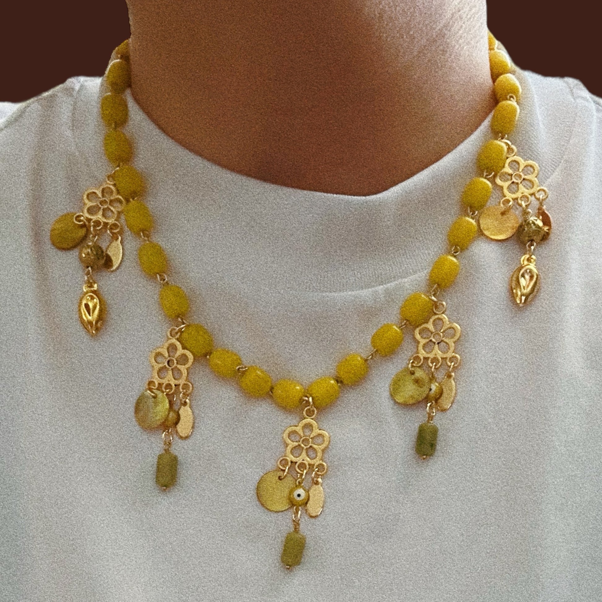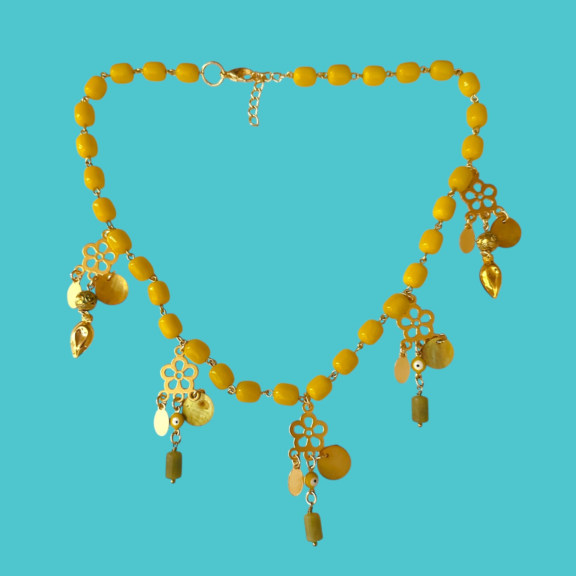 18" beaded chain with gold plated matte flower charms, shell round discs, gold plated stainless steel hardware.